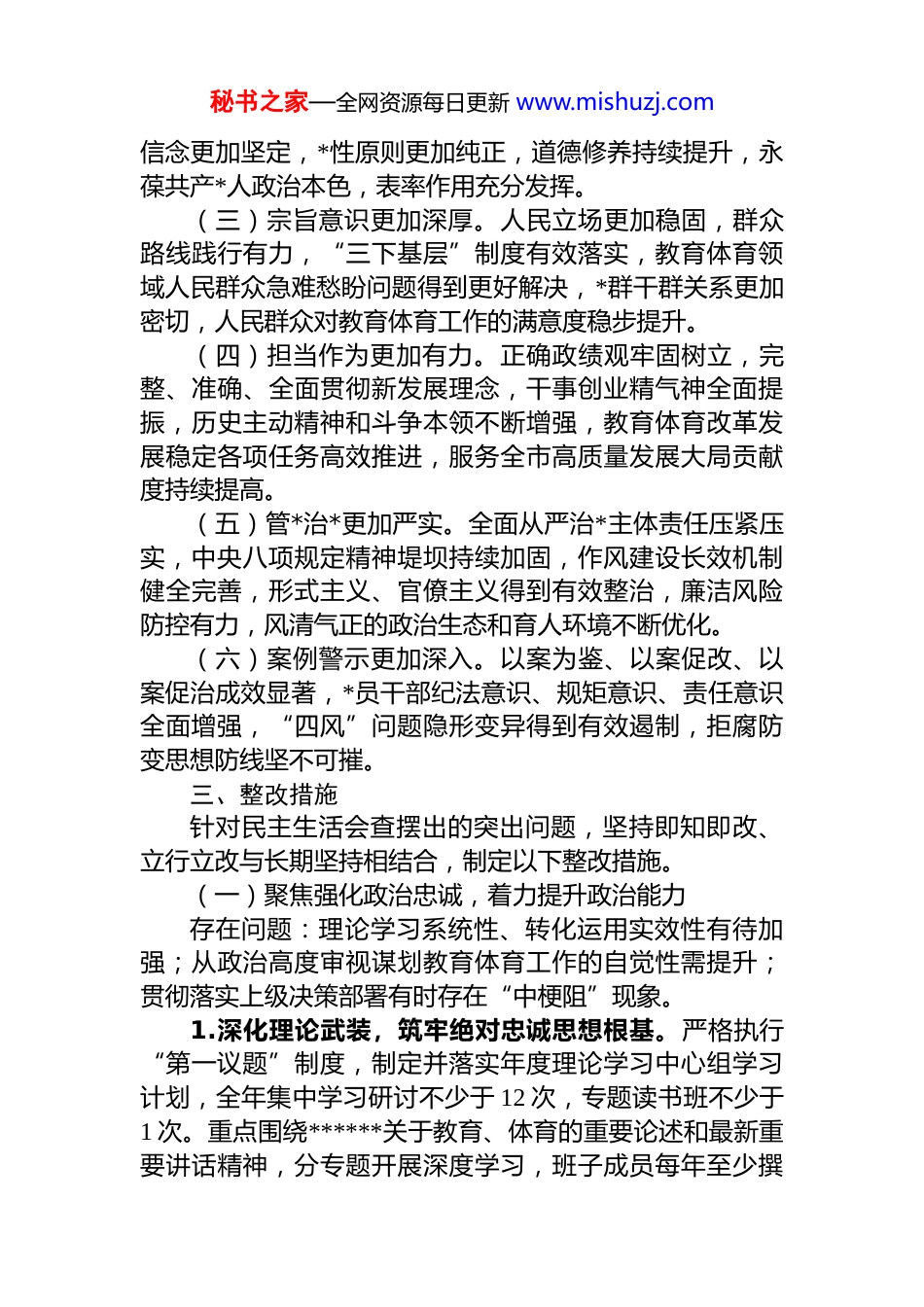 秘书之家—全网资源每日更新 www.mishuzj.com2025 年度市教育体育局民主生活会查摆问题整改方案为扎实做好 2025 年度市教育体育局民主生活会查摆问题整改工作,切实将民主生活会成果转化为推动全市教育体育事业高质量发展的强大动力,针对会前征求意见建议会上对照检查和相互批评指出的突出问题,结合工作实际制定本整改方案。一、指导思想坚持以**************思想为指导,全面贯彻落实*的二十大和二十届历次全会精神,深刻领悟“两个确立”的决定性意义,增强“四个意识”、坚定“四个自信”、做到“两个维护”。聚焦民主生活会查摆出的突出问题,以高度的政治自觉、思想自觉和行动自觉,坚持问题导向、目标导向、结果导向相统一,发扬自我革命精神,压实整改责任,明确整改时限,细化整改措施,确保问题整改见底清零。通过整改,进一步提升局领导班子及成员的政治能力、*性修养、宗旨意识、担当精神和管*治*水平,团结带领全市教育体育系统广大干部职工,奋力谱写新时代新征程我市教育体育事业发展新篇章。二、整改目标(一)政治忠诚更加牢固。局领导班子及成员政治判断力、政治领悟力、政治执行力显著增强,始终在政治立场、政治方向、政治原则、政治道路上同以***同志为核心的*中央保持高度一致,确保*中央决策部署和省委、市委工作要求在全市教育体育系统不折不扣落地生根。(二)*性根基更加坚实。*的创新理论武装走深走实,世界观、人生观、价值观这个“总开关”拧得更紧,理想秘书之家—全网资源每日更新 www.mishuzj.com信念更加坚定,*性原则更加纯正,道德修养持续提升,永葆共产*人政治本色,表率作用充分发挥。(三)宗旨意识更加深厚。人民立场更加稳固,群众路线践行有力,“三下基层”制度有效落实,教育体育领域人民群众急难愁盼问题得到更好解决,*群干群关系更加密切,人民群众对教育体育工作的满意度稳步提升。(四)担当作为更加有力。正确政绩观牢固树立,完整、准确、全面贯彻新发展理念,干事创业精气神全面提振,历史主动精神和斗争本领不断增强,教育体育改革发展稳定各项任务高效推进,服务全市高质量发展大局贡献度持续提高。(五)管*治*更加严实。全面从严治*主体责任压紧压实,中央八项规定精神堤坝持续加固,作风建设长效机制健全完善,形式主义、官僚主义得到有效整治,廉洁风险防控有力,风清气正的政治生态和育人环境不断优化。(六)案例警示更加深入。以案为鉴、以案促改、以案促治成效显著,*员干部纪法意识、规矩意识、责任意识全面增强,“四风”问题隐形变异得到有效遏制,拒腐防变思想防线坚不可摧。三、整改措施针对民主生活会查摆出的突出问题,坚持即知即改、立行立改与长期坚持相结合,制定以下整改措施。(一)聚焦强化政治忠诚,着力提升政治能力存在问题:理论学习系统性、转化运用实效性有待加强;从政治高度审视谋划教育体育工作的自觉性需提升;贯彻落实上级决策部署有时存在“中梗阻”现象。1.深化理论武装,筑牢绝对忠诚思想根基。严格执行“第一议题”制度,制定并落实年度理论学习中心组学习计划,全年集中学习研讨不少于 12 次,专题读书班不少于1 次。重点围绕******关于教育、体育的重要论述和最新重要讲话精神,分专题开展深度学习,班子成员每年至少撰秘书之家—全网资源每日更新 www.mishuzj.com写 2 篇高质量学习心得或调研报告。建立理论学习转化应用清单,将学习成果转化为谋划推动区域教育优质均衡发展深化新时代教育评价改革、体教融合促进青少年健康成长构建高水平全民健身公共服务体系的具体政策、项目和创新举措,每季度评估一次转化成效。强化对机关各科室、直属单位(学校)理论学习的指导和督查,确保*的创新理论在全市教育体育系统一贯到底。2.锤炼政治能力,把准事业发展正确方向。局主要负责人带头,班子成员自觉加强政治能力训练和政治实践历练。定期组织班子成员围绕“国之大者”、省委部署、市委中心工作,结合教育体育职能开展政治能力专题研讨,每年至少 2 次。建立健全重大决策前政治对标对表机制,凡涉及发展战略、重大改革、重点项目、重要政策制定等,首先进行政治把关,确...