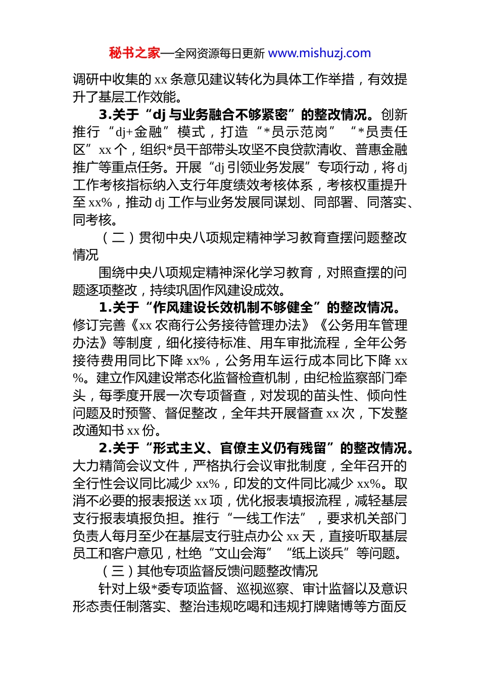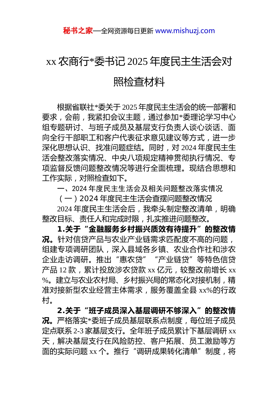 秘书之家—全网资源每日更新 www.mishuzj.comxx 农商行*委书记 2025 年度民主生活会对照检查材料根据省联社*委关于 2025 年度民主生活会的统一部署和要求,会前,我紧扣会议主题,通过参加*委理论学习中心组专题研讨、与班子成员及基层支行负责人谈心谈话、面向全行干部职工和客户代表征求意见建议等方式,进一步深化思想认识、找准问题症结。同时,对 2024 年度民主生活会整改落实情况、中央八项规定精神贯彻执行情况、专项监督反馈问题整改情况等进行全面梳理。现结合思想和工作实际,对照检查如下。一、2024 年度民主生活会及相关问题整改落实情况(一)2024 年度民主生活会查摆问题整改情况2024 年度民主生活会后,我牵头制定整改清单,明确整改目标、责任人和完成时限,扎实推进问题整改。1.关于“金融服务乡村振兴质效有待提升”的整改情况。针对信贷产品与农业产业链需求匹配度不高的问题,组建专项调研团队,深入县域各乡镇、农业合作社和涉农企业走访调研。推出“惠农贷”“产业链贷”等特色信贷产品 12 款,累计投放涉农贷款 xx 亿元,较整改前增长 xx%。建立与农业农村局、乡村振兴局的常态化对接机制,精准对接新型农业经营主体需求,服务覆盖全县 xx%的行政村。2.关于“班子成员深入基层调研不够深入”的整改情况。严格落实*委班子成员基层联系点制度,每位班子成员定点联系 2-3 家基层支行。全年班子成员累计下基层调研 xx天,解决基层支行在风险防控、客户拓展、员工激励等方面的实际问题 xx 个。推行“调研成果转化清单”制度,将秘书之家—全网资源每日更新 www.mishuzj.com调研中收集的 xx 条意见建议转化为具体工作举措,有效提升了基层工作效能。3.关于“dj 与业务融合不够紧密”的整改情况。创新推行“dj+金融”模式,打造“*员示范岗”“*员责任区”xx 个,组织*员干部带头攻坚不良贷款清收、普惠金融推广等重点任务。开展“dj 引领业务发展”专项行动,将 dj工作考核指标纳入支行年度绩效考核体系,考核权重提升至 xx%,推动 dj 工作与业务发展同谋划、同部署、同落实、同考核。(二)贯彻中央八项规定精神学习教育查摆问题整改情况围绕中央八项规定精神深化学习教育,对照查摆的问题逐项整改,持续巩固作风建设成效。1.关于“作风建设长效机制不够健全”的整改情况。修订完善《xx 农商行公务接待管理办法》《公务用车管理办法》等制度,细化接待标准、用车审批流程,全年公务接待费用同比下降 xx%,公务用车运行成本同比下降 xx%。建立作风建设常态化监督检查机制,由纪检监察部门牵头,每季度开展一次专项督查,对发现的苗头性、倾向性问题及时预警、督促整改,全年共开展督查 xx 次,下发整改通知书 xx 份。2.关于“形式主义、官僚主义仍有残留”的整改情况。大力精简会议文件,严格执行会议审批制度,全年召开的全行性会议同比减少 xx%,印发的文件同比减少 xx%。取消不必要的报表报送 xx 项,优化报表填报流程,减轻基层支行报表填报负担。推行“一线工作法”,要求机关部门负责人每月至少在基层支行驻点办公 xx 天,直接听取基层员工和客户意见,杜绝“文山会海”“纸上谈兵”等问题。(三)其他专项监督反馈问题整改情况针对上级*委专项监督、巡视巡察、审计监督以及意识形态责任制落实、整治违规吃喝和违规打牌赌博等方面反秘书之家—全网资源每日更新 www.mishuzj.com馈的问题,逐一制定整改措施,确保整改到位。1.专项监督反馈金融风险防控短板问题整改。聚焦信贷风险、操作风险、流动性风险等重点领域,完善风险预警体系,建立客户信用评级动态调整机制,对高风险客户实行名单制管理。加大不良贷款清收处置力度,通过现金清收、资产重组、司法诉讼等方式,全年累计清收不良贷款 xx 亿元,不良贷款率较年初下降 xx 个百分点。加强员工行为管理,开展员工异常行为排查 xx 次,排查出风险隐患xx 条,全部完成整改。2.意识形态责任制落实问题整改。将意识形态工作纳入*委重要议事日程,全年召开意识形态工作专题会议 xx 次,分析研判意识形态领域形势。加强对微信公众号、短视频平台等新媒...