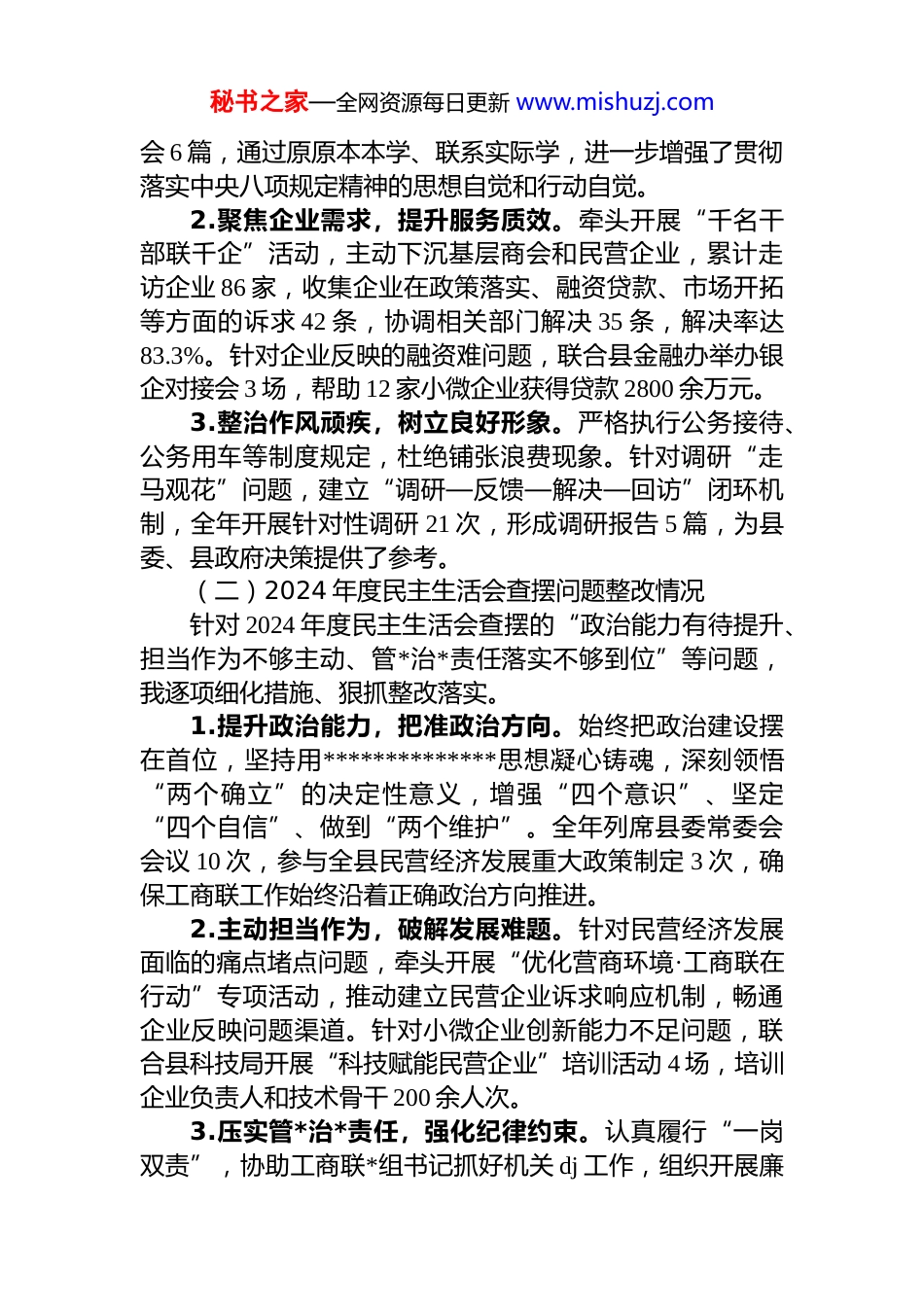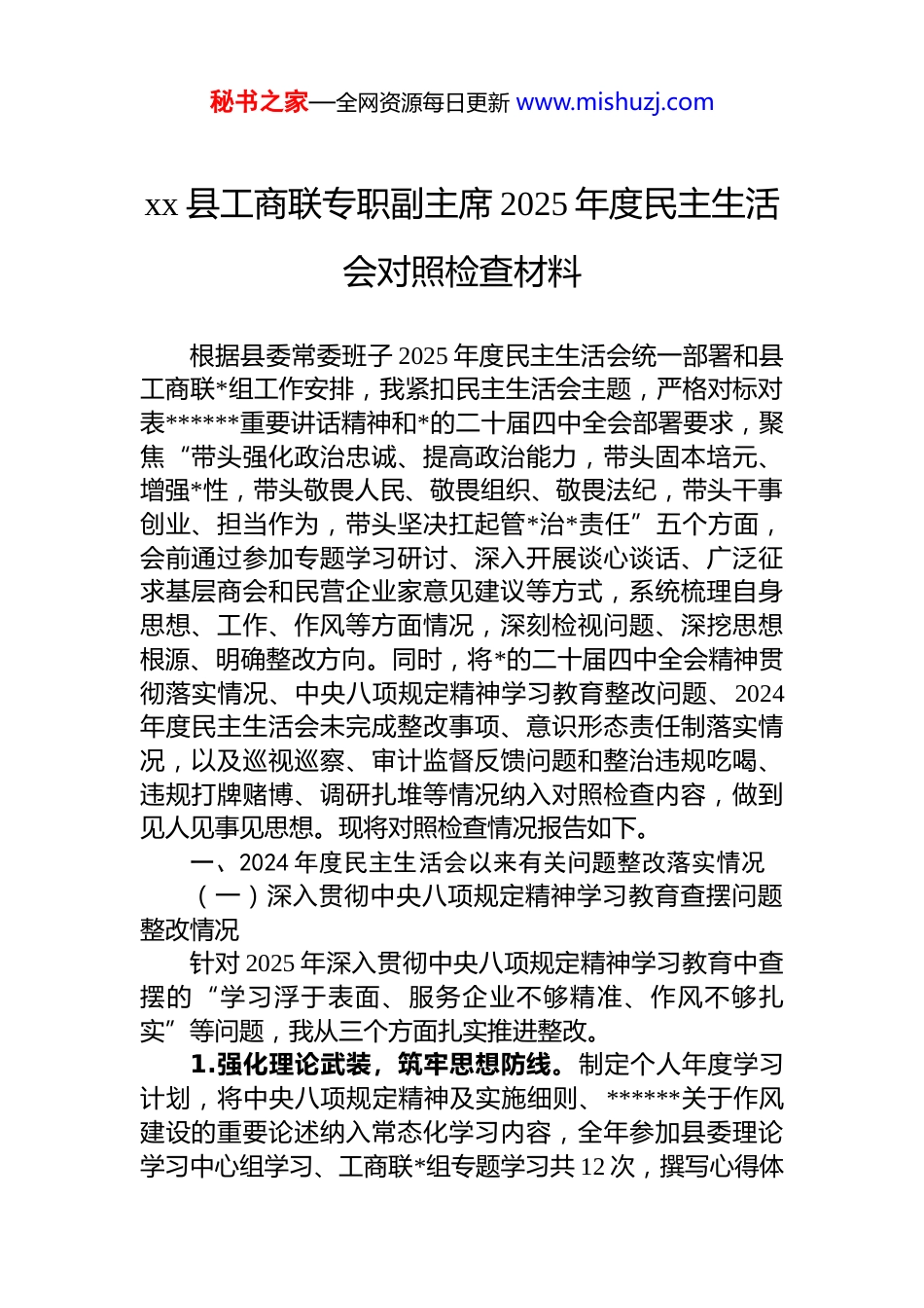 秘书之家—全网资源每日更新 www.mishuzj.comxx 县工商联专职副主席 2025 年度民主生活会对照检查材料根据县委常委班子 2025 年度民主生活会统一部署和县工商联*组工作安排,我紧扣民主生活会主题,严格对标对表******重要讲话精神和*的二十届四中全会部署要求,聚焦“带头强化政治忠诚、提高政治能力,带头固本培元、增强*性,带头敬畏人民、敬畏组织、敬畏法纪,带头干事创业、担当作为,带头坚决扛起管*治*责任”五个方面,会前通过参加专题学习研讨、深入开展谈心谈话、广泛征求基层商会和民营企业家意见建议等方式,系统梳理自身思想、工作、作风等方面情况,深刻检视问题、深挖思想根源、明确整改方向。同时,将*的二十届四中全会精神贯彻落实情况、中央八项规定精神学习教育整改问题、2024年度民主生活会未完成整改事项、意识形态责任制落实情况,以及巡视巡察、审计监督反馈问题和整治违规吃喝、违规打牌赌博、调研扎堆等情况纳入对照检查内容,做到见人见事见思想。现将对照检查情况报告如下。一、2024 年度民主生活会以来有关问题整改落实情况(一)深入贯彻中央八项规定精神学习教育查摆问题整改情况针对 2025 年深入贯彻中央八项规定精神学习教育中查摆的“学习浮于表面、服务企业不够精准、作风不够扎实”等问题,我从三个方面扎实推进整改。1.强化理论武装,筑牢思想防线。制定个人年度学习计划,将中央八项规定精神及实施细则、******关于作风建设的重要论述纳入常态化学习内容,全年参加县委理论学习中心组学习、工商联*组专题学习共 12 次,撰写心得体秘书之家—全网资源每日更新 www.mishuzj.com会 6 篇,通过原原本本学、联系实际学,进一步增强了贯彻落实中央八项规定精神的思想自觉和行动自觉。2.聚焦企业需求,提升服务质效。牵头开展“千名干部联千企”活动,主动下沉基层商会和民营企业,累计走访企业 86 家,收集企业在政策落实、融资贷款、市场开拓等方面的诉求 42 条,协调相关部门解决 35 条,解决率达83.3%。针对企业反映的融资难问题,联合县金融办举办银企对接会 3 场,帮助 12 家小微企业获得贷款 2800 余万元。3.整治作风顽疾,树立良好形象。严格执行公务接待、公务用车等制度规定,杜绝铺张浪费现象。针对调研“走马观花”问题,建立“调研—反馈—解决—回访”闭环机制,全年开展针对性调研 21 次,形成调研报告 5 篇,为县委、县政府决策提供了参考。(二)2024 年度民主生活会查摆问题整改情况针对 2024 年度民主生活会查摆的“政治能力有待提升、担当作为不够主动、管*治*责任落实不够到位”等问题,我逐项细化措施、狠抓整改落实。1.提升政治能力,把准政治方向。始终把政治建设摆在首位,坚持用**************思想凝心铸魂,深刻领悟“两个确立”的决定性意义,增强“四个意识”、坚定“四个自信”、做到“两个维护”。全年列席县委常委会会议 10 次,参与全县民营经济发展重大政策制定 3 次,确保工商联工作始终沿着正确政治方向推进。2.主动担当作为,破解发展难题。针对民营经济发展面临的痛点堵点问题,牵头开展“优化营商环境·工商联在行动”专项活动,推动建立民营企业诉求响应机制,畅通企业反映问题渠道。针对小微企业创新能力不足问题,联合县科技局开展“科技赋能民营企业”培训活动 4 场,培训企业负责人和技术骨干 200 余人次。3.压实管*治*责任,强化纪律约束。认真履行“一岗双责”,协助工商联*组书记抓好机关 dj 工作,组织开展廉秘书之家—全网资源每日更新 www.mishuzj.com政警示教育 3 次,观看警示教育片 4 部,引导机关干部知敬畏、存戒惧、守底线。加强对基层商会换届工作的指导监督,确保换届工作风清气正。截至目前,2024 年度民主生活会查摆的 12 个具体问题,已完成整改 9 个,剩余 3 个问题正在持续整改中。二、存在的主要问题对照民主生活会主题和五个方面带头要求,结合自身思想和工作实际,深入查摆梳理,主要存在以下问题。(一)带头强化政治忠诚、提高政治能力方面1.理论学习的深度和广度不足。虽然能够按时参加各类学习活动,但存在“学用脱...