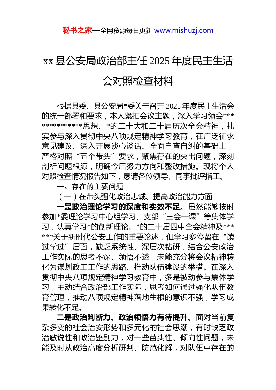 秘书之家—全网资源每日更新 www.mishuzj.comxx 县公安局政治部主任 2025 年度民主生活会对照检查材料根据县委、县公安局*委关于召开 2025 年度民主生活会的统一部署和要求,本人紧扣会议主题,深入学习领会**************思想、*的二十大和二十届历次全会精神,扎实参与深入贯彻中央八项规定精神学习教育,在广泛征求意见建议、深入开展谈心谈话、全面自查自纠的基础上,严格对照“五个带头”要求,聚焦存在的突出问题,深刻剖析问题根源,明确今后努力方向和整改措施。现将个人对照检查情况报告如下,恳请各位领导、同事批评指正。一、存在的主要问题(一)在带头强化政治忠诚、提高政治能力方面一是政治理论学习的深度和实效不足。虽然能够按时参加*委理论学习中心组学习、支部“三会一课”等集体学习,认真学习*的创新理论、*的二十届四中全会精神及******关于新时代公安工作的重要论述,但学习多停留在“读过学过”层面,缺乏系统性、深层次钻研,结合公安政治工作实际的思考不深、领悟不透,未能充分将会议精神转化为谋划政工工作的思路、推动队伍建设的举措。在深入贯彻中央八项规定精神学习教育中,多是被动参与集体学习,主动结合政治部工作实际,思考如何通过强化队伍教育管理,推动八项规定精神落地生根的意识不强,学习成果转化不足。二是政治判断力、政治领悟力有待提升。面对当前复杂多变的社会治安形势和多元化的社会思潮,有时缺乏政治敏锐性和政治鉴别力,对一些苗头性、倾向性问题,未能及时从政治高度分析研判、防范化解,对队伍中存在的秘书之家—全网资源每日更新 www.mishuzj.com一些思想波动,未能从政治忠诚的角度深入剖析根源、精准引导。例如,在处理基层民警因工作压力产生的消极情绪时,多是从人文关怀角度进行安抚,未能从“坚定政治立场、履行政治责任”的高度,引导民警深刻认识新时代公安工作的政治使命,导致思想引导的针对性、实效性不强。三是政治执行力不够坚决有力。在贯彻落实*中央关于公安工作的大政方针、上级*委和局*委的决策部署时,有时存在“上热中温下凉”的现象,对一些重点工作、硬性任务,虽然能够按时完成,但缺乏“精益求精、务求实效”的劲头,存在重部署、轻落实、轻督查的问题。例如在推动*的二十届四中全会精神在公安队伍中落地见效时,虽然制定了学习计划、组织了集中宣讲,但对基层所队学习贯彻情况的督促检查不够严格,对学习效果的评估不够科学,导致部分基层民警学习流于形式,未能真正将会议精神内化于心、外化于行。在落实“两个维护”上,有时存在“口号化”倾向,未能将其贯穿于政工工作的全过程各环节,在推动队伍政治建设与业务工作深度融合上,举措不够具体、成效不够明显。(二)在带头固本培元、增强*性方面一是理想信念根基不够牢固。虽然能够坚定共产主义理想信念,坚守共产*人的精神家园,但面对工作中的困难和挑战,有时会出现思想波动,缺乏“逢山开路、遇水架桥”的坚定信念和顽强意志,对新时代公安政治工作的长期性、艰巨性认识不足,在推动队伍思想建设、培育公安英模精神等工作中,缺乏持之以恒的韧劲。在深入贯彻中央八项规定精神学习教育中,虽然能够认识到作风建设的重要性,但有时存在“松懈麻痹”思想,认为自身能够严守纪律规矩,对*性修养的重要性认识不够深刻,未能始终以高标准、严要求锤炼*性。二是*章*规 dj 学习不够扎实。对*章、《中国共产 dj秘书之家—全网资源每日更新 www.mishuzj.com律处分条例》等*内法规的学习,多是集中学习时通读一遍,缺乏系统性、常态化学习,对一些具体条款的理解不够透彻,未能真正将*章*规 dj 作为修身律己、正心明道的根本遵循。在日常工作中,有时存在“重业务、轻 dj”的倾向,对政治部牵头的 dj 工作,缺乏主动谋划、精心组织的意识在推动基层*支部标准化、规范化建设上,举措不够具体、成效不够明显,未能充分发挥 dj 引领作用。三是为民情怀不够深厚。虽然能够牢记“以人民为中心”的发展思想,努力推动公安队伍践行群众路线,但在实际工作中,深入基层、深入群众不够经常,对基层民警的所思所想、所急所盼了解不够全面,对人...