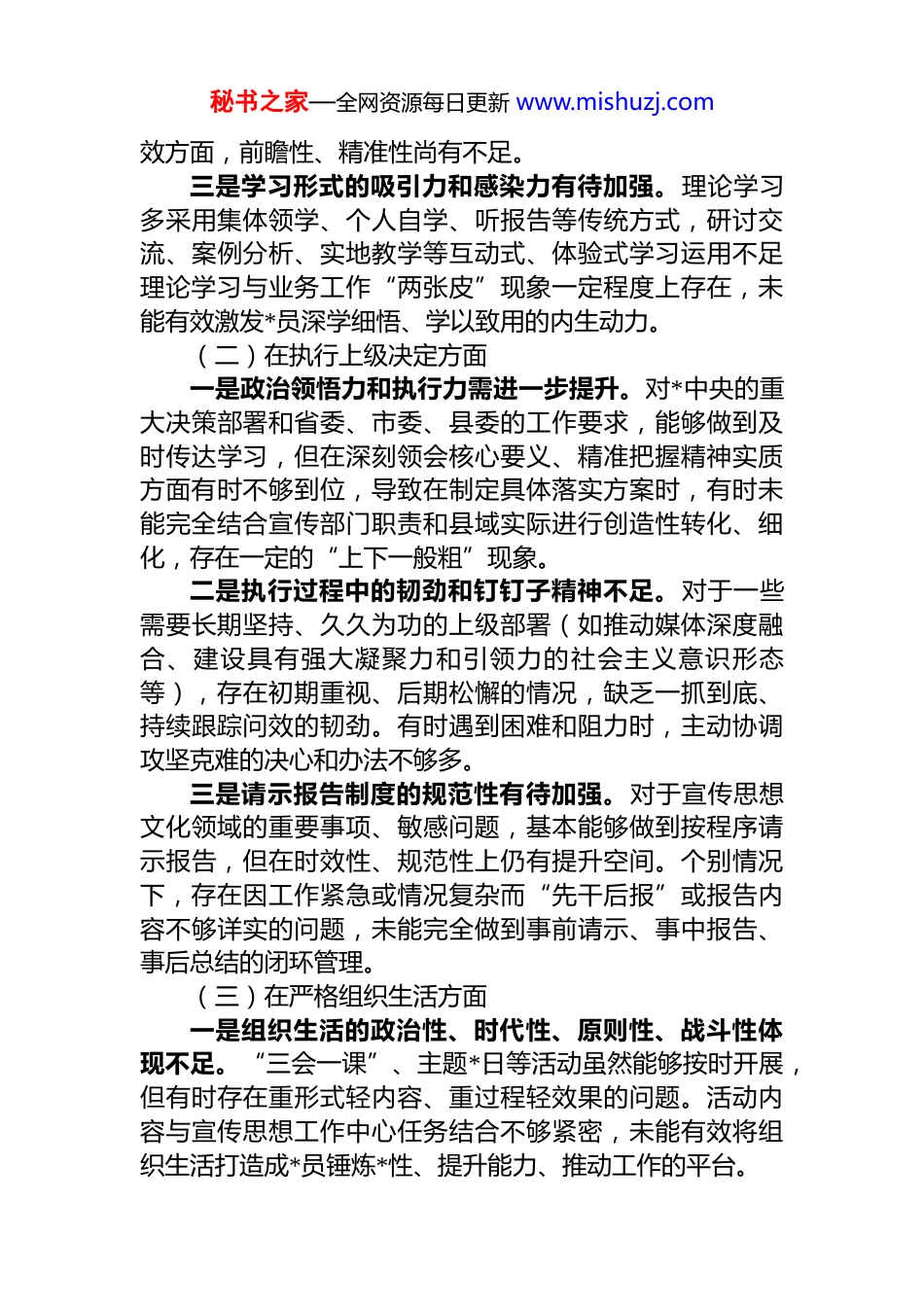 秘书之家—全网资源每日更新 www.mishuzj.comxx 县委宣传部支部班子 2025 年度组织生活会对照检查材料根据上级*组织关于召开 2025 年度基层*组织组织生活会和开展民主评议*员的统一部署,xx 县委宣传部*支部紧扣会议主题,严格对照*章*规、对照系列重要讲话精神、对照先进典型,聚焦“加强理论武装、执行上级决定、严格组织生活、加强*员管理监督、做好群众工作、抓好自身建设”六个方面,并深入结合学习贯彻中央八项规定及其实施细则精神情况,进行了全面、深刻的对照检查和*性分析。支部班子通过集中学习研讨、广泛征求意见建议、深入开展谈心谈话等形式,认真查摆突出问题,深刻剖析问题根源,明确了整改方向和具体措施。现将对照检查情况报告如下:一、查摆存在的主要问题(一)在加强理论武装方面一是学习的系统性和深入性有欠缺。虽然能够坚持“第一议题”制度,组织学习*的创新理论和最新重要讲话精神,但存在“碎片化”现象,对**************思想,特别是关于宣传思想文化工作的重要论述,缺乏体系化、学理化的研究和整体性把握。满足于“读过了”“学过了”,但在“悟透了”“弄通了”上下的功夫不够深,未能完全做到融会贯通。二是理论联系实际的紧密度不够。运用*的创新理论指导全县宣传思想工作实践、破解难题的能力有待提升。例如,在如何将*的创新理论转化为群众喜闻乐见的语言、形式进行有效传播方面,创新举措不多、效果不彰;在运用科学理论分析研判意识形态领域风险、把握舆论引导时度秘书之家—全网资源每日更新 www.mishuzj.com效方面,前瞻性、精准性尚有不足。三是学习形式的吸引力和感染力有待加强。理论学习多采用集体领学、个人自学、听报告等传统方式,研讨交流、案例分析、实地教学等互动式、体验式学习运用不足理论学习与业务工作“两张皮”现象一定程度上存在,未能有效激发*员深学细悟、学以致用的内生动力。(二)在执行上级决定方面一是政治领悟力和执行力需进一步提升。对*中央的重大决策部署和省委、市委、县委的工作要求,能够做到及时传达学习,但在深刻领会核心要义、精准把握精神实质方面有时不够到位,导致在制定具体落实方案时,有时未能完全结合宣传部门职责和县域实际进行创造性转化、细化,存在一定的“上下一般粗”现象。二是执行过程中的韧劲和钉钉子精神不足。对于一些需要长期坚持、久久为功的上级部署(如推动媒体深度融合、建设具有强大凝聚力和引领力的社会主义意识形态等),存在初期重视、后期松懈的情况,缺乏一抓到底、持续跟踪问效的韧劲。有时遇到困难和阻力时,主动协调攻坚克难的决心和办法不够多。三是请示报告制度的规范性有待加强。对于宣传思想文化领域的重要事项、敏感问题,基本能够做到按程序请示报告,但在时效性、规范性上仍有提升空间。个别情况下,存在因工作紧急或情况复杂而“先干后报”或报告内容不够详实的问题,未能完全做到事前请示、事中报告、事后总结的闭环管理。(三)在严格组织生活方面一是组织生活的政治性、时代性、原则性、战斗性体现不足。“三会一课”、主题*日等活动虽然能够按时开展,但有时存在重形式轻内容、重过程轻效果的问题。活动内容与宣传思想工作中心任务结合不够紧密,未能有效将组织生活打造成*员锤炼*性、提升能力、推动工作的平台。秘书之家—全网资源每日更新 www.mishuzj.com二是批评和自我批评武器运用不充分。在组织生活会上,自我批评有时“隔靴搔痒”,怕揭短亮丑;相互批评有时“和风细雨”,存在“老好人”思想,辣味不足,未能真正达到“红脸出汗、排毒治病”的效果。谈心谈话制度落实不够经常深入,多停留在工作交流,思想层面的沟通、提醒、帮助做得不够。三是*员领导干部双重组织生活制度落实有差距。支部班子成员虽然能参加所在支部的组织生活,但有时因公务繁忙未能全程参与,以普通*员身份带头开展批评与自我批评、深入听取*员意见建议的示范作用发挥还不够充分。(四)在加强*员管理监督方面一是*员日常教育管理监督的精准性、有效性有待增强对*员的动态思想状况、工作表现掌握不够全面及时,教育管理方式有时比较笼统,针对不同岗位、不同特点*...