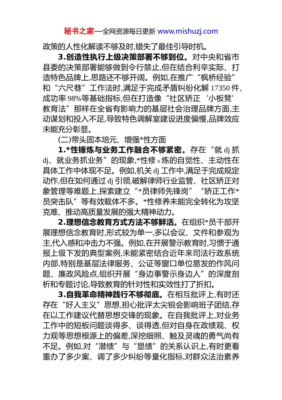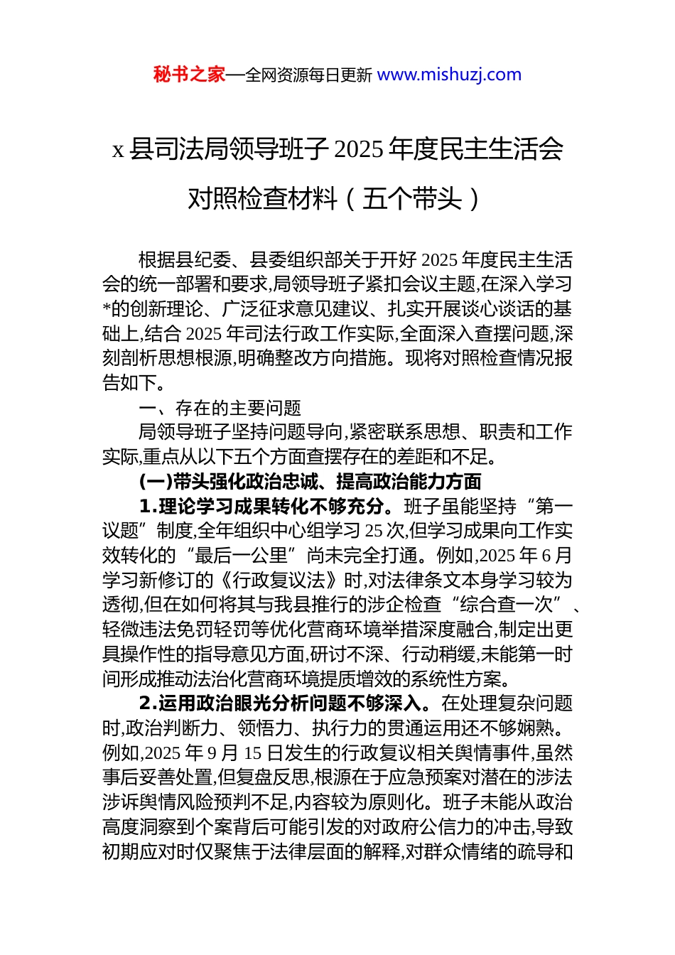 秘书之家—全网资源每日更新 www.mishuzj.comx 县司法局领导班子 2025 年度民主生活会对照检查材料(五个带头)根据县纪委、县委组织部关于开好 2025 年度民主生活会的统一部署和要求,局领导班子紧扣会议主题,在深入学习*的创新理论、广泛征求意见建议、扎实开展谈心谈话的基础上,结合 2025 年司法行政工作实际,全面深入查摆问题,深刻剖析思想根源,明确整改方向措施。现将对照检查情况报告如下。一、存在的主要问题局领导班子坚持问题导向,紧密联系思想、职责和工作实际,重点从以下五个方面查摆存在的差距和不足。(一)带头强化政治忠诚、提高政治能力方面1.理论学习成果转化不够充分。班子虽能坚持“第一议题”制度,全年组织中心组学习 25 次,但学习成果向工作实效转化的“最后一公里”尚未完全打通。例如,2025 年 6 月学习新修订的《行政复议法》时,对法律条文本身学习较为透彻,但在如何将其与我县推行的涉企检查“综合查一次”、轻微违法免罚轻罚等优化营商环境举措深度融合,制定出更具操作性的指导意见方面,研讨不深、行动稍缓,未能第一时间形成推动法治化营商环境提质增效的系统性方案。2.运用政治眼光分析问题不够深入。在处理复杂问题时,政治判断力、领悟力、执行力的贯通运用还不够娴熟。例如,2025 年 9 月 15 日发生的行政复议相关舆情事件,虽然事后妥善处置,但复盘反思,根源在于应急预案对潜在的涉法涉诉舆情风险预判不足,内容较为原则化。班子未能从政治高度洞察到个案背后可能引发的对政府公信力的冲击,导致初期应对时仅聚焦于法律层面的解释,对群众情绪的疏导和秘书之家—全网资源每日更新 www.mishuzj.com政策的人性化解读不够及时,错失了最佳引导时机。3.创造性执行上级决策部署不够到位。对中央和省市县委的决策部署能够做到令行禁止,但在结合利辛实际、打造特色品牌上,思路还不够开阔。例如,在推广“枫桥经验”和“六尺巷”工作法时,满足于完成矛盾纠纷化解 17350 件、成功率 98%等基础指标,但在打造像“社区矫正‘小板凳’教育法”那样在全省有影响力的基层社会治理品牌方面,主动谋划和投入不足,导致特色调解室建设进度偏慢,品牌效应未能充分彰显。(二)带头固本培元、增强*性方面1.*性锤炼与业务工作融合不够紧密。存在“就 dj 抓dj、就业务抓业务”的现象,*性修 ย 炼的自觉性、主动性在具体工作中体现不足。例如,机关 dj 工作中,满足于完成规定动作,但在如何通过 dj 引领,破解律师行业监管、社区矫正对象管理等难题上,探索建立“*员律师先锋岗”“矫正工作*员突击队”等有效载体不多。*性修养未能完全转化为攻坚克难、推动高质量发展的强大精神动力。2.理想信念教育方式方法不够鲜活。在组织*员干部开展理想信念教育时,形式较为单一,多以会议、文件和参观为主,代入感和冲击力不强。例如,在开展警示教育时,习惯于通报上级下发的典型案例,未能紧密结合近年来司法行政系统内部,特别是基层法律服务、公证等窗口单位易发的作风问题、廉政风险点,组织开展“身边事警示身边人”的深度剖析和专题讨论,导致教育的针对性和实效性打了折扣。3.自我革命精神践行不够彻底。在相互批评上,有时还存在“好人主义”思想,担心批评太尖锐会影响班子团结,存在以工作建议代替思想交锋的现象。在自我批评上,对业务工作中的短板问题谈得多、谈得透,但对自身在政绩观、权力观等思想根源上的偏差,深挖细照、触及灵魂的勇气尚有不足。例如,对“潜绩”与“显绩”的关系认识上,有时更看重办了多少案、调了多少纠纷等量化指标,对群众法治素养秘书之家—全网资源每日更新 www.mishuzj.com提升等难以量化的“潜绩”的关注和投入仍需加强。(三)带头敬畏人民、敬畏组织、敬畏法纪方面1.服务群众的精准性和主动性有待提升。虽然法律援助、公证办理等业务量稳步增长,但服务模式仍以“坐堂等案”为主,主动发现和满足群众潜在法律需求的能力不足。例如,在推进“法律明白人”培养工程时,完成了 3333 名的培训任务,但对这些“明白人”后续作用发挥的跟踪问效机制不健全,未能建立常态化的联系指导和需求反馈渠道,导致部分“明白人”与群众法律需求之间存在“断线”现象...
