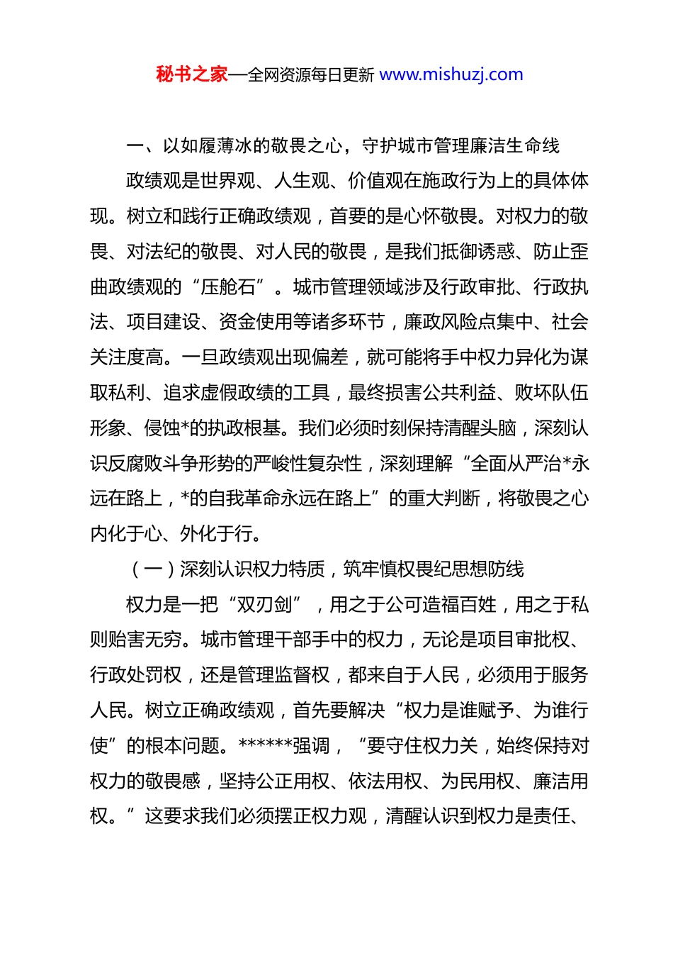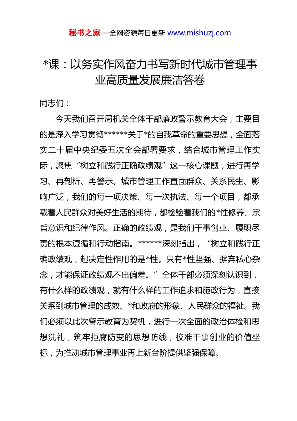 秘书之家—全网资源每日更新 www.mishuzj.com*课:以务实作风奋力书写新时代城市管理事业高质量发展廉洁答卷同志们:今天我们召开局机关全体干部廉政警示教育大会,主要目的是深入学习贯彻******关于*的自我革命的重要思想,全面落实二十届中央纪委五次全会部署要求,结合城市管理工作实际,聚焦“树立和践行正确政绩观”这一核心课题,进行再学习、再剖析、再警示。城市管理工作直面群众、关系民生、影响广泛,我们的每一项决策、每一次执法、每一个项目,都承载着人民群众对美好生活的期待,都检验着我们的*性修养、宗旨意识和纪律作风。正确的政绩观,是我们干事创业、履职尽责的根本遵循和行动指南。******深刻指出,“树立和践行正确政绩观,起决定性作用的是*性。只有*性坚强、摒弃私心杂念,才能保证政绩观不出偏差。”全体干部必须深刻认识到,有什么样的政绩观,就有什么样的工作追求和施政行为,直接关系到城市管理的成效、*和政府的形象、人民群众的福祉。我们必须以此次警示教育为契机,进行一次全面的政治体检和思想洗礼,筑牢拒腐防变的思想防线,校准干事创业的价值坐标,为推动城市管理事业再上新台阶提供坚强保障。秘书之家—全网资源每日更新 www.mishuzj.com一、以如履薄冰的敬畏之心,守护城市管理廉洁生命线政绩观是世界观、人生观、价值观在施政行为上的具体体现。树立和践行正确政绩观,首要的是心怀敬畏。对权力的敬畏、对法纪的敬畏、对人民的敬畏,是我们抵御诱惑、防止歪曲政绩观的“压舱石”。城市管理领域涉及行政审批、行政执法、项目建设、资金使用等诸多环节,廉政风险点集中、社会关注度高。一旦政绩观出现偏差,就可能将手中权力异化为谋取私利、追求虚假政绩的工具,最终损害公共利益、败坏队伍形象、侵蚀*的执政根基。我们必须时刻保持清醒头脑,深刻认识反腐败斗争形势的严峻性复杂性,深刻理解“全面从严治*永远在路上,*的自我革命永远在路上”的重大判断,将敬畏之心内化于心、外化于行。(一)深刻认识权力特质,筑牢慎权畏纪思想防线权力是一把“双刃剑”,用之于公可造福百姓,用之于私则贻害无穷。城市管理干部手中的权力,无论是项目审批权、行政处罚权,还是管理监督权,都来自于人民,必须用于服务人民。树立正确政绩观,首先要解决“权力是谁赋予、为谁行使”的根本问题。******强调,“要守住权力关,始终保持对权力的敬畏感,坚持公正用权、依法用权、为民用权、廉洁用权。”这要求我们必须摆正权力观,清醒认识到权力是责任、秘书之家—全网资源每日更新 www.mishuzj.com是担当,而不是个人炫耀的资本、寻租的工具。要坚决摒弃“官本位”思想,破除特权思维和霸道作风,在任何时候都不能搞权力变现、利益输送。要不断加强*性锻炼和道德修养,从思想深处拧紧“总开关”,常修为政之德,常思贪欲之害,常怀律己之心。要将纪律规矩刻印在心,深入学习*章*规 dj 和国家法律法规,特别是与城市管理工作密切相关的《中华人民共和国行政处罚法》、《中华人民共和国城乡规划法》等,明确权力边界和行为底线。要常态化开展纪法教育和廉政谈话,让干部知敬畏、存戒惧、守底线,习惯在受监督和约束的环境中工作生活,确保权力在阳光下规范运行,从源头上防止为追求个人“显绩”而滥用权力、违规操作。(二)精准把握风险挑战,织密城市管理廉政滤网城市管理工作线长面广,廉政风险渗透于各个环节。从户外广告审批、临时占道许可中的自由裁量权,到市容环卫、市政设施、园林绿化等工程项目招投标与建设管理,再到对共享单车、流动摊贩等新兴业态的监管执法,都存在不同程度的廉政风险。树立和践行正确政绩观,必须与精准防控廉政风险紧密结合。要力戒那种为了追求所谓“亮点”、“速度”而忽视程序、规避监管的错误倾向,决不能以“特事特办”为名行违规违纪之实。要建立健全廉政风险排查防控长效机制,围绕权秘书之家—全网资源每日更新 www.mishuzj.com力运行的关键点、内部管理的薄弱点、问题易发的风险点,全面深入排查,科学评估等级,制定具体管用的防控措施。要聚焦重点领域和关键岗位,如项目审批、资金拨付、物资采购、执法...