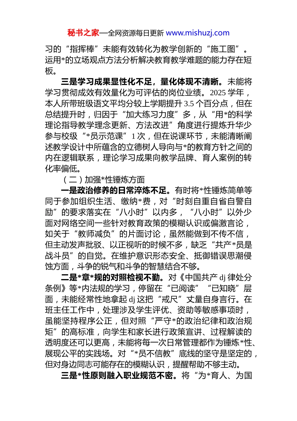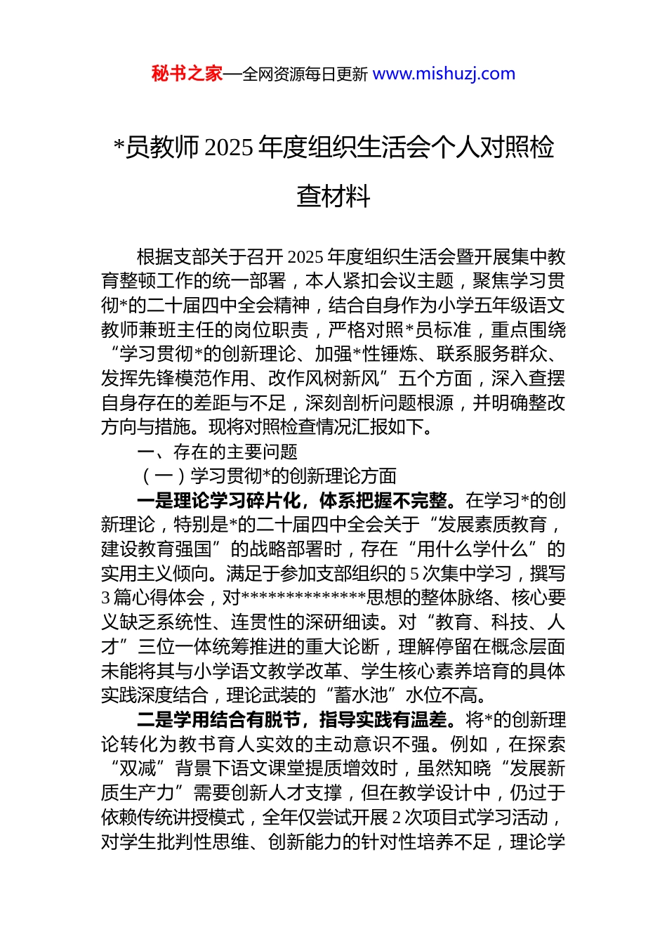 秘书之家—全网资源每日更新 www.mishuzj.com*员教师 2025 年度组织生活会个人对照检查材料根据支部关于召开 2025 年度组织生活会暨开展集中教育整顿工作的统一部署,本人紧扣会议主题,聚焦学习贯彻*的二十届四中全会精神,结合自身作为小学五年级语文教师兼班主任的岗位职责,严格对照*员标准,重点围绕“学习贯彻*的创新理论、加强*性锤炼、联系服务群众、发挥先锋模范作用、改作风树新风”五个方面,深入查摆自身存在的差距与不足,深刻剖析问题根源,并明确整改方向与措施。现将对照检查情况汇报如下。一、存在的主要问题(一)学习贯彻*的创新理论方面一是理论学习碎片化,体系把握不完整。在学习*的创新理论,特别是*的二十届四中全会关于“发展素质教育,建设教育强国”的战略部署时,存在“用什么学什么”的实用主义倾向。满足于参加支部组织的 5 次集中学习,撰写3 篇心得体会,对**************思想的整体脉络、核心要义缺乏系统性、连贯性的深研细读。对“教育、科技、人才”三位一体统筹推进的重大论断,理解停留在概念层面未能将其与小学语文教学改革、学生核心素养培育的具体实践深度结合,理论武装的“蓄水池”水位不高。二是学用结合有脱节,指导实践有温差。将*的创新理论转化为教书育人实效的主动意识不强。例如,在探索“双减”背景下语文课堂提质增效时,虽然知晓“发展新质生产力”需要创新人才支撑,但在教学设计中,仍过于依赖传统讲授模式,全年仅尝试开展 2 次项目式学习活动,对学生批判性思维、创新能力的针对性培养不足,理论学秘书之家—全网资源每日更新 www.mishuzj.com习的“指挥棒”未能有效转化为教学创新的“施工图”。运用*的立场观点方法分析解决教育教学难题的能力存在短板。三是学习成果显性化不足,量化体现不清晰。未能将学习贯彻成效有效量化为可评估的岗位业绩。2025 学年,本人所带班级语文平均分较上学期提升 3.5 个百分点,但在总结提升时,归因于“加大练习力度”多,从“用*的科学理论指导教学理念更新、方法改进”角度进行提炼升华少参与校级“*员示范课”1 次,但在说课环节,未能清晰阐述教学设计中所蕴含的立德树人导向与*的教育方针之间的内在逻辑联系,理论学习成果向教学品牌、育人案例的转化率偏低。(二)加强*性锤炼方面一是政治修养的日常淬炼不足。有时将*性锤炼简单等同于参加组织生活、缴纳*费,对“时刻自重自省自警自励”的要求落实在“八小时”以内多,“八小时”以外少面对网络空间一些针对教育政策的模糊认识或偏激言论,如关于“教师减负”的片面讨论,虽然能做到不传不信,但主动发声批驳、以正视听的时候不多,缺乏“共产*员是战斗员”的自觉。在维护意识形态安全、抵御错误思潮侵蚀方面,斗争的锐气和斗争的智慧结合不够。二是*章*规的对照检视不勤。对《中国共产 dj 律处分条例》等*内法规的学习,停留在“已阅读”“已知晓”层面,未能经常性地拿起 dj 这把“戒尺”丈量自身言行。在班主任工作中,处理涉及学生评优、资助等敏感事项时,虽能坚持程序公正,但对照“严守*的政治纪律和政治规矩”的高标准,向学生和家长进行政策宣讲、过程解读的透明度还可以更高,未能将每一次日常管理都作为锤炼*性、展现公平的实践场。对“*员不信教”底线的坚守是坚定的,但对身边同志可能存在的模糊认识,提醒帮助不够主动。三是*性原则融入职业规范不密。将“为*育人、为国秘书之家—全网资源每日更新 www.mishuzj.com育才”的宏观要求具体化为每一天的备课上课、批改作业谈心谈话的自觉性不够强。有时会因为教务繁杂而产生职业倦怠感,将教师工作仅仅视为一份“职业”,淡化了其作为*的事业重要组成部分的“事业”属性。在引导学生树立正确世界观、人生观、价值观方面,多依靠教材既定内容和主题班会,结合时事政治、社会热点主动创设情境进行价值引导的次数,全年不足 10 次,运用*性原则“正心明道、修身律己”进而“润物无声”的功力不深。(三)联系服务群众方面一是践行群众路线存在“办公室化”倾向。联系服务家长群体主要依靠每学期 1 次的家长会和班级微信群,主动“走出去”进行...