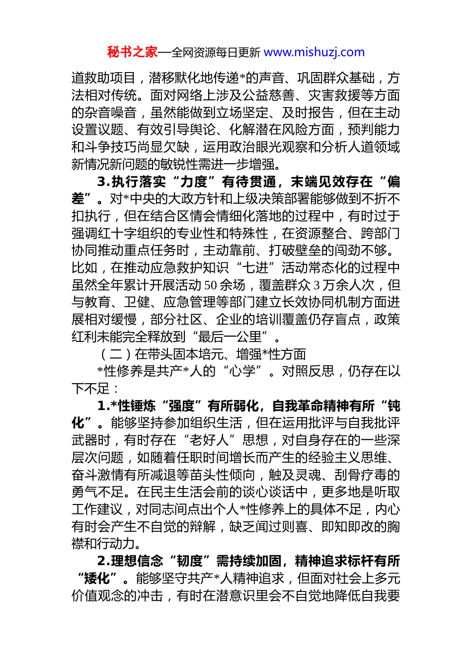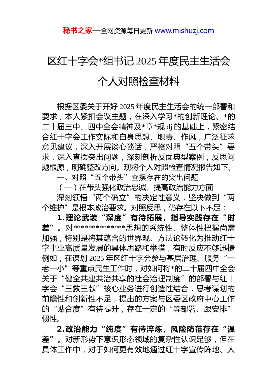 秘书之家—全网资源每日更新 www.mishuzj.com区红十字会*组书记 2025 年度民主生活会个人对照检查材料根据区委关于开好 2025 年度民主生活会的统一部署和要求,本人紧扣会议主题,在深入学习*的创新理论、*的二十届三中、四中全会精神及*章*规 dj 的基础上,紧密结合红十字会工作实际和自身思想、职责、作风,广泛征求意见建议,深入开展谈心谈话,严格对照“五个带头”要求,深入查摆突出问题,深刻剖析反面典型案例,反思问题根源,明确整改方向。现将个人对照检查情况报告如下。一、对照“五个带头”查摆存在的突出问题(一)在带头强化政治忠诚、提高政治能力方面深刻领悟“两个确立”的决定性意义,坚决做到“两个维护”是根本政治要求。对照反思,仍存在以下不足:1.理论武装“深度”有待拓展,指导实践存在“时差”。对**************思想的系统性、整体性把握尚需加强,特别是将其蕴含的世界观、方法论转化为推动红十字事业高质量发展的具体思路和举措,有时反应不够迅捷例如,在谋划 2025 年区红十字会参与基层治理、服务“一老一小”等重点民生工作时,对如何将*的二十届四中全会关于“健全共建共治共享的社会治理制度”的部署与红十字会“三救三献”核心业务进行创造性结合,思考谋划的前瞻性和创新性不足,提出的方案与区委区政府中心工作的“贴合度”有待提升,存在一定的“等部署、跟安排”惯性。2.政治能力“纯度”有待淬炼,风险防范存在“温差”。对新形势下意识形态领域的复杂性认识足够,但在具体工作中,对于如何更有效地通过红十字宣传阵地、人秘书之家—全网资源每日更新 www.mishuzj.com道救助项目,潜移默化地传递*的声音、巩固群众基础,方法相对传统。面对网络上涉及公益慈善、灾害救援等方面的杂音噪音,虽然能做到立场坚定、及时报告,但在主动设置议题、有效引导舆论、化解潜在风险方面,预判能力和斗争技巧尚显欠缺,运用政治眼光观察和分析人道领域新情况新问题的敏锐性需进一步增强。3.执行落实“力度”有待贯通,末端见效存在“偏差”。对*中央的大政方针和上级决策部署能够做到不折不扣执行,但在结合区情会情细化落地的过程中,有时过于强调红十字组织的专业性和特殊性,在资源整合、跨部门协同推动重点任务时,主动靠前、打破壁垒的闯劲不够。比如,在推动应急救护知识“七进”活动常态化的过程中虽然全年累计开展活动 50 余场,覆盖群众 3 万余人次,但与教育、卫健、应急管理等部门建立长效协同机制方面进展相对缓慢,部分社区、企业的培训覆盖仍存盲点,政策红利未能完全释放到“最后一公里”。(二)在带头固本培元、增强*性方面*性修养是共产*人的“心学”。对照反思,仍存在以下不足:1.*性锤炼“强度”有所弱化,自我革命精神有所“钝化”。能够坚持参加组织生活,但在运用批评与自我批评武器时,有时存在“老好人”思想,对自身存在的一些深层次问题,如随着任职时间增长而产生的经验主义思维、奋斗激情有所减退等苗头性倾向,触及灵魂、刮骨疗毒的勇气不足。在民主生活会前的谈心谈话中,更多地是听取工作建议,对同志间点出个人*性修养上的具体不足,内心有时会产生不自觉的辩解,缺乏闻过则喜、即知即改的胸襟和行动力。2.理想信念“韧度”需持续加固,精神追求标杆有所“矮化”。能够坚守共产*人精神追求,但面对社会上多元价值观念的冲击,有时在潜意识里会不自觉地降低自我要秘书之家—全网资源每日更新 www.mishuzj.com求的标准。在弘扬“人道、博爱、奉献”的红十字精神时更多地是将其作为职业要求,未能时时处处将其与共产*员的崇高理想信念进行深度融合、一体践行。在繁重的工作任务和日常事务压力下,静下心来重温红色经典、从革命先辈和新时代楷模身上汲取纯粹精神力量的主动性有所减弱,世界观、人生观、价值观这个“总开关”的拧紧加固需要常抓不懈。3.纪律规矩“刻度”需时刻对标,修身律己标准有所“软化”。能够认真学习*章*规 dj,但在日常工作中,对一些“细微之处”的纪律要求警惕性不够高。例如,在公务接待、差旅报销等方面,虽然严格遵守相关规定,但有时对下属和同事在类似环节可能存在的“...