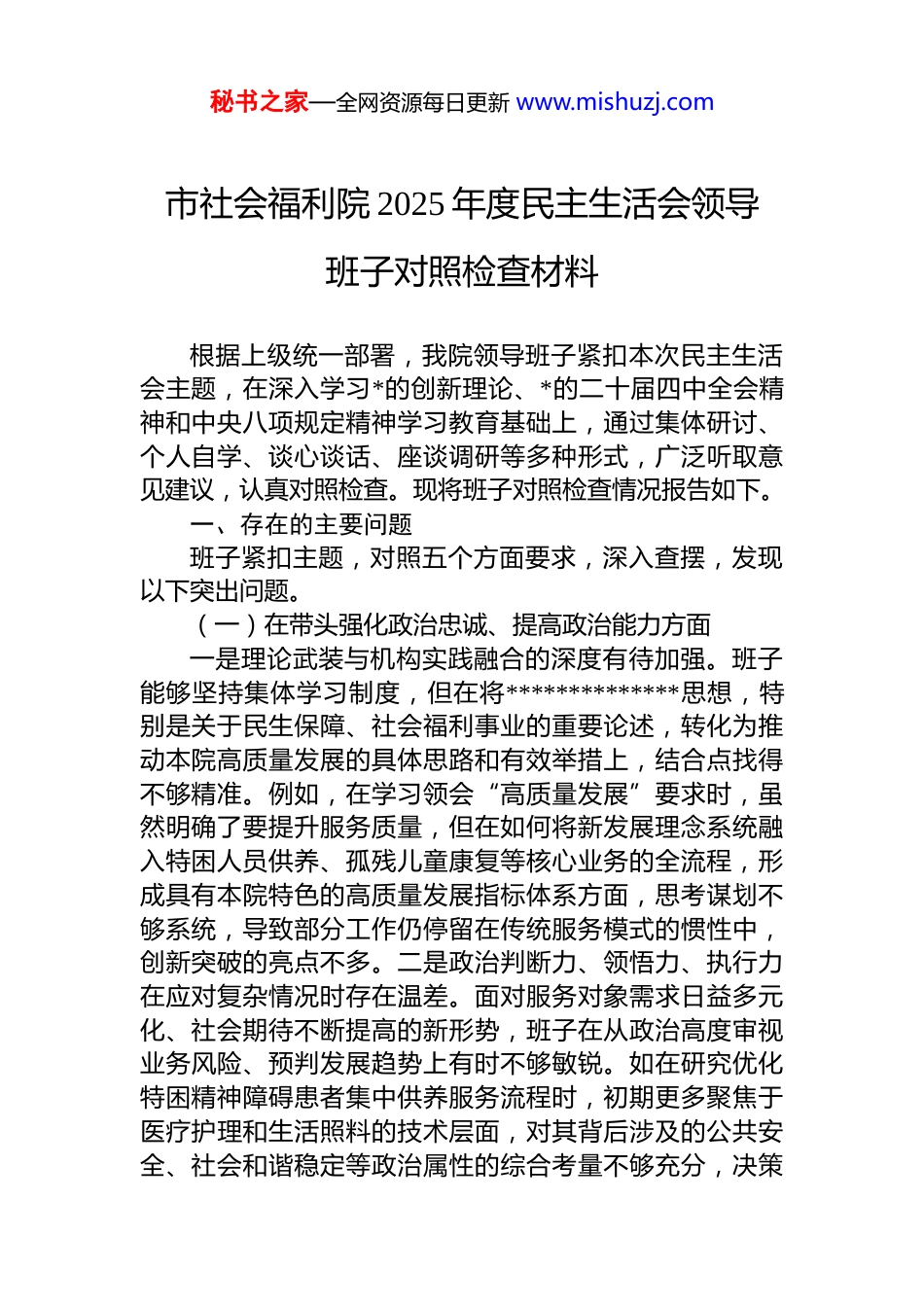 秘书之家—全网资源每日更新 www.mishuzj.com市社会福利院 2025 年度民主生活会领导班子对照检查材料根据上级统一部署,我院领导班子紧扣本次民主生活会主题,在深入学习*的创新理论、*的二十届四中全会精神和中央八项规定精神学习教育基础上,通过集体研讨、个人自学、谈心谈话、座谈调研等多种形式,广泛听取意见建议,认真对照检查。现将班子对照检查情况报告如下。一、存在的主要问题班子紧扣主题,对照五个方面要求,深入查摆,发现以下突出问题。(一)在带头强化政治忠诚、提高政治能力方面一是理论武装与机构实践融合的深度有待加强。班子能够坚持集体学习制度,但在将**************思想,特别是关于民生保障、社会福利事业的重要论述,转化为推动本院高质量发展的具体思路和有效举措上,结合点找得不够精准。例如,在学习领会“高质量发展”要求时,虽然明确了要提升服务质量,但在如何将新发展理念系统融入特困人员供养、孤残儿童康复等核心业务的全流程,形成具有本院特色的高质量发展指标体系方面,思考谋划不够系统,导致部分工作仍停留在传统服务模式的惯性中,创新突破的亮点不多。二是政治判断力、领悟力、执行力在应对复杂情况时存在温差。面对服务对象需求日益多元化、社会期待不断提高的新形势,班子在从政治高度审视业务风险、预判发展趋势上有时不够敏锐。如在研究优化特困精神障碍患者集中供养服务流程时,初期更多聚焦于医疗护理和生活照料的技术层面,对其背后涉及的公共安全、社会和谐稳定等政治属性的综合考量不够充分,决策秘书之家—全网资源每日更新 www.mishuzj.com过程中对潜在风险的全面评估有待加强。三是在贯彻落实上级决策部署的“最后一公里”上存在衰减。对中央大政方针、省委市委工作要求和市民政局的具体部署,班子能够及时传达学习,但在结合本院实际制定细化落实方案时有时存在“上下一般粗”的现象。例如,在落实“十四五”民政事业发展规划中关于区域性儿童福利机构建设的要求时,虽然积极推进“养治康教”一体化,但在整合医疗、教育、康复等跨部门资源,建立稳定长效的协作机制上,攻坚克难的力度和韧性尚显不足,导致部分项目推进速度未达预期理想状态。(二)在带头固本培元、增强*性方面一是*性锤炼的主动性和常态化有欠缺。班子成员能够参加*的组织生活,但有时将*性修养简单等同于参加学习和会议,对照*章*规 dj 进行自我检视、自我净化、自我提高的主动性不够强。在繁忙的业务工作压力下,静下心来“吾日三省吾身”,从世界观、人生观、价值观深处剖析反思的功夫下得不够深。例如,在年度组织生活会上,开展自我批评有时碍于情面,对自身思想深处的一些模糊认识或惰性思维触及不够,未能完全达到“红脸出汗、排毒治病”的效果。二是理想信念教育融入日常管理不够紧密班子重视集中性的 zt 教育,但在将理想信念教育、共产*人精神追求的培养,潜移默化地渗透到干部职工的日常管理和服务行为规范中,方法不够多样,载体不够新颖。对院内一些年轻职工思想上存在的“福利工作就是按部就班”的认识偏差,未能及时通过有效的谈心谈话和榜样引领加以引导,运用*的创新理论凝心铸魂的实效性有待提升。三是以*性原则修身律己的标杆作用发挥不充分。班子成员能够做到廉洁自律,但在一些细节小事上,用最高标准严格要求自己有时不够一贯。例如,在院内资源分配、评优评先等工作中,虽然程序合规,但有时过于强调平衡,未能旗帜鲜明地将“实绩论英雄”的导向贯穿始终,在引导干秘书之家—全网资源每日更新 www.mishuzj.com部职工将*性原则内化为价值追求和行为习惯方面,示范引领作用有待进一步加强。(三)在带头敬畏人民、敬畏组织、敬畏法纪方面一是践行“四下基层”服务群众的精准度有待提高。班子建立了基层调研制度,也定期深入服务区,但在“身入”和“心至”的结合上还有差距。调研有时安排行程较满,与服务对象及一线护理员、康复师等职工坐下来深入交流、倾听原汁原味心声的时间不够充裕。例如,2025 年在调研孤残儿童“养治康教”一体化服务满意度时,主要通过机构座谈会和问卷收集信息,深入儿童家庭了解实际康复效...