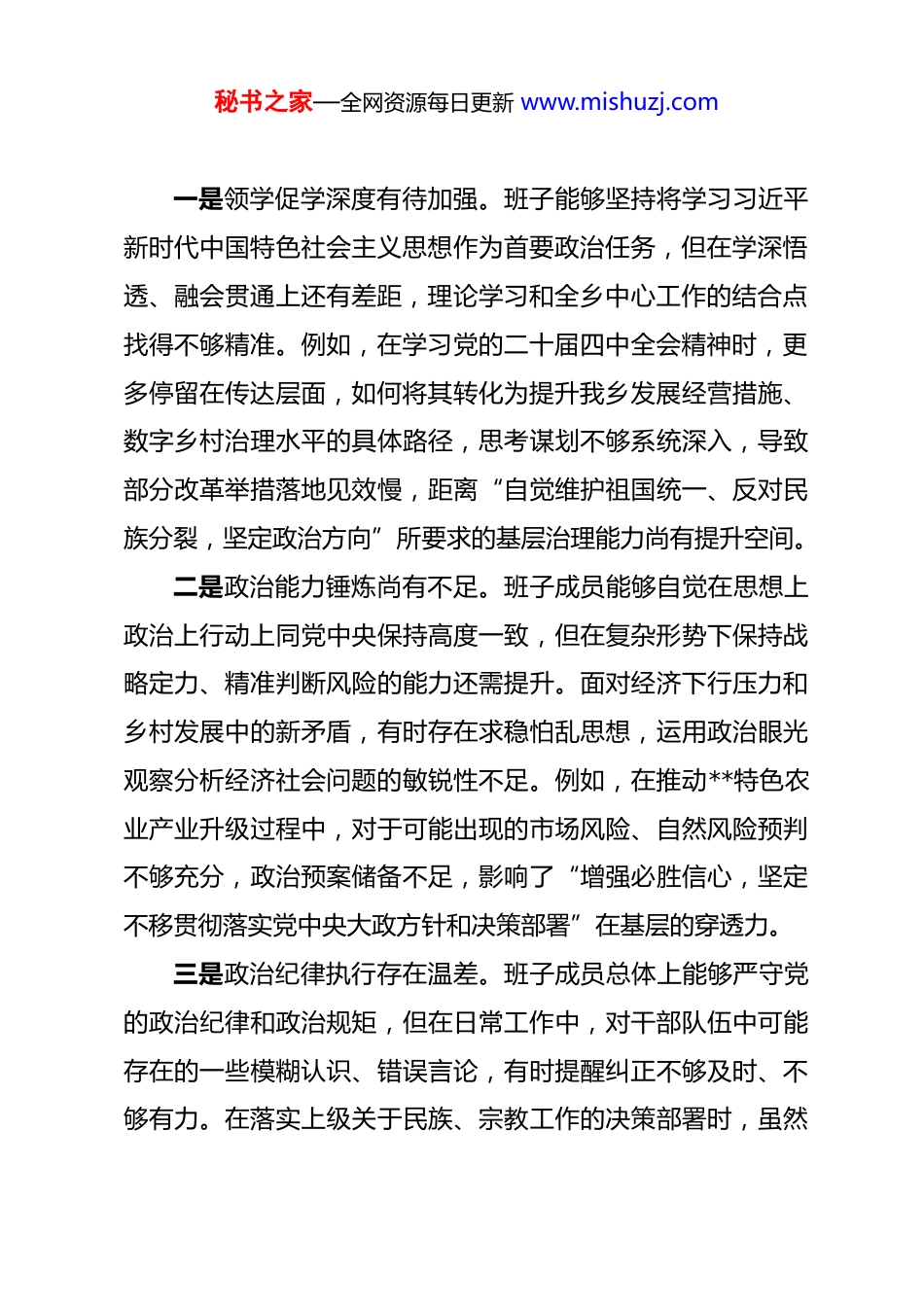 秘书之家—全网资源每日更新 www.mishuzj.com乡领导班子 2025 年度民主生活会对照检查材料 根据上级统一部署和要求,**乡领导班子紧扣 2025 年度民主生活会主题,在深入开展学习研讨、广泛征求意见建议、坦诚进行谈心谈话的基础上,紧紧围绕“深入学习贯彻习近平新时代中国特色社会主义思想,全面贯彻落实党的二十届三中、四中全会精神,深入贯彻落实习近平总书记重要讲话和重要指示批示精神,以打攻坚战、持久战的决心和恒心,锲而不舍落实中央八项规定精神,推进作风建设常态化长效化,以优良作风凝心聚力、真抓实干,聚焦高质量发展首要任务,扎实推进中国式现代化,为实现‘十五五’良好开局奠定坚实基础”这一主题,紧密结合本乡工作实际和班子思想动态,深入查摆突出问题,深刻剖析思想根源,认真研究整改措施。现将对照检查情况报告如下:一、对照主题全面深入查摆突出问题领导班子严格对照本次民主生活会主题,特别是“五个带头”的要求,坚持把自己摆进去、把职责摆进去、把工作摆进去,深入查摆出以下突出问题。(一)带头强化政治忠诚、提高政治能力方面秘书之家—全网资源每日更新 www.mishuzj.com一是领学促学深度有待加强。班子能够坚持将学习习近平新时代中国特色社会主义思想作为首要政治任务,但在学深悟透、融会贯通上还有差距,理论学习和全乡中心工作的结合点找得不够精准。例如,在学习党的二十届四中全会精神时,更多停留在传达层面,如何将其转化为提升我乡发展经营措施、数字乡村治理水平的具体路径,思考谋划不够系统深入,导致部分改革举措落地见效慢,距离“自觉维护祖国统一、反对民族分裂,坚定政治方向”所要求的基层治理能力尚有提升空间。二是政治能力锤炼尚有不足。班子成员能够自觉在思想上政治上行动上同党中央保持高度一致,但在复杂形势下保持战略定力、精准判断风险的能力还需提升。面对经济下行压力和乡村发展中的新矛盾,有时存在求稳怕乱思想,运用政治眼光观察分析经济社会问题的敏锐性不足。例如,在推动**特色农业产业升级过程中,对于可能出现的市场风险、自然风险预判不够充分,政治预案储备不足,影响了“增强必胜信心,坚定不移贯彻落实党中央大政方针和决策部署”在基层的穿透力。三是政治纪律执行存在温差。班子成员总体上能够严守党的政治纪律和政治规矩,但在日常工作中,对干部队伍中可能存在的一些模糊认识、错误言论,有时提醒纠正不够及时、不够有力。在落实上级关于民族、宗教工作的决策部署时,虽然秘书之家—全网资源每日更新 www.mishuzj.com能够坚决执行,但在结合本乡实际创造性地开展工作,引导各族群众“广泛参与发展进程、充分共享发展成果”的载体设计上创新不足,深入田间地头、农家院落宣讲党的民族政策的频次和实效有待提高,对“解决好世界观、人生观、价值观总开关问题”在促进民族团结中的基础性作用认识有待深化。(二)带头固本培元、增强党性方面一是党性修养锤炼标准不高。班子成员能够认识到党性修养的重要性,但有时将政治修养等同于参加组织生活、完成学习任务,在“坚守共产党人精神追求”的崇高性上自我要求有所放松。艰苦奋斗、勤俭节约的意识在个别场合有所弱化,例如在筹划一些乡村文化活动时,有时过于讲究场面和形式,在“以习近平新时代中国特色社会主义思想凝心铸魂”内化为节俭朴素的行动自觉上存在差距。对一些社会上的不良风气和错误思潮,缺乏从党性高度进行坚决斗争的锐气。二是理想信念具体化不足。虽然班子成员理想信念坚定,但如何将崇高的理想信念转化为推动**乡高质量发展的每一天具体行动,结合点找得不够实。在面临发展瓶颈时,有时会产生畏难情绪,攻坚克难的锐气有所消退。例如,在推进**村人居环境整治长效管护机制建设中,面对资金和人力持续投入的压力,个别同志产生了“歇歇脚”的想法,反映出“解决好世秘书之家—全网资源每日更新 www.mishuzj.com界观、人生观、价值观总开关问题”在激发持续奋斗精神方面的根基还需进一步夯实。三是道德品质示范引领不够。班子成员注重个人品德修养,但在以身作则、纯正道德品质方面,发挥“头雁效应”不够充分。在密切联...