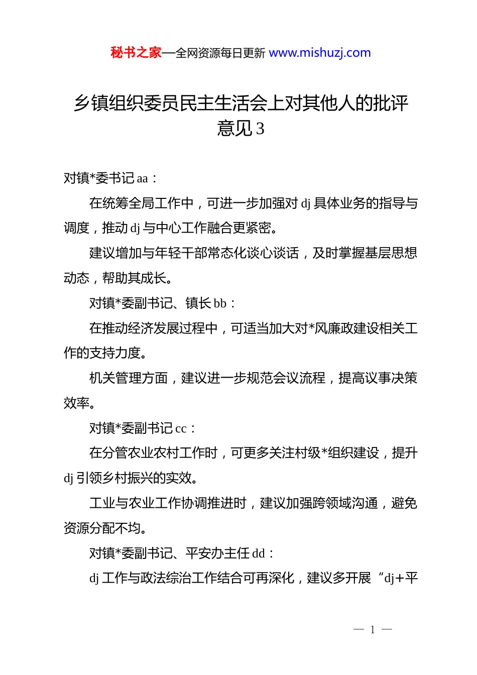 秘书之家—全网资源每日更新 www.mishuzj.com乡镇组织委员民主生活会上对其他人的批评意见 3对镇*委书记 aa:在统筹全局工作中,可进一步加强对 dj 具体业务的指导与调度,推动 dj 与中心工作融合更紧密。建议增加与年轻干部常态化谈心谈话,及时掌握基层思想动态,帮助其成长。对镇*委副书记、镇长 bb:在推动经济发展过程中,可适当加大对*风廉政建设相关工作的支持力度。机关管理方面,建议进一步规范会议流程,提高议事决策效率。对镇*委副书记 cc:在分管农业农村工作时,可更多关注村级*组织建设,提升dj 引领乡村振兴的实效。工业与农业工作协调推进时,建议加强跨领域沟通,避免资源分配不均。对镇*委副书记、平安办主任 dd:dj 工作与政法综治工作结合可再深化,建议多开展“dj+平— 1 —秘书之家—全网资源每日更新 www.mishuzj.com安建设”主题活动。群团工作中,可进一步发挥青年、妇女组织在基层治理中的作用。对镇纪委书记 ee:在执纪监督中,可加强对*员干部的日常廉政教育,做到防微杜渐。建议推动纪检工作与组织监督更好衔接,形成监督合力。对副镇长 ff:在抓安全生产的同时,可加强对企业 dj 工作的指导,推动“dj+安全”双落实。招商引资过程中,建议更加注重引进项目的 dj 共建机制建设。对镇*委委员、武装部长、副镇长 hh:城建、土地工作中,可进一步发挥*员干部在征地拆迁、项目推进中的先锋模范作用。武装工作与基层组织建设结合可再加强,建议推动民兵*组织规范化建设。对镇*委宣传委员 jj:理论学习形式可更加多样,增强对年轻干部的吸引力与参与度。— 2 —秘书之家—全网资源每日更新 www.mishuzj.com外宣工作中,建议加大对 dj 典型、*员风采的宣传力度。对副镇长 kk:园区建设与 dj 工作同步推进可进一步加强,建议推动设立园区*组织。查违工作中,可注重发挥村级*组织的监督与协调作用。对副镇长 mm:机关管理中,建议进一步规范*务公开制度,提升透明度。在分管财经工作中,可加强对*员干部的财经纪律教育。— 3 —