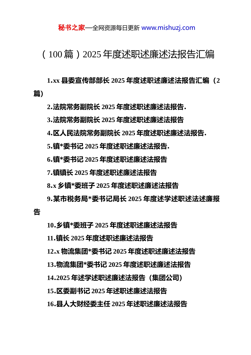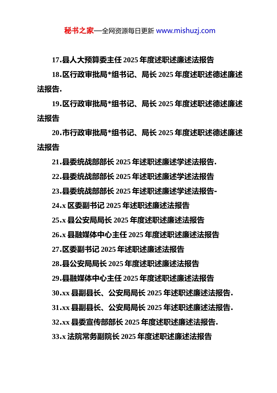 秘书之家—全网资源每日更新 www.mishuzj.com(100 篇)2025 年度述职述廉述法报告汇编1.xx 县委宣传部部长 2025 年度述职述廉述法报告汇编(2篇)2.法院常务副院长 2025 年度述职述廉述法报告.3.法院常务副院长 2025 年度述职述廉述法报告4.区人民法院常务副院长 2025 年度述职述廉述法报告.5.镇*委书记 2025 年度述职述廉述法报告.6.镇*委书记 2025 年度述职述廉述法报告7.镇镇长 2025 年度述职述廉述法报告8.x 乡镇*委班子 2025 年度述职述廉述法报告9.某市税务局*委书记局长 2025 年度述学述职述法述廉报告10.乡镇*委班子 2025 年度述职述廉述法报告11.镇长 2025 年度述职述廉述法报告12.x 物流集团*委书记 2025 年度述职述廉述法报告13.物流集团*委书记 2025 年度述职述廉述法报告14.2025 年述学述职述廉述法报告(集团公司)15.区委副书记 2025 年述职述廉述法报告16.县人大财经委主任 2025 年述职述廉述法报告秘书之家—全网资源每日更新 www.mishuzj.com17.县人大预算委主任 2025 年度述职述廉述法报告18.区行政审批局*组书记、局长 2025 年度述职述德述廉述法报告.19.区行政审批局*组书记、局长 2025 年度述职述德述廉述法报告20.市行政审批局*组书记、局长 2025 年度述职述德述廉述法报告21.县委统战部部长 2025 年述职述廉述学述法报告.22.县委统战部部长 2025 年述职述廉述学述法报告23.县委统战部部长 2025 年述职述廉述学述法报告-24.x 区委副书记 2025 年述职述廉述法报告25.x 县公安局局长 2025 年度述职述廉述法报告26.x 县融媒体中心主任 2025 年度述职述廉述法报告27.区委副书记 2025 年述职述廉述法报告28.县公安局局长 2025 年度述职述廉述法报告29.县融媒体中心主任 2025 年度述职述廉述法报告30.xx 县副县长、公安局局长 2025 年述职述廉述法报告.31.xx 县副县长、公安局局长 2025 年述职述廉述法报告.32.xx 县委宣传部部长 2025 年度述职述廉述法报告.33.x 法院常务副院长 2025 年度述职述廉述法报告秘书之家—全网资源每日更新 www.mishuzj.com34.x 区人民法院常务副院长 2025 年度述职述廉述法报告35.x 区司法局*组书记 2025 年度述职述廉述法报告36.x 市接待事务中心主任 2025 年度述学述职述廉述法报告37.x 市司法局*组书记 2025 年度述职述廉述法报告38.x 市委常委、政法委书记 2025 年度述职述廉述法报告39.x 县副县长、公安局局长 2025 年述职述廉述法报告40.x 县公安局*委班子 2025 年度述职述廉述法报告41.x 县委副书记 2025 年度述学述职述廉述法报告42.x 县委宣传部部长 2025 年度述职述廉述法报告43.x 镇*委书记 2025 年度述职述廉述法报告44.x 州委常委、政法委书记 2025 年度述职述廉述法报告45.法院常务副院长 2025 年度述职述廉述法报告46.区人民法院常务副院长 2025 年度述职述廉述法报告47.区司法局*组书记 2025 年度述职述廉述法报告48.市接待事务中心主任 2025 年度述学述职述廉述法报告49.市司法局*组书记 2025 年度述职述廉述法报告50.市委常委、政法委书记 2025 年度述职述廉述法报告51.县副县长、公安局局长 2025 年述职述廉述法报告52.县公安局*委班子 2025 年度述职述廉述法报告53.县委副书记 2025 年度述学述职述廉述法报告秘书之家—全网资源每日更新 www.mishuzj.com54.县委宣传部部长 2025 年度述职述廉述法报告55.县委组织部长 2025 年度述职述廉述学述法报告56.镇*委书记 2025 年度述职述廉述法报告57.镇镇长 2025 年度述职述廉述法报告58.州委常委、政法委书记 2025 年度述职述廉述法报告59.xx 县人民法院院长 2025 年述职述廉述法报告60.xx 监狱监狱长 2025 年度述职述廉述法报告汇编(4篇)61.xx 县法院院长 2025 年度述职述廉述法报告62.县长 2025 年度述学述职述廉述法报告63.区人民法院常务副院长 2025 年度述职述廉述法报告64.市民政局*组书记、局长 2025 年度述职述廉述学述法报告65.某市民政局*组书记 2025 年度述职述廉述学述法报告66.*工...