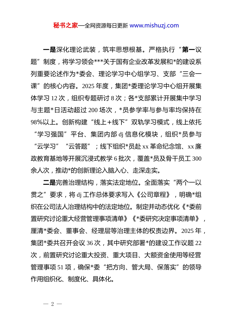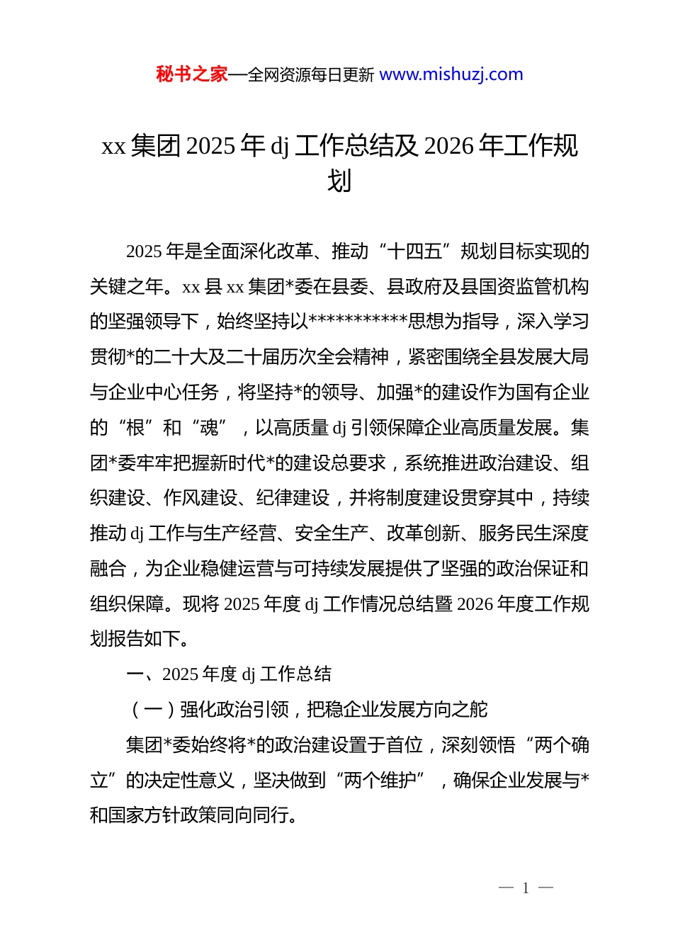 秘书之家—全网资源每日更新 www.mishuzj.comxx 集团 2025 年 dj 工作总结及 2026 年工作规划2025 年是全面深化改革、推动“十四五”规划目标实现的关键之年。xx 县 xx 集团*委在县委、县政府及县国资监管机构的坚强领导下,始终坚持以***********思想为指导,深入学习贯彻*的二十大及二十届历次全会精神,紧密围绕全县发展大局与企业中心任务,将坚持*的领导、加强*的建设作为国有企业的“根”和“魂”,以高质量 dj 引领保障企业高质量发展。集团*委牢牢把握新时代*的建设总要求,系统推进政治建设、组织建设、作风建设、纪律建设,并将制度建设贯穿其中,持续推动 dj 工作与生产经营、安全生产、改革创新、服务民生深度融合,为企业稳健运营与可持续发展提供了坚强的政治保证和组织保障。现将 2025 年度 dj 工作情况总结暨 2026 年度工作规划报告如下。一、2025 年度 dj 工作总结(一)强化政治引领,把稳企业发展方向之舵集团*委始终将*的政治建设置于首位,深刻领悟“两个确立”的决定性意义,坚决做到“两个维护”,确保企业发展与*和国家方针政策同向同行。— 1 —秘书之家—全网资源每日更新 www.mishuzj.com一是深化理论武装,筑牢思想根基。严格执行“第一议题”制度,将学习领会***关于国有企业改革发展和*的建设系列重要论述作为*委会、理论学习中心组学习、支部“三会一课”的核心内容。2025 年度,集团*委理论学习中心组开展集体学习 12 次,组织专题研讨 8 次;各*支部累计开展集中学习与主题*日活动超过 200 场次,*员参学率与参与率均保持在98%以上。创新构建“线上+线下”双轨学习模式,线上依托“学习强国”平台、集团内部 dj 信息化模块,组织*员参与“云学习”“云答题”;线下组织*员赴 xx 革命纪念馆、xx 廉政教育基地等开展沉浸式教学 6 批次,覆盖*员及骨干员工 300余人次,推动*的创新理论入脑入心、走深走实。二是完善治理结构,落实法定地位。全面落实“两个一以贯之”要求,将 dj 工作总体要求写入《公司章程》,明确*组织在公司法人治理结构中的法定地位。制定并动态优化《*委前置研究讨论重大经营管理事项清单》《*委研究决定事项清单》,厘清*委会、董事会、经理层等治理主体的权责边界。2025 年,集团*委共召开会议 36 次,其中研究部署*的建设工作议题 22次,前置研究讨论重大投资、重大项目、大额资金使用等经营管理事项 51 项,确保*委“把方向、管大局、保落实”的领导作用组织化、制度化、具体化。— 2 —秘书之家—全网资源每日更新 www.mishuzj.com三是严明政治纪律,压实主体责任。集团*委坚决扛起全面从严治*主体责任,*委书记认真履行第一责任人职责,班子成员严格落实“一岗双责”。年内组织召开年度*的建设暨*风廉政建设工作会议 2 次,专题研究全面从严治*工作 4 次。与下属各子公司、业务部门*组织负责人逐级签订《dj 工作目标责任书》与《*风廉政建设责任书》共计 35 份,将政治责任层层传导、压实到基层末梢。(二)夯实组织基础,锻造坚强有力战斗堡垒集团*委以提升组织力为重点,突出政治功能,持续推进基层*组织标准化规范化建设,着力将*的组织优势转化为企业发展优势。一是优化组织设置,实现全面覆盖。适应企业业务布局与结构调整,动态优化基层*组织设置,确保*的组织和工作覆盖到每个业务单元、项目一线。截至 2025 年底,集团*委下设*总支 2 个,*支部 18 个,实现了在工程建设、资产运营、公共服务、新兴业务等关键领域*组织的全覆盖。持续推进“五星级*支部”创建活动,年内新增达标*支部 5 个,累计创建“五星级*支部”12 个,占比达到 66.7%,基层*组织战斗堡垒作用显著增强。二是规范组织生活,激发队伍活力。严格执行“三会一— 3 —秘书之家—全网资源每日更新 www.mishuzj.com课”、组织生活会、民主评议*员、谈心谈话等制度,提高组织生活质量。创新开展“一支部一品牌”创建活动,各支部结合业务特点,打造了如“项目攻坚先锋队”“红色物业服务岗”“匠心运维示范班”等特色 dj 品牌,形成了“一个支部一座堡垒,一个品牌一面...