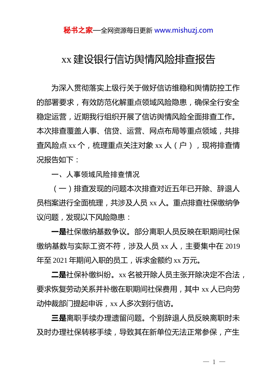 秘书之家—全网资源每日更新 www.mishuzj.comxx 建设银行信访舆情风险排查报告为深入贯彻落实上级行关于做好信访维稳和舆情防控工作的部署要求,有效防范化解重点领域风险隐患,确保全行安全稳定运营,近期我行组织开展了信访舆情风险全面排查工作。本次排查覆盖人事、信贷、运营、网点布局等重点领域,共排查风险点 xx 个,梳理重点关注对象 xx 人(户),现将排查情况报告如下:一、人事领域风险排查情况(一)排查发现的问题本次排查对近五年已开除、辞退人员档案进行全面梳理,共涉及人员 xx 人。重点排查社保缴纳争议问题,发现以下风险隐患:一是社保缴纳基数争议。部分离职人员反映在职期间社保缴纳基数与实际工资不符,涉及人员 xx 人,主要集中在 2019年至 2021 年期间入职的员工,诉求金额约 xx 万元。二是社保补缴纠纷。xx 名被开除人员主张开除决定不合法,要求恢复劳动关系并补缴在职期间社保费用,其中 xx 人已向劳动仲裁部门提起申诉,xx 人多次到行信访。三是离职手续办理遗留问题。个别辞退人员反映离职时未及时办理社保转移手续,导致其在新单位无法正常参保,产生— 1 —秘书之家—全网资源每日更新 www.mishuzj.com信访投诉意向。(二)风险研判该领域风险等级评定为“中等”。主要风险点在于:部分人员诉求持续时间较长,情绪较为激动,存在越级上访、网络发帖等风险;个别人员与其他离职人员相互串联,存在集体上访隐患(三)处置措施一是建立台账、分类施策。对排查出的 xx 人逐一建档,按照“合理诉求立即解决、历史遗留依规处理、无理诉求解释疏导”原则分类处置。二是主动约谈、化解矛盾。由人力资源部牵头,对重点关注对象逐一约谈,核实诉求、解释政策、协商解决方案,力争在行内化解矛盾。三是完善证据、依法应诉。对已进入仲裁程序的案件,组织力量完善相关证据材料,积极配合仲裁机构依法处理。四是加强监测、防止升级。将重点人员纳入监测名单,密切关注其动态,发现异常苗头及时预警处置。二、信贷领域风险排查情况(一)排查发现的问题本次对信贷业务进行全面排查,重点关注征信异议、收贷管理、贷款三查等环节,发现以下风险隐患:— 2 —秘书之家—全网资源每日更新 www.mishuzj.com一是征信异议投诉较为集中。一季度共受理征信异议申请xx 笔,其中涉及“被贷款”“被担保”投诉 xx 笔,逾期记录异议 xx 笔,信息错误异议 xx 笔。部分客户对异议处理结果不满意,扬言向监管部门投诉或网络曝光。二是收贷入账存在争议。排查发现 xx 笔贷款存在客户还款后未及时入账情况,涉及金额 xx 万元。其中 xx 笔因系统故障导致入账延迟,xx 笔因经办人员操作失误导致还款冲抵顺序错误,引发客户投诉。另有 xx 户客户反映提前还款后征信记录未及时更新,影响其后续贷款申请。三是贷款三查不到位引发纠纷。抽查发现 xx 笔贷款存在贷前调查不充分、贷中审查流于形式、贷后检查不及时等问题。其中 xx 笔因未充分核实借款人还款能力,贷款发放后客户即出现还款困难,客户以“银行未尽审慎义务”为由拒绝还款并投诉;xx 笔因贷后管理缺失,未及时发现借款人经营异常,导致贷款形成不良后客户以“银行未提前预警”为由缠访闹访。(二)风险研判该领域风险等级评定为“较高”。信贷领域投诉涉及客户切身利益,维权意识强,易引发监管投诉、网络舆情和群体性事件。特别是征信异议问题社会关注度高,处理不当易引发负面舆情扩散。— 3 —秘书之家—全网资源每日更新 www.mishuzj.com(三)处置措施一是快速响应征信异议。建立征信异议“绿色通道”,明确 5 个工作日内完成核查反馈。对“被贷款”“被担保”类投诉,立即启动内部核查,确属冒名贷款的及时报案处理并更正征信;对逾期记录异议,逐笔核实原因,符合条件的按规定申请更正。二是限时整改入账问题。对排查出的 xx 笔入账争议,由风险管理部牵头、相关支行配合,3 个工作日内完成核实整改,逐户向客户解释说明、取得谅解。同时开展系统排查,堵塞技术漏洞。三是规范贷款三查流程。针对三查不到位问题,开展信贷业务合规专项培训,强化贷前调查真...