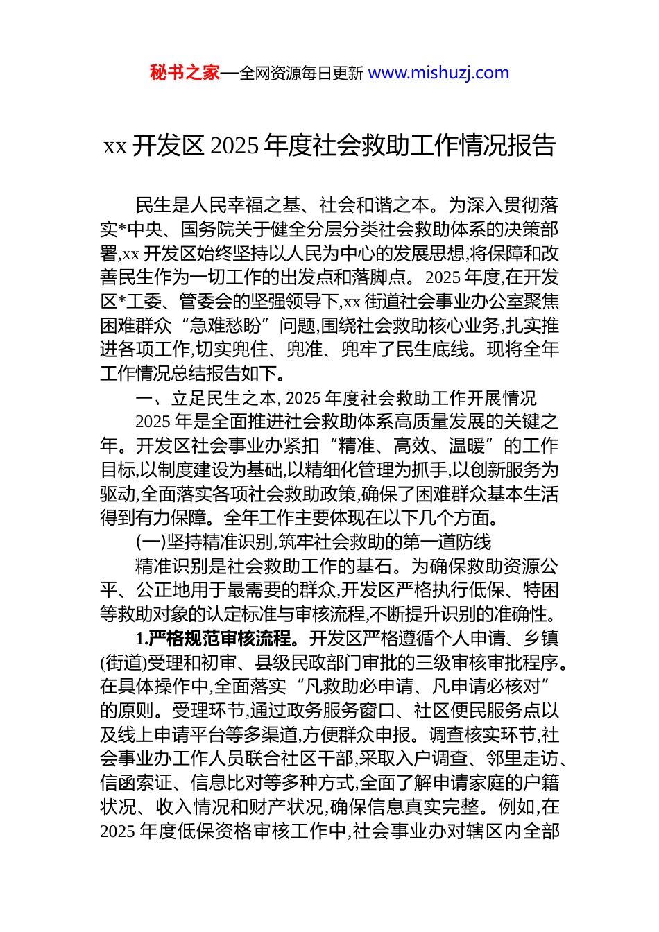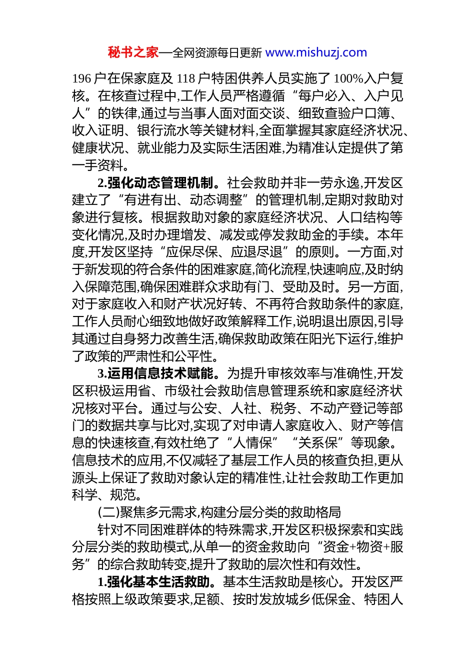 秘书之家—全网资源每日更新 www.mishuzj.comxx 开发区 2025 年度社会救助工作情况报告民生是人民幸福之基、社会和谐之本。为深入贯彻落实*中央、国务院关于健全分层分类社会救助体系的决策部署,xx 开发区始终坚持以人民为中心的发展思想,将保障和改善民生作为一切工作的出发点和落脚点。2025 年度,在开发区*工委、管委会的坚强领导下,xx 街道社会事业办公室聚焦困难群众“急难愁盼”问题,围绕社会救助核心业务,扎实推进各项工作,切实兜住、兜准、兜牢了民生底线。现将全年工作情况总结报告如下。一、立足民生之本,2025 年度社会救助工作开展情况2025 年是全面推进社会救助体系高质量发展的关键之年。开发区社会事业办紧扣“精准、高效、温暖”的工作目标,以制度建设为基础,以精细化管理为抓手,以创新服务为驱动,全面落实各项社会救助政策,确保了困难群众基本生活得到有力保障。全年工作主要体现在以下几个方面。(一)坚持精准识别,筑牢社会救助的第一道防线精准识别是社会救助工作的基石。为确保救助资源公平、公正地用于最需要的群众,开发区严格执行低保、特困等救助对象的认定标准与审核流程,不断提升识别的准确性。1.严格规范审核流程。开发区严格遵循个人申请、乡镇(街道)受理和初审、县级民政部门审批的三级审核审批程序。在具体操作中,全面落实“凡救助必申请、凡申请必核对”的原则。受理环节,通过政务服务窗口、社区便民服务点以及线上申请平台等多渠道,方便群众申报。调查核实环节,社会事业办工作人员联合社区干部,采取入户调查、邻里走访、信函索证、信息比对等多种方式,全面了解申请家庭的户籍状况、收入情况和财产状况,确保信息真实完整。例如,在2025 年度低保资格审核工作中,社会事业办对辖区内全部秘书之家—全网资源每日更新 www.mishuzj.com196 户在保家庭及 118 户特困供养人员实施了 100%入户复核。在核查过程中,工作人员严格遵循“每户必入、入户见人”的铁律,通过与当事人面对面交谈、细致查验户口簿、收入证明、银行流水等关键材料,全面掌握其家庭经济状况、健康状况、就业能力及实际生活困难,为精准认定提供了第一手资料。2.强化动态管理机制。社会救助并非一劳永逸,开发区建立了“有进有出、动态调整”的管理机制,定期对救助对象进行复核。根据救助对象的家庭经济状况、人口结构等变化情况,及时办理增发、减发或停发救助金的手续。本年度,开发区坚持“应保尽保、应退尽退”的原则。一方面,对于新发现的符合条件的困难家庭,简化流程,快速响应,及时纳入保障范围,确保困难群众求助有门、受助及时。另一方面,对于家庭收入和财产状况好转、不再符合救助条件的家庭,工作人员耐心细致地做好政策解释工作,说明退出原因,引导其通过自身努力改善生活,确保救助政策在阳光下运行,维护了政策的严肃性和公平性。3.运用信息技术赋能。为提升审核效率与准确性,开发区积极运用省、市级社会救助信息管理系统和家庭经济状况核对平台。通过与公安、人社、税务、不动产登记等部门的数据共享与比对,实现了对申请人家庭收入、财产等信息的快速核查,有效杜绝了“人情保”“关系保”等现象。信息技术的应用,不仅减轻了基层工作人员的核查负担,更从源头上保证了救助对象认定的精准性,让社会救助工作更加科学、规范。(二)聚焦多元需求,构建分层分类的救助格局针对不同困难群体的特殊需求,开发区积极探索和实践分层分类的救助模式,从单一的资金救助向“资金+物资+服务”的综合救助转变,提升了救助的层次性和有效性。1.强化基本生活救助。基本生活救助是核心。开发区严格按照上级政策要求,足额、按时发放城乡低保金、特困人秘书之家—全网资源每日更新 www.mishuzj.com员供养金。截至 2025 年 12 月,开发区累计为 196 户低保家庭和 118 名特困供养人员发放救助金及补贴,总计投入资金约xx 万元,有力保障了他们的基本生活。同时,根据经济社会发展水平和物价变动情况,适时启动社会救助和保障标准与物价上涨挂钩联动机制,确保困难群众的生活水平不因物价上涨而降低。2.精准实施专项社会救助。在做好基本生活保障的基础上,开发区针对困难群众在医疗、教育、住房、就...