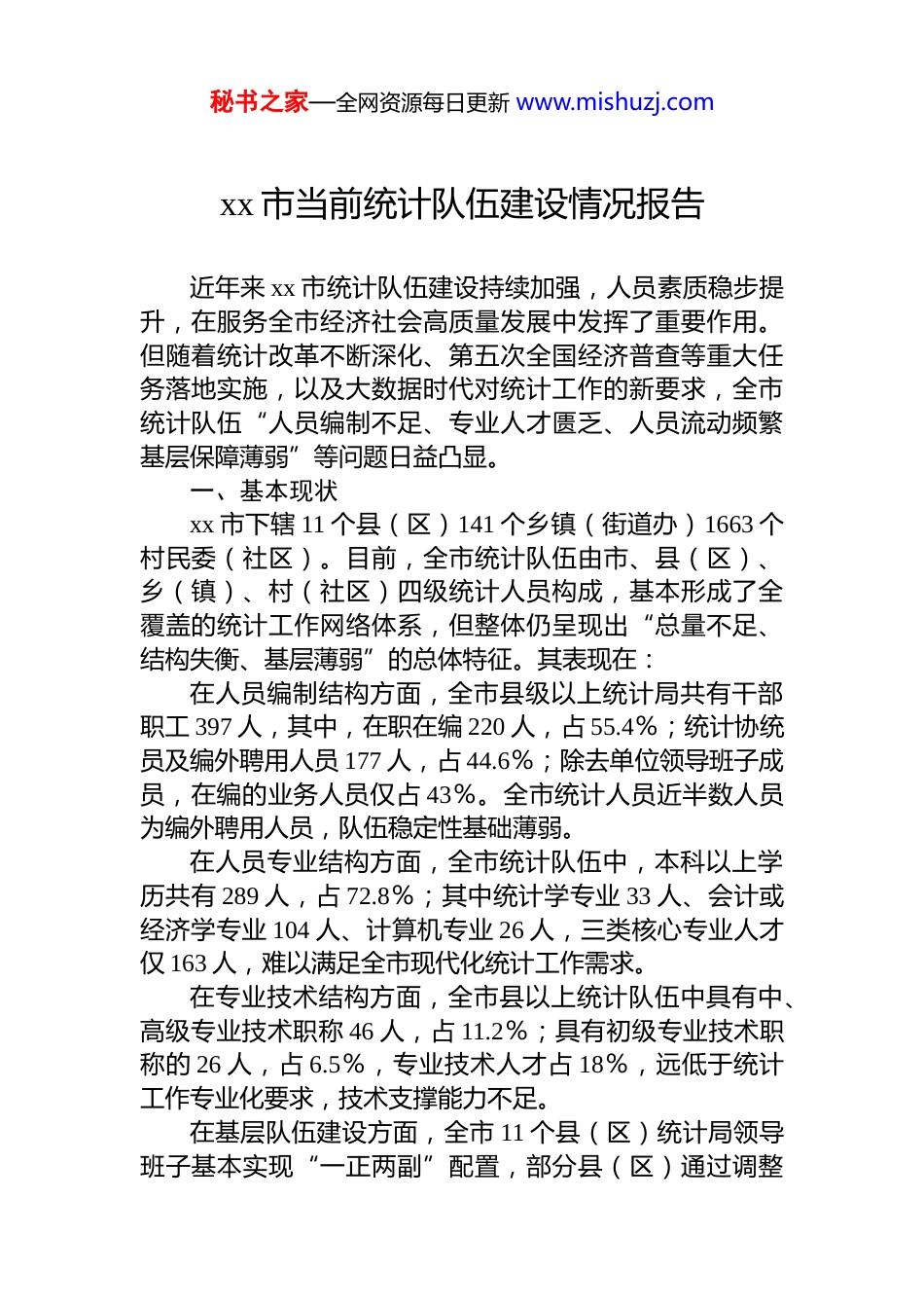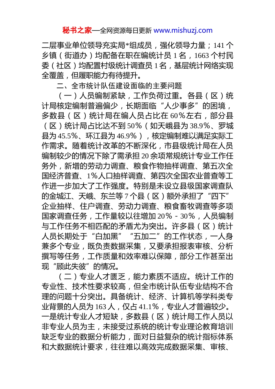秘书之家—全网资源每日更新 www.mishuzj.comxx 市当前统计队伍建设情况报告近年来 xx 市统计队伍建设持续加强,人员素质稳步提升,在服务全市经济社会高质量发展中发挥了重要作用。但随着统计改革不断深化、第五次全国经济普查等重大任务落地实施,以及大数据时代对统计工作的新要求,全市统计队伍“人员编制不足、专业人才匮乏、人员流动频繁基层保障薄弱”等问题日益凸显。一、基本现状xx 市下辖 11 个县(区)141 个乡镇(街道办)1663 个村民委(社区)。目前,全市统计队伍由市、县(区)、乡(镇)、村(社区)四级统计人员构成,基本形成了全覆盖的统计工作网络体系,但整体仍呈现出“总量不足、结构失衡、基层薄弱”的总体特征。其表现在:在人员编制结构方面,全市县级以上统计局共有干部职工 397 人,其中,在职在编 220 人,占 55.4%;统计协统员及编外聘用人员 177 人,占 44.6%;除去单位领导班子成员,在编的业务人员仅占 43%。全市统计人员近半数人员为编外聘用人员,队伍稳定性基础薄弱。在人员专业结构方面,全市统计队伍中,本科以上学历共有 289 人,占 72.8%;其中统计学专业 33 人、会计或经济学专业 104 人、计算机专业 26 人,三类核心专业人才仅 163 人,难以满足全市现代化统计工作需求。在专业技术结构方面,全市县以上统计队伍中具有中、高级专业技术职称 46 人,占 11.2%;具有初级专业技术职称的 26 人,占 6.5%,专业技术人才占 18%,远低于统计工作专业化要求,技术支撑能力不足。在基层队伍建设方面,全市 11 个县(区)统计局领导班子基本实现“一正两副”配置,部分县(区)通过调整秘书之家—全网资源每日更新 www.mishuzj.com二层事业单位领导充实局*组成员,强化领导力量;141 个乡镇(街道办)均配备在职在编统计员 1 名,1663 个村民委(社区)均配置村级统计调查员 1 名,基层统计网络实现全覆盖,但履职能力有待提升。二、全市统计队伍建设面临的主要问题(一)人员编制紧缺,工作负荷过重。各县(区)统计局核定编制普遍偏少,长期面临“人少事多”的困境,多数县(区)统计局在编人员占比在 60%左右,部分县(区)统计局占比达不到 50%(如天峨县为 38.9%、罗城县为 45.5%、环江县为 46.9%),核定编制难以满足实际工作需求。随着统计改革的不断深化,市县级统计局在人员编制较少的情况下除了需承担 20 余项常规统计专业工作任务外,新增的劳动力调查、粮食作物抽样调查、第五次全国经济普查、1%人口抽样调查、第四次全国农业普查等工作进一步加大了工作强度。特别是未设立县级国家调查队的金城江、天峨、东兰等 7 个县(区)额外承担了“四下”企业抽样、住户调查、劳动力调查、粮食畜牧调查等多项国家调查任务,工作量较以往增加 20%-30%,人员编制与工作任务不相匹配的矛盾尤为突出。许多县(区)统计人员长期处于“白加黑”“五加二”的工作状态,一人身兼多个专业,既负责数据采集,又要承担报表审核、分析撰写等任务,工作质量和效率难以保障,部分工作甚至出现“顾此失彼”的情况。(二)专业人才匮乏,能力素质不适应。统计工作的专业性、技术性要求较高,但全市统计队伍专业结构不合理的问题十分突出。具备统计、经济、计算机等学科类专业背景的人员为 163 人,仅占 41.1%,专业人才普遍较少。一是统计专业人才短缺,多数县(区)统计局工作人员以非专业人员为主,未接受过系统的统计专业理论教育培训缺乏专业的数据分析能力,面对日益复杂的统计指标体系和大数据统计要求,往往难以高效完成数据采集、审核、秘书之家—全网资源每日更新 www.mishuzj.com分析等工作。多数工作人员对统计指标理解不深、统计方法运用不熟练,在数据审核、逻辑校验、分析研判等方面能力不足;二是计算机专业人才稀缺,面对企业电子台账建设、大数据统计分析等现代化统计工作要求,缺乏能够熟练操作统计软件、处理海量数据的技术人才,导致部分统计信息化工作推进缓慢;部分村级统计调查员甚至不熟练运用计算机软件进行数据汇总,导致源头数据易出现“指标混淆”“...