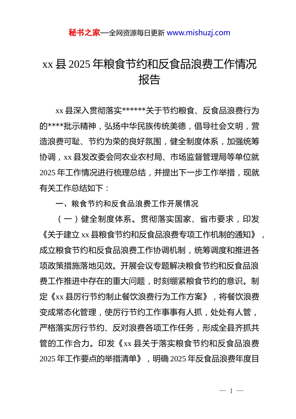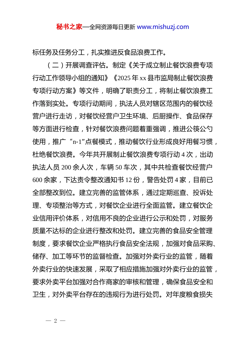 秘书之家—全网资源每日更新 www.mishuzj.comxx 县 2025 年粮食节约和反食品浪费工作情况报告xx 县深入贯彻落实******关于节约粮食、反食品浪费行为的****批示精神,弘扬中华民族传统美德,倡导社会文明,营造浪费可耻、节约为荣的良好氛围,健全制度体系,加强统筹协调,xx 县发改委会同农业农村局、市场监督管理局等单位就2025 年工作情况进行梳理总结,并提出下一步工作举措,现就有关工作总结如下:一、粮食节约和反食品浪费工作开展情况(一)健全制度体系。贯彻落实国家、省市要求,印发《关于建立 xx 县粮食节约和反食品浪费专项工作机制的通知》,成立粮食节约和反食品浪费工作协调机制,统筹调度和推进各项政策措施落地见效。开展会议专题解决粮食节约和反食品浪费工作推进中存在的重大问题,时刻绷紧粮食节约的意识。制定《xx 县厉行节约制止餐饮浪费行为工作方案》,将餐饮浪费变成常态化管理,使厉行节约工作事事有人抓,处处有人管,严格落实厉行节约、反对浪费各项工作任务,形成全县齐抓共管的工作合力。印发《xx 县关于落实粮食节约和反食品浪费2025 年工作要点的举措清单》,明确 2025 年反食品浪费年度目— 1 —秘书之家—全网资源每日更新 www.mishuzj.com标任务及任务分工,扎实推进反食品浪费工作。(二)开展调查评估。制定《关于成立制止餐饮浪费专项行动工作领导小组的通知》《2025 年 xx 县市监局制止餐饮浪费专项行动方案》等文件,明确了职责分工,将制止餐饮浪费工作落到实处。专项行动期间,执法人员对辖区范围内的餐饮经营户进行走访,对餐饮经营户卫生环境、后厨操作、食品保存等方面进行检查,针对餐饮浪费问题着重强调,推进公筷公勺使用,推广“n-1”点餐模式,推动餐饮行业形成良好用餐习惯,杜绝餐饮浪费。今年共开展制止餐饮浪费专项行动 4 次,出动执法人员 200 余人次,车辆 50 车次,其中共检查餐饮经营户600 余家,下达责令整改通知书 12 份,警告处罚 4 家,目前已全部整改到位。建立完善的监管体系,通过定期巡查、投诉处理、专项整治等方式,对餐饮企业进行全面监管。建立餐饮企业信用评价体系,对信用不良的企业进行公示和处罚,对服务质量不达标的企业进行整改和处罚。建立完善的食品安全管理制度,要求餐饮企业严格执行食品安全法规,加强对食品采购、储存、加工等环节的监督检查。加强对外卖行业的监管,随着外卖行业的快速发展,采取了相应措施加强对外卖行业的监管,要求外卖平台加强对合作商家的审核和管理,确保食品安全和卫生,对外卖平台存在的违规行为进行处罚。对年度粮食损失— 2 —秘书之家—全网资源每日更新 www.mishuzj.com和食品浪费情况进行监测、调查、分析和评估,形成了年度粮食生产加工环节损失和储存流通环节损失损耗、餐饮环节食品浪费等调查数据报告并按时报送。(三)深入开展宣传。推进反食品浪费宣传。充分利用互联网、电视、广播、广告等媒体平台,发布了大量的反食品浪费宣传内容。推进反食品浪费进机关,对厉行节约坚决制止餐饮浪费行为相关文件精神进行传达学习,号召全体干部职工从自身做起,引导干部职工争做倡导绿色生活、反对铺张浪费的践行者、传播者和监督者。深入开展文明用餐宣传活动,杜绝“舌尖上的浪费”,让厉行节约观念和餐桌文明之风入脑入心。在楼道内悬挂“厉行节约、反对浪费”、“光盘行动”的宣传牌,在微信工作群转发相关媒体“厉行节约、反对浪费”文章等,组织志愿者入户宣讲,向帮扶群众宣传文明餐桌文化。推进反食品浪费进学校,通过开展食品安全教育课等活动,校园内张贴食品安全和反食品浪费相关宣传标语,利用校园内的广播、电子显示屏等宣传阵地,广泛地向全体师生宣传和普及了食品安全知识。开展食品安全主题班会,组织各班学生参与“制止餐饮浪费倡议书”签字活动,组织师生开展“光盘行动”,养成节粮爱粮,勤俭节约的行为习惯。开展了以“尚俭崇信尽贵,同心共护食品安全”为主题的食品安全周宣传活动,— 3 —秘书之家—全网资源每日更新 www.mishuzj.com宣传活动形式多样,组织开展了放心超市食品销售公开承诺、“餐饮安全...