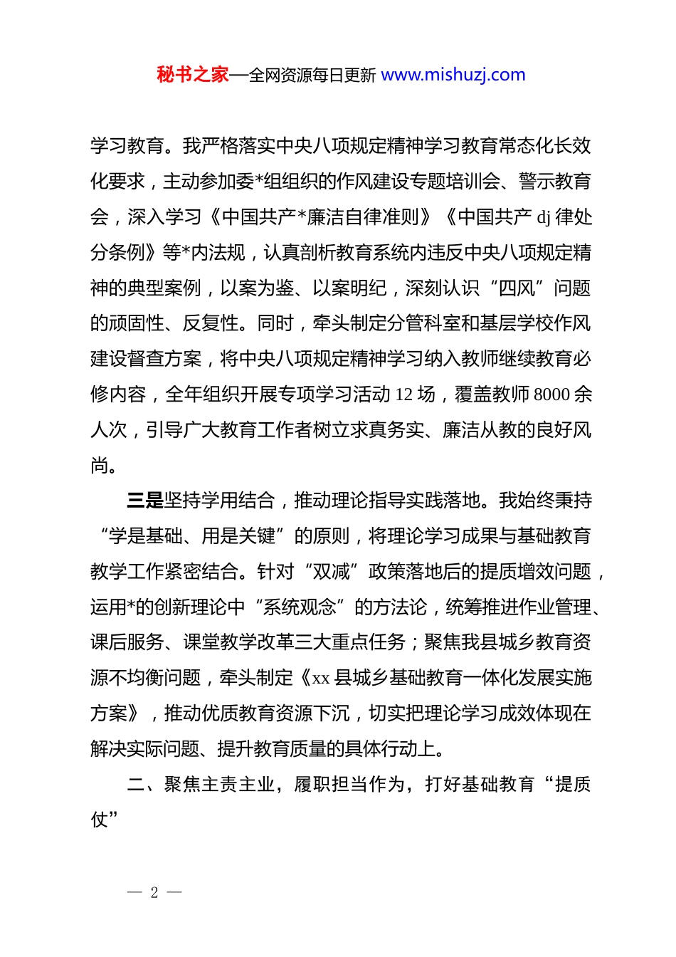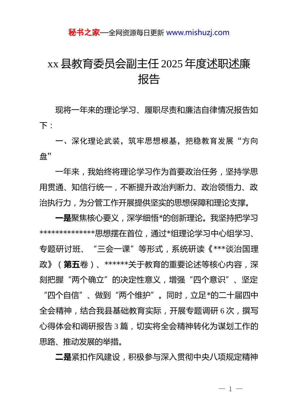 秘书之家—全网资源每日更新 www.mishuzj.comxx 县教育委员会副主任 2025 年度述职述廉报告现将一年来的理论学习、履职尽责和廉洁自律情况报告如下:一、深化理论武装,筑牢思想根基,把稳教育发展“方向盘”一年来,我始终将理论学习作为首要政治任务,坚持学思用贯通、知信行统一,不断提升政治判断力、政治领悟力、政治执行力,为分管工作开展提供坚实的思想保障和理论支撑。一是聚焦核心要义,深学细悟*的创新理论。我坚持把学习**************思想摆在首位,通过*组理论学习中心组学习、专题研讨班、“三会一课”等形式,系统研读《***谈治国理政》(第五卷)、******关于教育的重要论述等核心内容,深刻把握“两个确立”的决定性意义,增强“四个意识”、坚定“四个自信”、做到“两个维护”。同时,立足*的二十届四中全会精神,结合我县基础教育实际,开展专题调研 6 次,撰写心得体会和调研报告 3 篇,切实将全会精神转化为谋划工作的思路、推动发展的举措。二是紧扣作风建设,积极参与深入贯彻中央八项规定精神— 1 —秘书之家—全网资源每日更新 www.mishuzj.com学习教育。我严格落实中央八项规定精神学习教育常态化长效化要求,主动参加委*组组织的作风建设专题培训会、警示教育会,深入学习《中国共产*廉洁自律准则》《中国共产 dj 律处分条例》等*内法规,认真剖析教育系统内违反中央八项规定精神的典型案例,以案为鉴、以案明纪,深刻认识“四风”问题的顽固性、反复性。同时,牵头制定分管科室和基层学校作风建设督查方案,将中央八项规定精神学习纳入教师继续教育必修内容,全年组织开展专项学习活动 12 场,覆盖教师 8000 余人次,引导广大教育工作者树立求真务实、廉洁从教的良好风尚。三是坚持学用结合,推动理论指导实践落地。我始终秉持“学是基础、用是关键”的原则,将理论学习成果与基础教育教学工作紧密结合。针对“双减”政策落地后的提质增效问题,运用*的创新理论中“系统观念”的方法论,统筹推进作业管理、课后服务、课堂教学改革三大重点任务;聚焦我县城乡教育资源不均衡问题,牵头制定《xx 县城乡基础教育一体化发展实施方案》,推动优质教育资源下沉,切实把理论学习成效体现在解决实际问题、提升教育质量的具体行动上。二、聚焦主责主业,履职担当作为,打好基础教育“提质仗”— 2 —秘书之家—全网资源每日更新 www.mishuzj.com作为分管基础教育教学工作的副主任,我始终牢记立德树人根本任务,以*的二十届四中全会精神为指引,以提升教育教学质量为核心,以促进教育公平为目标,真抓实干、攻坚克难,推动我县基础教育事业迈上新台阶。(一)深化思政教育改革,落实立德树人根本任务。我坚持把思想政治教育贯穿教育教学全过程,牵头构建“大思政课”育人格局。一是推进思政课一体化建设。组织县域内中小学思政课教师开展集体备课、教学观摩活动 15 场,开发符合我县学情的思政校本课程 12 门,实现小学、初中、高中思政课内容有效衔接。二是强化思政实践育人。结合我县红色教育资源,组织开展“传承红色基因,争做时代新人”zt 教育活动,全年累计组织学生参观革命纪念馆、烈士陵园等红色教育基地 2000余人次,让思政教育走出课堂、走进生活。三是健全协同育人机制。牵头成立 xx 县家校社协同育人指导中心,组建家庭教育讲师团,开展家庭教育讲座 30 场,覆盖家长 1.2 万人次,形成家校社共育合力。(二)推进课堂教学改革,提升基础教育教学质量。我聚焦“双减”背景下课堂教学主阵地作用的发挥,大力推进课堂教学改革。一是实施课堂教学提质行动。组织开展“高效课堂”评比活动,全县中小学共推出示范课、公开课 200 余节,— 3 —秘书之家—全网资源每日更新 www.mishuzj.com评选出优秀教学案例 80 个,推广“情境教学”“项目式学习”等高效教学模式。二是加强作业设计与管理。牵头制定《xx 县中小学作业管理实施细则》,建立作业公示制度,组织开展作业设计大赛,评选优秀作业设计案例 100 个,推动作业从“量的积累”向“质的提升”转变,切实减轻学生过重作业负担。三是优化课后服务供给...