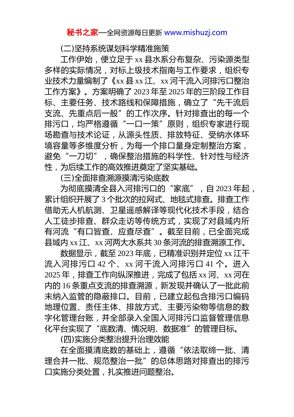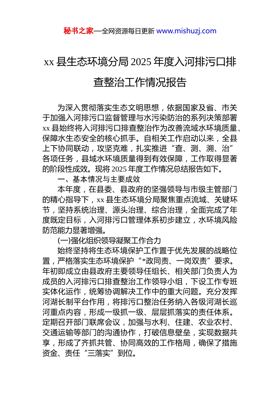 秘书之家—全网资源每日更新 www.mishuzj.comxx 县生态环境分局 2025 年度入河排污口排查整治工作情况报告为深入贯彻落实生态文明思想,依据国家及省、市关于加强入河排污口监督管理与水污染防治的系列决策部署xx 县始终将入河排污口排查整治作为改善流域水环境质量、保障水生态安全的核心抓手。自相关工作启动以来,全县上下协同联动,攻坚克难,扎实推进“查、测、溯、治”各项任务,县域水环境质量得到有效保障,工作取得显著的阶段性成效。现将 2025 年度工作情况总结报告如下。一、基本情况与主要成效本年度,在县委、县政府的坚强领导与市级主管部门的精心指导下,xx 县生态环境分局聚焦重点流域、关键环节,坚持系统治理、源头治理、综合治理,全面完成了年度既定目标,入河排污口管理体系初步建立,水环境风险防范能力显著增强。(一)强化组织领导凝聚工作合力始终坚持将生态环境保护工作置于优先发展的战略位置,严格落实生态环境保护“*政同责、一岗双责”要求。年初即成立由县政府主要领导任组长、相关部门负责人为成员的入河排污口排查整治工作领导小组,下设工作专班实体化运作,统筹协调解决工作中的重大问题。充分发挥河湖长制平台作用,将排污口整治任务纳入各级河湖长巡河重点内容,形成一级抓一级、层层抓落实的责任体系。定期召开部门联席会议,加强与水利、住建、农业农村、交通运输等部门的沟通协作,打破信息壁垒,实现数据共享,形成了齐抓共管、协同高效的工作格局,确保了措施资金、责任“三落实”到位。秘书之家—全网资源每日更新 www.mishuzj.com(二)坚持系统谋划科学精准施策工作伊始,便立足于 xx 县水系分布复杂、污染源类型多样的实际情况,对标上级技术指南与工作要求,组织专业技术力量编制了《xx 县 xx 江、xx 河干流入河排污口整治工作方案》。方案明确了 2023 年至 2025 年的三阶段工作目标、主要任务、技术路线和保障措施,确立了“先干流后支流、先重点后一般”的工作次序。针对排查出的每一个排污口,均严格遵循“一口一策”原则,组织专家进行现场勘查与技术论证,从源头性质、排放特征、受纳水体环境容量等多维度分析,为每一个排口量身定制整治方案,避免“一刀切”,确保整治措施的科学性、针对性与经济性,为后续工作的高效推进奠定了坚实基础。(三)全面排查溯源摸清污染底数为彻底摸清全县入河排污口的“家底”,自 2023 年起,累计组织开展了 3 个批次的拉网式、地毯式排查。排查工作借助无人机航测、卫星遥感解译等现代化技术手段,结合人工徒步排查、群众走访等传统方式,实现了对县域内所有河流“有口皆查、应查尽查”。截至目前,已全面完成县域内 xx 江、xx 河两大水系共 30 条河流的排查溯源工作。数据显示,截至 2023 年底,已精准识别并定位 xx 江干流入河排污口 42 个、xx 河干流入河排污口 41 个。进入2025 年,排查工作向纵深推进,完成了包括 xx 河、xx 河在内的 16 条重点支流的排查溯源,新发现并确认了一批此前未纳入监管的隐蔽排口。目前,已建立起包含排污口编码地理位置、责任主体、排放方式、主要污染物等信息的数字化管理台账,并全部录入全国入河排污口监督管理信息化平台实现了“底数清、情况明、数据准”的管理目标。(四)实施分类整治提升治理效能在全面摸清底数的基础上,遵循“依法取缔一批、清理合并一批、规范整治一批”的总体思路对排查出的排污口实施分类处置,扎实推进问题整治。秘书之家—全网资源每日更新 www.mishuzj.com一是依法取缔。对未经审批、手续不全的非法排污口,特别是对水环境影响恶劣的工业废水、规模化养殖废水直排口,坚决予以取缔。累计取缔各类非法排污口 28 个,从源头上切断了污染途径。二是清理合并。针对城镇建成区及周边区域布局分散、管理困难的生活污水散排口,通过延伸和完善市政污水收集管网,将其统一接入城镇污水处理厂进行集中处理。对部分距离管网较远的村庄,则采取建设小型一体化处理设施或生态湿地的形式,实现污水的集中收集与处理。此项措施共计整合归并排污口 45 个,有效提升了污水收集处理效率。三是规范...