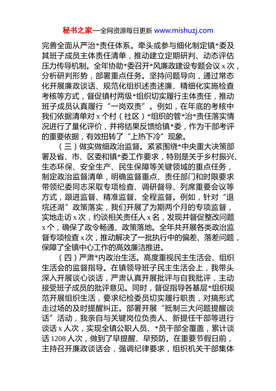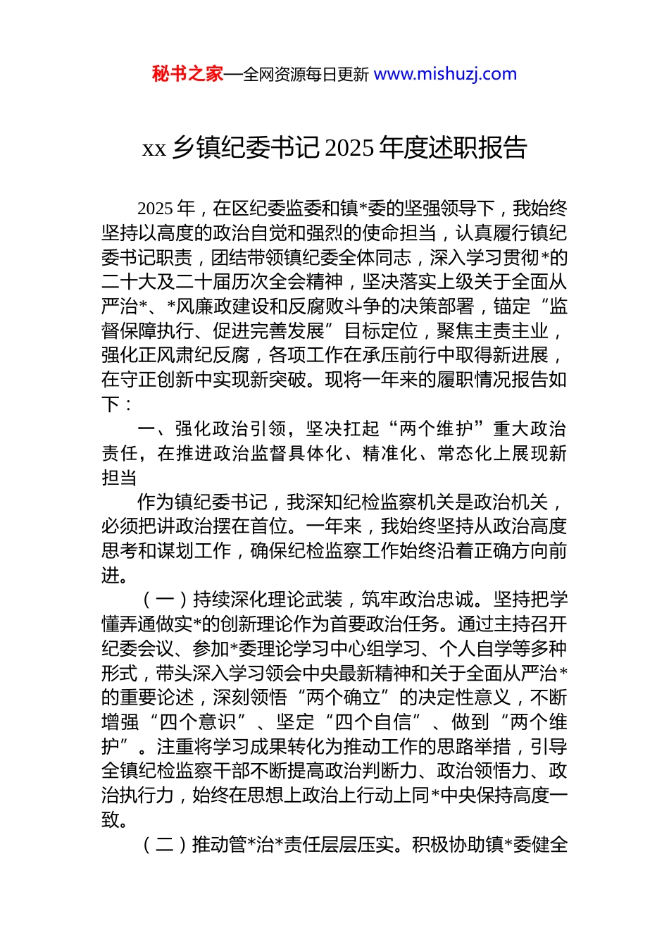 秘书之家—全网资源每日更新 www.mishuzj.comxx 乡镇纪委书记 2025 年度述职报告2025 年,在区纪委监委和镇*委的坚强领导下,我始终坚持以高度的政治自觉和强烈的使命担当,认真履行镇纪委书记职责,团结带领镇纪委全体同志,深入学习贯彻*的二十大及二十届历次全会精神,坚决落实上级关于全面从严治*、*风廉政建设和反腐败斗争的决策部署,锚定“监督保障执行、促进完善发展”目标定位,聚焦主责主业,强化正风肃纪反腐,各项工作在承压前行中取得新进展,在守正创新中实现新突破。现将一年来的履职情况报告如下:一、强化政治引领,坚决扛起“两个维护”重大政治责任,在推进政治监督具体化、精准化、常态化上展现新担当作为镇纪委书记,我深知纪检监察机关是政治机关,必须把讲政治摆在首位。一年来,我始终坚持从政治高度思考和谋划工作,确保纪检监察工作始终沿着正确方向前进。(一)持续深化理论武装,筑牢政治忠诚。坚持把学懂弄通做实*的创新理论作为首要政治任务。通过主持召开纪委会议、参加*委理论学习中心组学习、个人自学等多种形式,带头深入学习领会中央最新精神和关于全面从严治*的重要论述,深刻领悟“两个确立”的决定性意义,不断增强“四个意识”、坚定“四个自信”、做到“两个维护”。注重将学习成果转化为推动工作的思路举措,引导全镇纪检监察干部不断提高政治判断力、政治领悟力、政治执行力,始终在思想上政治上行动上同*中央保持高度一致。(二)推动管*治*责任层层压实。积极协助镇*委健全秘书之家—全网资源每日更新 www.mishuzj.com完善全面从严治*责任体系。牵头或参与细化制定镇*委及其班子成员主体责任清单,推动建立定期研判、动态评估压力传导机制。全年协助*委召开*风廉政建设专题会议 x 次,分析研判形势,部署重点任务。坚持问题导向,通过常态化开展廉政谈话、规范化组织述责述廉、精细化实施检查考核等方式,督促镇村两级*组织切实履行主体责任,推动班子成员认真履行“一岗双责”。例如,在年底的考核中我们依据清单对 x 个村(社区)*组织的管*治*责任落实情况进行了量化评价,并将结果反馈给镇*委,作为干部考评的重要依据,有效扭转了“上热下冷”现象。(三)做实做细政治监督。紧紧围绕*中央重大决策部署及省、市、区委和镇*委工作要求,特别是关于乡村振兴、生态环保、安全生产、民生保障等关键领域的重点任务,制定政治监督清单,明确监督重点、责任部门和时限要求带领纪委同志采取专项检查、调研督导、列席重要会议等方式,跟进监督、精准监督、全程监督。例如,针对“退垸还湖”政策落实,我们开展了为期两个月的专项监督,实地走访 x 次,约谈相关责任人 x 名,发现并督促整改问题x 个,确保了政令畅通、政策落地。全年共开展各类政治监督专项检查 x 次,推动解决了一批执行中的偏差、落差问题,保障了全镇中心工作的高效廉洁推进。(四)严肃*内政治生活。高度重视民主生活会、组织生活会的监督指导。在镇领导班子民主生活会上,我带头深入开展谈心谈话,严肃认真开展批评与自我批评,主动接受班子成员的批评意见。同时,督促指导各基层*组织规范开展组织生活,要求纪检委员切实履行职责,对搞形式走过场的及时提醒纠正。部署开展“抵制三大问题提醒谈话”活动,我亲自与关键岗位负责人、新提任干部等进行谈话 x 人次,实现全镇公职人员、*员干部全覆盖,累计谈话 1208 人次,做到了早提醒、早预防。在重要节假日前,主持召开廉政谈话会,强调纪律要求,组织机关干部集体秘书之家—全网资源每日更新 www.mishuzj.com签署廉洁过节倡议书,让清廉之风常吹不懈。二、坚持严的基调,一体推进不敢腐、不能腐、不想腐,在巩固拓展正风肃纪反腐成果上实现新突破我深刻认识到,反腐败斗争形势依然严峻复杂,必须永远吹冲锋号。一年来,我始终坚持严字当头、全面从严一严到底,持续深化正风肃纪反腐。(一)锲而不舍落实中央八项规定精神,纠治“四风”顽疾。将监督落实中央八项规定及其实施细则精神作为经常性工作来抓。紧盯元旦、春节、五一、端午、中秋国庆等重要节点,制定作风监督方案,亲自带队或组织力...
