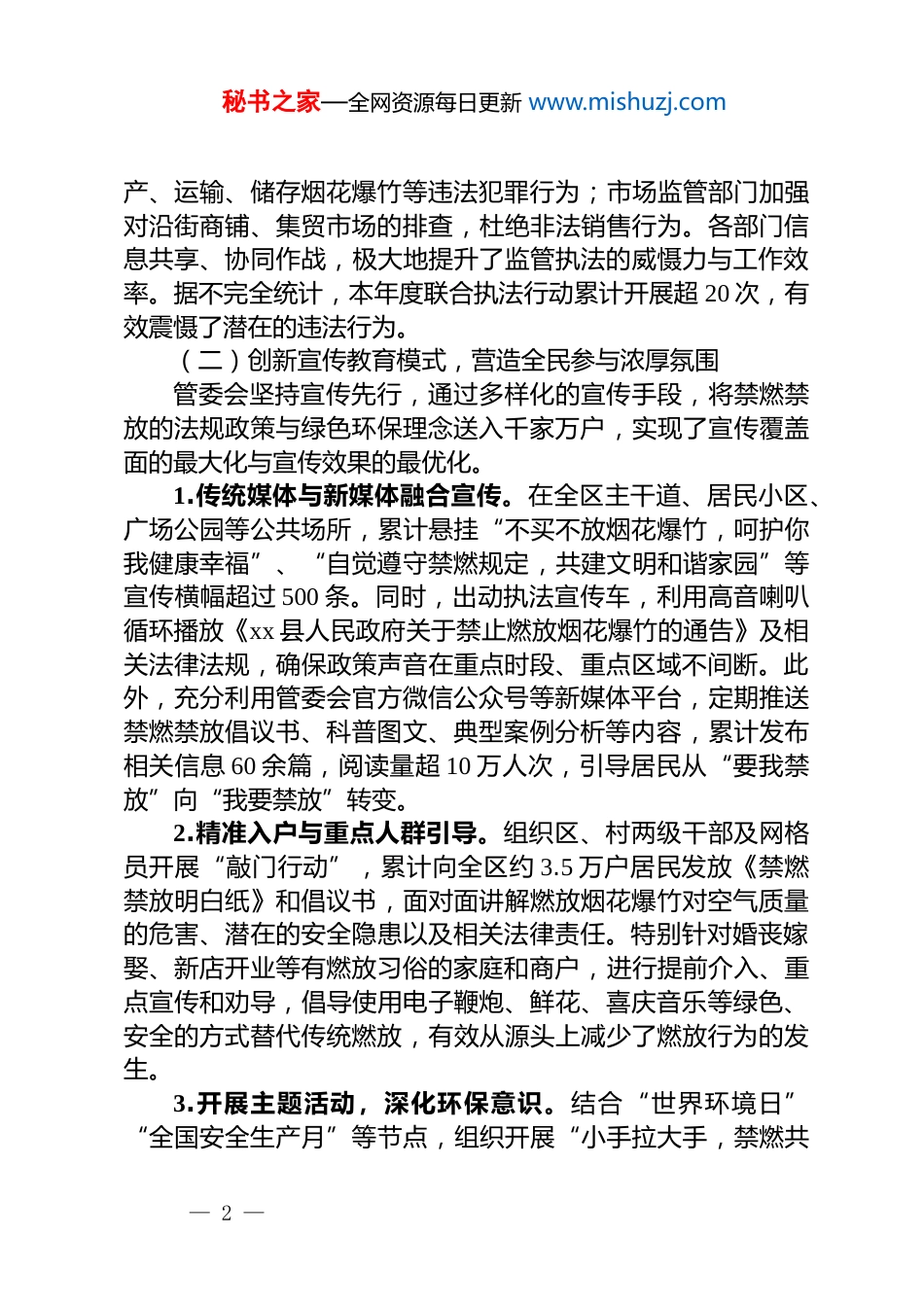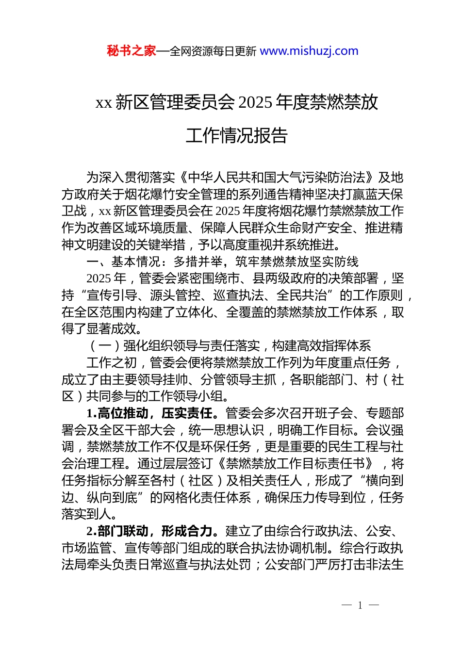 秘书之家—全网资源每日更新 www.mishuzj.comxx 新区管理委员会 2025 年度禁燃禁放工作情况报告为深入贯彻落实《中华人民共和国大气污染防治法》及地方政府关于烟花爆竹安全管理的系列通告精神坚决打赢蓝天保卫战,xx 新区管理委员会在 2025 年度将烟花爆竹禁燃禁放工作作为改善区域环境质量、保障人民群众生命财产安全、推进精神文明建设的关键举措,予以高度重视并系统推进。一、基本情况:多措并举,筑牢禁燃禁放坚实防线2025 年,管委会紧密围绕市、县两级政府的决策部署,坚持“宣传引导、源头管控、巡查执法、全民共治”的工作原则,在全区范围内构建了立体化、全覆盖的禁燃禁放工作体系,取得了显著成效。(一)强化组织领导与责任落实,构建高效指挥体系工作之初,管委会便将禁燃禁放工作列为年度重点任务,成立了由主要领导挂帅、分管领导主抓,各职能部门、村(社区)共同参与的工作领导小组。1.高位推动,压实责任。管委会多次召开班子会、专题部署会及全区干部大会,统一思想认识,明确工作目标。会议强调,禁燃禁放工作不仅是环保任务,更是重要的民生工程与社会治理工程。通过层层签订《禁燃禁放工作目标责任书》,将任务指标分解至各村(社区)及相关责任人,形成了“横向到边、纵向到底”的网格化责任体系,确保压力传导到位,任务落实到人。2.部门联动,形成合力。建立了由综合行政执法、公安、市场监管、宣传等部门组成的联合执法协调机制。综合行政执法局牵头负责日常巡查与执法处罚;公安部门严厉打击非法生— 1 —秘书之家—全网资源每日更新 www.mishuzj.com产、运输、储存烟花爆竹等违法犯罪行为;市场监管部门加强对沿街商铺、集贸市场的排查,杜绝非法销售行为。各部门信息共享、协同作战,极大地提升了监管执法的威慑力与工作效率。据不完全统计,本年度联合执法行动累计开展超 20 次,有效震慑了潜在的违法行为。(二)创新宣传教育模式,营造全民参与浓厚氛围管委会坚持宣传先行,通过多样化的宣传手段,将禁燃禁放的法规政策与绿色环保理念送入千家万户,实现了宣传覆盖面的最大化与宣传效果的最优化。1.传统媒体与新媒体融合宣传。在全区主干道、居民小区、广场公园等公共场所,累计悬挂“不买不放烟花爆竹,呵护你我健康幸福”、“自觉遵守禁燃规定,共建文明和谐家园”等宣传横幅超过 500 条。同时,出动执法宣传车,利用高音喇叭循环播放《xx 县人民政府关于禁止燃放烟花爆竹的通告》及相关法律法规,确保政策声音在重点时段、重点区域不间断。此外,充分利用管委会官方微信公众号等新媒体平台,定期推送禁燃禁放倡议书、科普图文、典型案例分析等内容,累计发布相关信息 60 余篇,阅读量超 10 万人次,引导居民从“要我禁放”向“我要禁放”转变。2.精准入户与重点人群引导。组织区、村两级干部及网格员开展“敲门行动”,累计向全区约 3.5 万户居民发放《禁燃禁放明白纸》和倡议书,面对面讲解燃放烟花爆竹对空气质量的危害、潜在的安全隐患以及相关法律责任。特别针对婚丧嫁娶、新店开业等有燃放习俗的家庭和商户,进行提前介入、重点宣传和劝导,倡导使用电子鞭炮、鲜花、喜庆音乐等绿色、安全的方式替代传统燃放,有效从源头上减少了燃放行为的发生。3.开展主题活动,深化环保意识。结合“世界环境日”“全国安全生产月”等节点,组织开展“小手拉大手,禁燃共— 2 —秘书之家—全网资源每日更新 www.mishuzj.com守护”等主题宣传活动。通过邀请人大代表、政协委员、社区志愿者现身说法,组织学生绘制环保主题手抄报等形式,将禁燃禁放理念融入社区文化生活,使绿色环保意识在潜移默化中深入人心,营造出“人人知晓、人人参与、人人遵守”的良好社会风尚。(三)聚焦源头管控与末端巡查,实现全链条闭环监管管委会坚持疏堵结合,在严控非法销售、运输渠道的同时,强化重点时段和区域的巡查管控,构筑起严密的禁燃禁放“防火墙”。1.严打非法经营,切断供应源头。联合执法队伍对辖区内所有可能销售烟花爆竹的商超、便利店、集市摊点进行拉网式排查。本年度累计开展市场专项检查 2200 余人次,检查点位超过 1300...