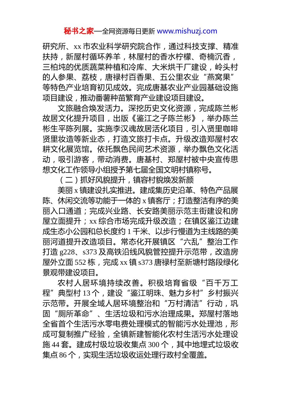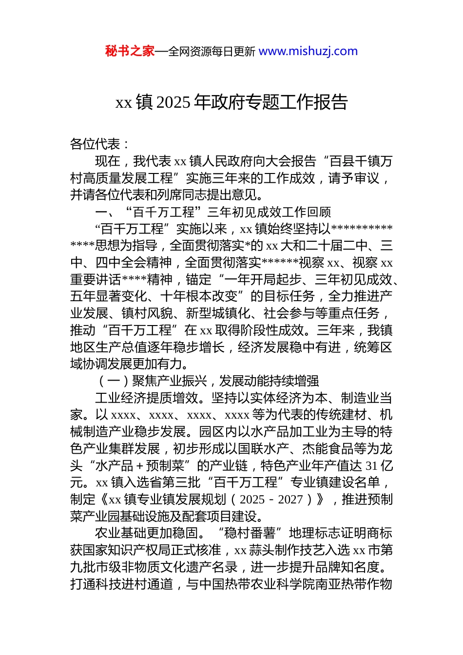 秘书之家—全网资源每日更新 www.mishuzj.comxx 镇 2025 年政府专题工作报告各位代表:现在,我代表 xx 镇人民政府向大会报告“百县千镇万村高质量发展工程”实施三年来的工作成效,请予审议,并请各位代表和列席同志提出意见。一、“百千万工程”三年初见成效工作回顾“百千万工程”实施以来,xx 镇始终坚持以**************思想为指导,全面贯彻落实*的 xx 大和二十届二中、三中、四中全会精神,全面贯彻落实******视察 xx、视察 xx重要讲话****精神,锚定“一年开局起步、三年初见成效、五年显著变化、十年根本改变”的目标任务,全力推进产业发展、镇村风貌、新型城镇化、社会参与等重点任务,推动“百千万工程”在 xx 取得阶段性成效。三年来,我镇地区生产总值逐年稳步增长,经济发展稳中有进,统筹区域协调发展更加有力。(一)聚焦产业振兴,发展动能持续增强工业经济提质增效。坚持以实体经济为本、制造业当家。以 xxxx、xxxx、xxxx、xxxx 等为代表的传统建材、机械制造产业稳步发展。园区内以水产品加工业为主导的特色产业集群发展,初步形成以国联水产、杰能食品等为龙头“水产品+预制菜”的产业链,特色产业年产值达 31 亿元。xx 镇入选省第三批“百千万工程”专业镇建设名单,制定《xx 镇专业镇发展规划(2025-2027)》,推进预制菜产业园基础设施及配套项目建设。农业基础更加稳固。“稳村番薯”地理标志证明商标获国家知识产权局正式核准,xx 蒜头制作技艺入选 xx 市第九批市级非物质文化遗产名录,进一步提升品牌知名度。打通科技进村通道,与中国热带农业科学院南亚热带作物秘书之家—全网资源每日更新 www.mishuzj.com研究所、xx 市农业科学研究院合作,通过科技支撑、精准扶持,新屋村循环养羊,林屋村的香水柠檬、奇楠沉香,三柏坉的优质蔬菜种植和冷库、大米烘干厂建设,岭头村的人参果、荔枝,唐禄村百香果、五公里农业“燕窝果”等特色产业培育初见成效。完成唐基农业产业园基础设施项目建设,推动番薯种苗繁育产业建设项目建设。文旅融合焕发活力。深挖历史文化资源,完成陈兰彬故居文化提升项目,出版《鉴江之子陈兰彬》,举办陈兰彬生平陈列展。实施李汉魂故居活化项目,引入贤里咖啡贤里妆造等新业态,打造文旅打卡点。升级改造郑屋村农耕文化展览馆。依托飘色民间艺术资源,举办飘色文化活动,吸引游客,带动消费。唐基村、郑屋村被中央宣传思想文化工作领导小组授予第七届全国文明村镇称号。(二)抓好风貌提升,镇容村貌焕发新颜美丽 x 镇建设扎实推进。建成集历史沿革、特色产品展陈、休闲交流等功能于一体的 x 镇客厅;打造整洁有序的美丽入口通道;完成兴业路、长安路美丽示范主街建设和房屋立面提升;xx 综合市场完成升级改造;在镇区鉴江边建成生态小公园和总长度约 1 千米、以步行慢道为主线路的美丽河道提升改造项目。常态化开展镇区“六乱”整治工作打造 g228、s373 及高铁沿线风貌管控提升示范带,改造房屋外立面 552 栋,完成 xx 镇 s373 唐禄村至新塘村路段绿化景观带建设项目。农村人居环境持续改善。积极培育省级“百千万工程”典型村 13 个,建设“鉴江明珠、魅力乡村”乡村振兴示范带。开展全域人居环境整治和“万村清洁”行动,巩固“厕所革命”、生活垃圾和污水治理成果。郑屋村落地全省首个生活污水零电费处理模式的智能污水处理池,形成可复制推广经验,全镇新建智能化农村生活污水处理设施 44 套。建成村级垃圾收集点 300 个,其中地埋式垃圾收集点 86 个,实现生活垃圾收运处理行政村全覆盖。秘书之家—全网资源每日更新 www.mishuzj.com绿美生态建设纵深推进。扎实开展全民爱绿植绿护绿行动,成功打造“dj 共建林”“青年林”“巾帼林”等多个特色主题林,三年来全镇累计植树 54756 棵。全面铺开美丽庭院示范创建,建成美丽庭院 934 余户,在 xx 市“美丽庭院”建设擂台赛中获得第一名。严格落实河湖长制,完善巡河管河治河长效机制。(三)推进新型城镇化,镇区功能日益完善规划引领格局优化。入选 xx 省小城市标准规划建设中心镇试点名单,制定按照小城市标准...