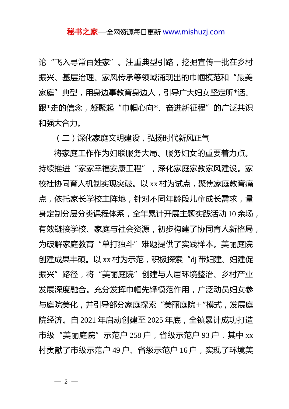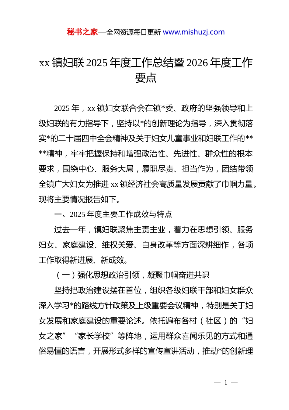秘书之家—全网资源每日更新 www.mishuzj.comxx 镇妇联 2025 年度工作总结暨 2026 年度工作要点2025 年,xx 镇妇女联合会在镇*委、政府的坚强领导和上级妇联的有力指导下,坚持以*的创新理论为指导,深入贯彻落实*的二十届四中全会精神及关于妇女儿童事业和妇联工作的****精神,牢牢把握保持和增强政治性、先进性、群众性的根本要求,围绕中心、服务大局,履职尽责、担当作为,团结带领全镇广大妇女为推进 xx 镇经济社会高质量发展贡献了巾帼力量。现将主要情况报告如下。一、2025 年度主要工作成效与特点过去一年,镇妇联聚焦主责主业,着力在思想引领、服务妇女、家庭建设、维权关爱、自身改革等方面深耕细作,各项工作取得新进展、新成效。(一)强化思想政治引领,凝聚巾帼奋进共识坚持把政治建设摆在首位,组织各级妇联干部和妇女群众深入学习*的路线方针政策及上级重要会议精神,特别是关于妇女发展和家庭建设的重要论述。依托遍布各村(社区)的“妇女之家”“家长学校”等阵地,运用群众喜闻乐见的方式和通俗易懂的语言,开展形式多样的宣传宣讲活动,推动*的创新理— 1 —秘书之家—全网资源每日更新 www.mishuzj.com论“飞入寻常百姓家”。注重典型引路,挖掘宣传一批在乡村振兴、基层治理、家风传承等领域涌现出的巾帼模范和“最美家庭”典型,用身边事教育身边人,引导广大妇女坚定听*话、跟*走的信念,凝聚起“巾帼心向*、奋进新征程”的广泛共识和强大合力。(二)深化家庭文明建设,弘扬时代新风正气将家庭工作作为妇联服务大局、服务妇女的重要着力点。持续推进“家家幸福安康工程”,深化家庭家教家风建设。家校社协同育人机制实现突破。以 xx 村为试点,聚焦家庭教育痛点,依托家长学校主阵地,针对不同年龄段儿童成长需求,量身定制分层分类课程体系,全年累计开展主题实践活动 10 余场,有效链接学校、家庭与社会资源,初步构建了协同育人新格局,为破解家庭教育“单打独斗”难题提供了实践样本。美丽庭院创建成果丰硕。以 xx 村为示范,积极探索“dj 带妇建、妇建促振兴”路径,将“美丽庭院”创建与人居环境整治、乡村产业发展深度融合。充分发挥巾帼先锋模范作用,广泛动员妇女参与庭院美化,并引导部分家庭探索“美丽庭院+”模式,发展庭院经济。自 2021 年启动创建至 2025 年底,全镇累计成功打造市级“美丽庭院”示范户 258 户,省级示范户 93 户,其中 xx村贡献了市级示范户 49 户、省级示范户 16 户,实现了环境美— 2 —秘书之家—全网资源每日更新 www.mishuzj.com化与增收致富的双赢,为乡村振兴增添了亮丽底色。传统文化浸润深入人心。结合春节、元宵、中秋等传统节日,深入开展“我们的节日”系列主题活动,弘扬中华优秀传统文化,涵养文明乡风、良好家风、淳朴民风。(三)做实维权关爱服务,筑牢妇女儿童屏障坚持以妇女儿童需求为导向,着力解决急难愁盼问题,提升妇女儿童的获得感、幸福感、安全感。维权网络不断健全。畅通妇女维权渠道,扎实开展婚姻家庭矛盾纠纷排查化解工作,建立健全预警防范机制,努力将矛盾化解在基层、化解在萌芽状态。联合相关部门开展“巾帼守护·暖心同行”女性安全护航与普法宣传行动,提升妇女及其家庭的法治意识和依法维权能力。关爱帮扶精准有效。聚焦困境妇女、留守儿童、老年妇女等重点群体,建立动态管理台账,做到底数清、情况明。开展常态化走访慰问与帮扶救助,针对不同群体需求精准提供健康保障、安全守护、心理疏导、生活援助等专项服务。积极链接社会资源,开展“恒爱行动”等公益项目,为偏远地区困境儿童送去温暖。全年对困境妇女儿童群体的关爱覆盖率和帮扶实效显著提升。民生平台赋能发展。积极搭建巾帼创业就业服务平台,提供技能培训、信息咨询、政策对接等服务,助力妇女在更广领域创新创业。建强巾帼志愿服务队伍,全镇共组建村— 3 —秘书之家—全网资源每日更新 www.mishuzj.com级巾帼志愿服务队 16 支,注册志愿者 269 人,围绕环境整治、敬老爱老、文明劝导、活动保障等重点领域,全年开展志愿服务活动 220 场,累计服务时长 1806.48 小...