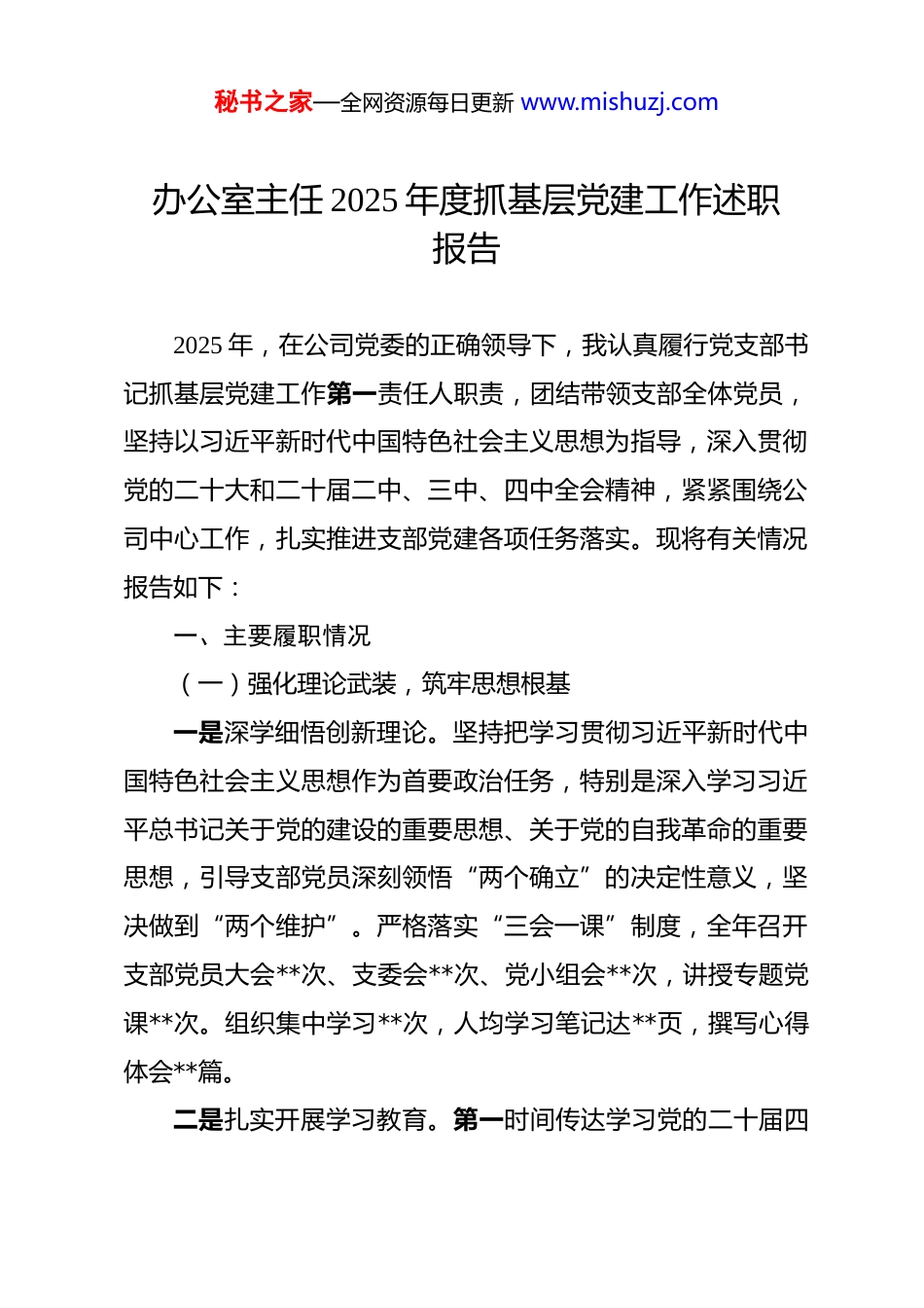 秘书之家—全网资源每日更新 www.mishuzj.com办公室主任 2025 年度抓基层党建工作述职报告 2025 年,在公司党委的正确领导下,我认真履行党支部书记抓基层党建工作第一责任人职责,团结带领支部全体党员,坚持以习近平新时代中国特色社会主义思想为指导,深入贯彻党的二十大和二十届二中、三中、四中全会精神,紧紧围绕公司中心工作,扎实推进支部党建各项任务落实。现将有关情况报告如下:一、主要履职情况(一)强化理论武装,筑牢思想根基一是深学细悟创新理论。坚持把学习贯彻习近平新时代中国特色社会主义思想作为首要政治任务,特别是深入学习习近平总书记关于党的建设的重要思想、关于党的自我革命的重要思想,引导支部党员深刻领悟“两个确立”的决定性意义,坚决做到“两个维护”。严格落实“三会一课”制度,全年召开支部党员大会**次、支委会**次、党小组会**次,讲授专题党课**次。组织集中学习**次,人均学习笔记达**页,撰写心得体会**篇。二是扎实开展学习教育。第一时间传达学习党的二十届四秘书之家—全网资源每日更新 www.mishuzj.com中全会精神,组织专题学习研讨**次,班子成员带头领学、带头研讨、带头宣讲。深入开展深入贯彻中央八项规定精神学习教育,组织专题学习**次,观看警示教育片**部,开展“以案为鉴”专题研讨**次。引导党员对照中央八项规定精神查摆自身问题,支部共查摆问题**项,制定整改措施**条,推动作风建设常态化长效化。三是创新学习方式方法。依托“学习强国”“共产党员网”等平台,推动线上线下学习相结合,支部党员“学习强国”人均积分达**分,位居公司前列。建立“每周一学、每月一讲、每季一考”学习机制,开展党的创新理论知识测试**次,合格率 100%。组织参观红色教育基地**次,开展“重温入党誓词”等主题党日活动 12 次,不断增强党员党性修养。(二)服务中心大局,强化政治功能一是紧扣“国之大者”抓党建。牢固树立“围绕中心抓党建、抓好党建促发展”理念,把服务公司高质量发展作为支部党建工作的出发点和落脚点。围绕公司年度重点任务,支部 4个部门分别认领年度目标任务**项,办公室牵头完成公司重大会议活动保障**场次,人资部完成人才引进**人、组织培训**场次,风险控制部开展风险排查**次、完善制度**项,纪检监察室开展监督检查**次、处理问题线索**件,较好地发挥了党秘书之家—全网资源每日更新 www.mishuzj.com建引领赋能国企提质增效的作用。二是增强组织功能聚合力。深入推进党支部标准化规范化建设,对照《中国共产党支部工作条例(试行)》逐项检视,完善支部工作制度**项。规范党内组织生活,全年召开组织生活会 1 次,开展民主评议党员 1 次,党员互评、群众评议覆盖率 100%。建立“党员联系群众”机制,**名党员分别联系**名群众,帮助解决实际问题**个。支部凝聚力、战斗力明显增强,全年被评为公司“先进党支部”。三是把支部建成战斗堡垒。充分发挥支部覆盖综合管理部门的优势,在急难险重任务中冲锋在前。在公司迎接上级检查、重大项目攻坚等关键时刻,支部党员主动加班加点,圆满完成各项任务。成立“党员突击队”,在公司重点工作推进、重大活动保障中发挥骨干作用。组织开展“我为群众办实事”实践活动,帮助职工群众解决烦心事、操心事**件,树立了党组织的良好形象。(三)锻造先锋队伍,激发党员活力一是用改革精神推进队伍建设。坚持把政治标准放在首位,严格党员发展程序,全年发展党员**名,培养入党积极分子**名,确定发展对象**名。严格落实发展党员“双推双评三全程”制度,对发展对象进行政治审查全覆盖,确保发展党员质秘书之家—全网资源每日更新 www.mishuzj.com量。加强党员培训教育,组织党员参加上级调训**人次,支部自主开展培训**场次,党员受训面达 100%。二是用严的标准强化日常管理。认真落实党员“积分制”管理,从参加组织生活、完成工作任务、发挥先锋作用等方面量化考核,考核结果与评先评优挂钩。加强和改进流动党员管理,对**名外出学习培训党员建立联系台账,定期推送学习资料、通报组织生活情况,确保流动党员“离乡不离党”。推动党组织和党员...