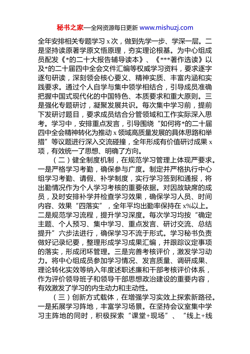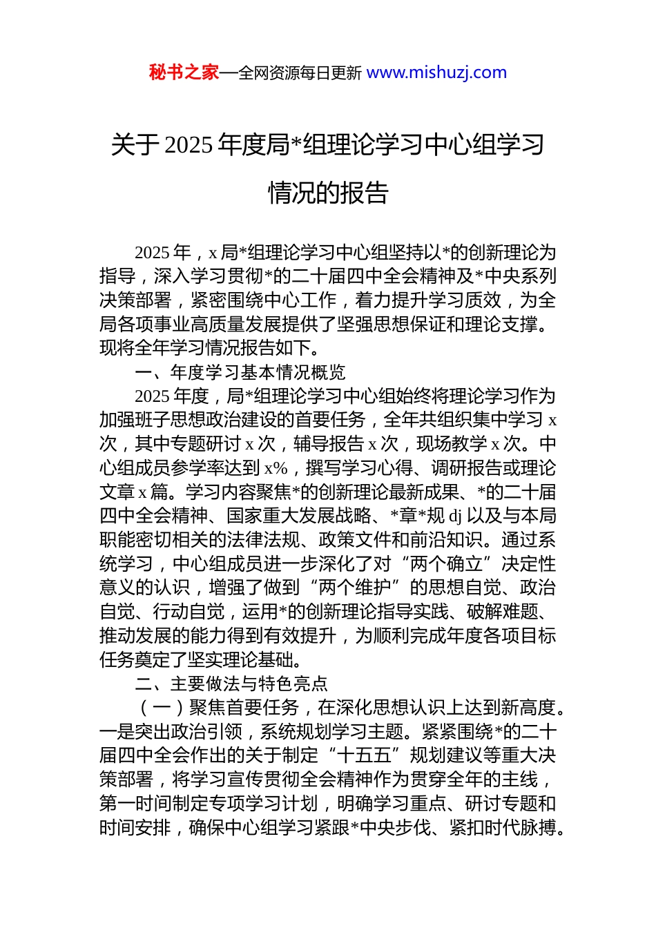 秘书之家—全网资源每日更新 www.mishuzj.com关于 2025 年度局*组理论学习中心组学习情况的报告2025 年,x 局*组理论学习中心组坚持以*的创新理论为指导,深入学习贯彻*的二十届四中全会精神及*中央系列决策部署,紧密围绕中心工作,着力提升学习质效,为全局各项事业高质量发展提供了坚强思想保证和理论支撑。现将全年学习情况报告如下。一、年度学习基本情况概览2025 年度,局*组理论学习中心组始终将理论学习作为加强班子思想政治建设的首要任务,全年共组织集中学习 x次,其中专题研讨 x 次,辅导报告 x 次,现场教学 x 次。中心组成员参学率达到 x%,撰写学习心得、调研报告或理论文章 x 篇。学习内容聚焦*的创新理论最新成果、*的二十届四中全会精神、国家重大发展战略、*章*规 dj 以及与本局职能密切相关的法律法规、政策文件和前沿知识。通过系统学习,中心组成员进一步深化了对“两个确立”决定性意义的认识,增强了做到“两个维护”的思想自觉、政治自觉、行动自觉,运用*的创新理论指导实践、破解难题、推动发展的能力得到有效提升,为顺利完成年度各项目标任务奠定了坚实理论基础。二、主要做法与特色亮点(一)聚焦首要任务,在深化思想认识上达到新高度。一是突出政治引领,系统规划学习主题。紧紧围绕*的二十届四中全会作出的关于制定“十五五”规划建议等重大决策部署,将学习宣传贯彻全会精神作为贯穿全年的主线,第一时间制定专项学习计划,明确学习重点、研讨专题和时间安排,确保中心组学习紧跟*中央步伐、紧扣时代脉搏。秘书之家—全网资源每日更新 www.mishuzj.com全年安排相关专题学习 x 次,做到先学一步、学深一层。二是坚持读原著学原文悟原理,夯实理论根基。为中心组成员配发《*的二十大报告辅导读本》、《***著作选读》以及*的二十届四中全会文件汇编等权威学习资料,要求逐字逐句研读,深刻领会核心要义、精神实质、丰富内涵和实践要求。通过个人自学与集中领学相结合,引导成员准确把握中国式现代化的中国特色、本质要求和重大原则。三是强化专题研讨,凝聚发展共识。每次集中学习前,提前下发研讨题目,要求成员结合分管领域和工作实际深入思考。学习中,安排重点发言,引导围绕“如何将*的二十届四中全会精神转化为推动 x 领域高质量发展的具体思路和举措”等议题进行深入交流碰撞,全年形成有价值研讨成果 x项,有效统一了思想、明确了方向。(二)健全制度机制,在规范学习管理上体现严要求。一是严格学习考勤,确保参与广度。制定并严格执行中心组学习考勤、请假、补学制度,实行学习签到和通报,将出勤情况作为个人学习考核的重要依据。对因故缺席的成员,及时安排补学并检查学习效果,确保学习人员、时间内容、效果“四落实”,全年平均出勤率保持在 x%以上。二是规范学习流程,提升学习深度。每次学习均按“确定主题、个人预习、集中学习、重点发言、研讨交流、总结提升”六步法进行,确保学习不流于形式。学习秘书负责做好记录纪要,整理形成学习成果汇编,并跟踪议定事项的落实,形成闭环管理。三是完善考核评价,激发学习动力。将中心组成员参加学习情况、发言质量、调研成果、理论转化实效等纳入年度述职述廉和干部考核评价体系,作为评价领导班子和领导干部思想政治建设的重要内容,有效激发了学习的内生动力和主动性。(三)创新方式载体,在增强学习实效上探索新路径。一是拓展学习阵地,丰富学习场景。在坚持会议室集中学习主阵地的同时,积极探索“课堂+现场”、“线上+线秘书之家—全网资源每日更新 www.mishuzj.com下”模式。组织赴 x 红色教育基地、x 先进企业、x 重点项目现场开展沉浸式教学 x 次;依托“学习强国”平台、干部网络学院等线上资源,推送精品课程、组织线上测试,拓展学习的时空维度。二是引入专家资源,提升学习层次。围绕*的二十届四中全会提出的新思想新论断新举措,特别是关于“十五五”时期经济社会发展目标和任务,邀请 x 大学、x*校的专家学者作专题辅导报告 x 场,帮助中心组成员开阔视野、深化理解、把握前沿。三是促进学研结合,推动成果转化。大力弘扬理论联系...