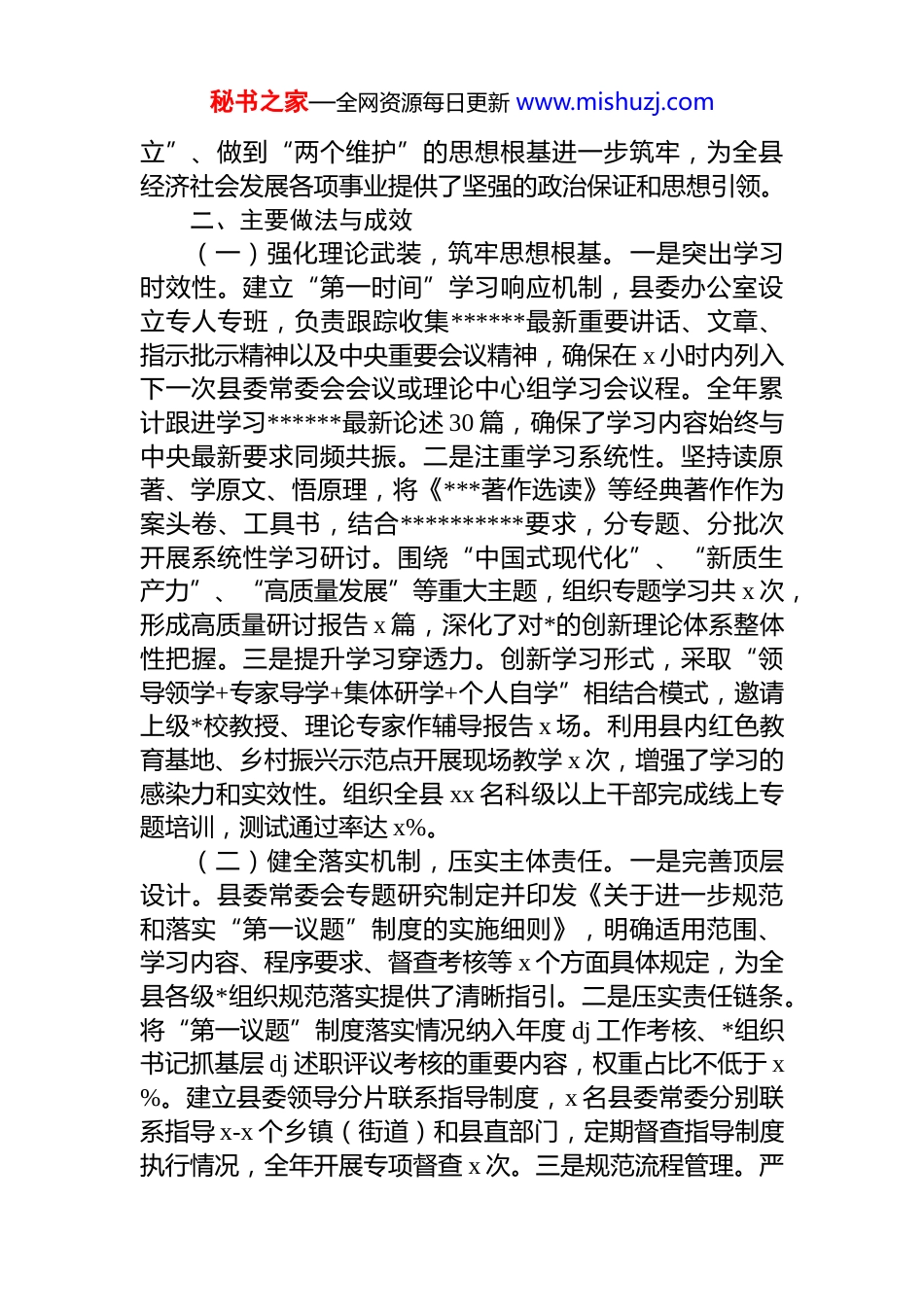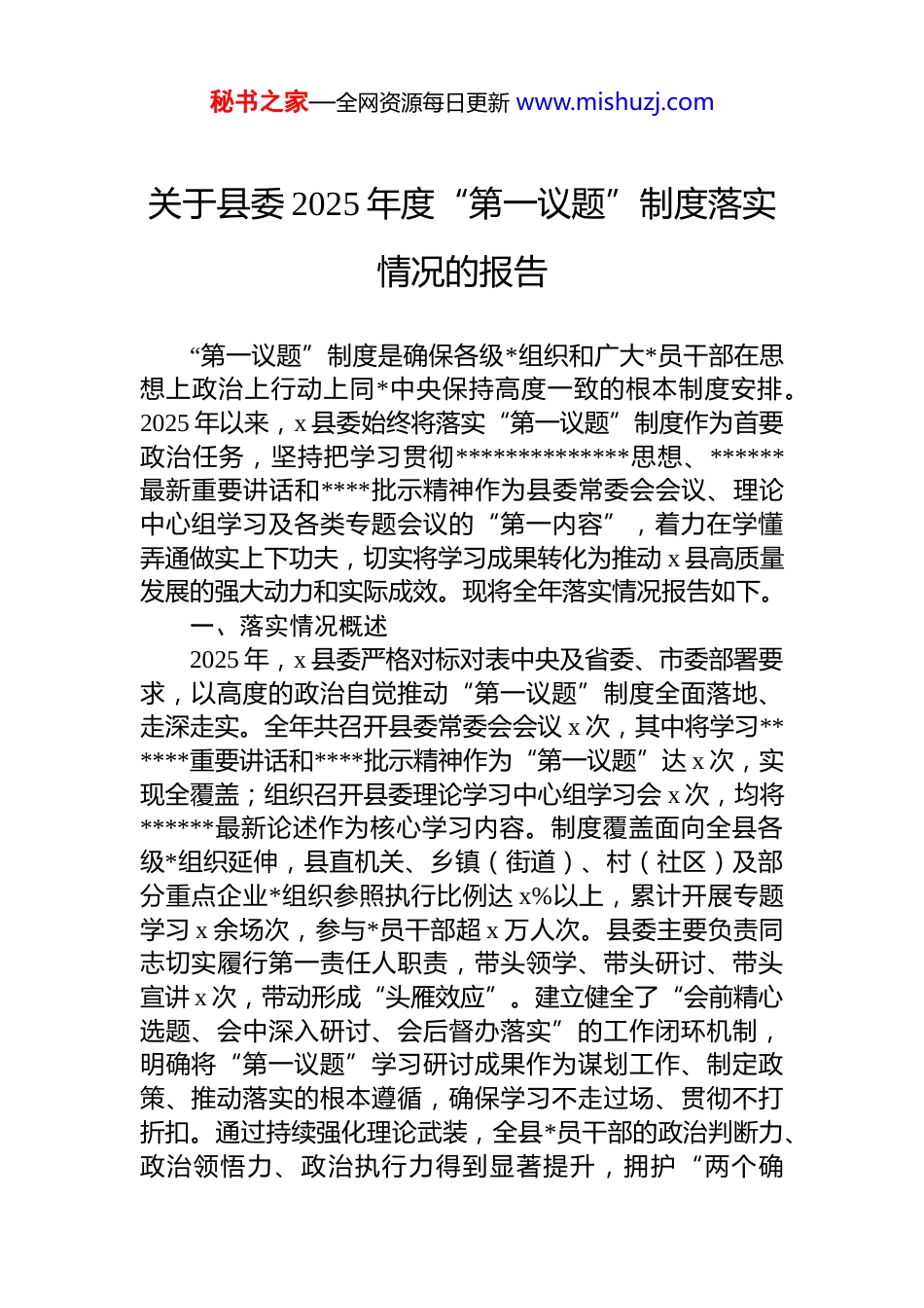 秘书之家—全网资源每日更新 www.mishuzj.com关于县委 2025 年度“第一议题”制度落实情况的报告“第一议题”制度是确保各级*组织和广大*员干部在思想上政治上行动上同*中央保持高度一致的根本制度安排。2025 年以来,x 县委始终将落实“第一议题”制度作为首要政治任务,坚持把学习贯彻**************思想、******最新重要讲话和****批示精神作为县委常委会会议、理论中心组学习及各类专题会议的“第一内容”,着力在学懂弄通做实上下功夫,切实将学习成果转化为推动 x 县高质量发展的强大动力和实际成效。现将全年落实情况报告如下。一、落实情况概述2025 年,x 县委严格对标对表中央及省委、市委部署要求,以高度的政治自觉推动“第一议题”制度全面落地、走深走实。全年共召开县委常委会会议 x 次,其中将学习******重要讲话和****批示精神作为“第一议题”达 x 次,实现全覆盖;组织召开县委理论学习中心组学习会 x 次,均将******最新论述作为核心学习内容。制度覆盖面向全县各级*组织延伸,县直机关、乡镇(街道)、村(社区)及部分重点企业*组织参照执行比例达 x%以上,累计开展专题学习 x 余场次,参与*员干部超 x 万人次。县委主要负责同志切实履行第一责任人职责,带头领学、带头研讨、带头宣讲 x 次,带动形成“头雁效应”。建立健全了“会前精心选题、会中深入研讨、会后督办落实”的工作闭环机制,明确将“第一议题”学习研讨成果作为谋划工作、制定政策、推动落实的根本遵循,确保学习不走过场、贯彻不打折扣。通过持续强化理论武装,全县*员干部的政治判断力、政治领悟力、政治执行力得到显著提升,拥护“两个确秘书之家—全网资源每日更新 www.mishuzj.com立”、做到“两个维护”的思想根基进一步筑牢,为全县经济社会发展各项事业提供了坚强的政治保证和思想引领。二、主要做法与成效(一)强化理论武装,筑牢思想根基。一是突出学习时效性。建立“第一时间”学习响应机制,县委办公室设立专人专班,负责跟踪收集******最新重要讲话、文章、指示批示精神以及中央重要会议精神,确保在 x 小时内列入下一次县委常委会会议或理论中心组学习会议程。全年累计跟进学习******最新论述 30 篇,确保了学习内容始终与中央最新要求同频共振。二是注重学习系统性。坚持读原著、学原文、悟原理,将《***著作选读》等经典著作作为案头卷、工具书,结合**********要求,分专题、分批次开展系统性学习研讨。围绕“中国式现代化”、“新质生产力”、“高质量发展”等重大主题,组织专题学习共 x 次,形成高质量研讨报告 x 篇,深化了对*的创新理论体系整体性把握。三是提升学习穿透力。创新学习形式,采取“领导领学+专家导学+集体研学+个人自学”相结合模式,邀请上级*校教授、理论专家作辅导报告 x 场。利用县内红色教育基地、乡村振兴示范点开展现场教学 x 次,增强了学习的感染力和实效性。组织全县 xx 名科级以上干部完成线上专题培训,测试通过率达 x%。(二)健全落实机制,压实主体责任。一是完善顶层设计。县委常委会专题研究制定并印发《关于进一步规范和落实“第一议题”制度的实施细则》,明确适用范围、学习内容、程序要求、督查考核等 x 个方面具体规定,为全县各级*组织规范落实提供了清晰指引。二是压实责任链条。将“第一议题”制度落实情况纳入年度 dj 工作考核、*组织书记抓基层 dj 述职评议考核的重要内容,权重占比不低于 x%。建立县委领导分片联系指导制度,x 名县委常委分别联系指导 x-x 个乡镇(街道)和县直部门,定期督查指导制度执行情况,全年开展专项督查 x 次。三是规范流程管理。严秘书之家—全网资源每日更新 www.mishuzj.com格会议流程管理,会前由县委办公室会同相关部门拟定学习议题和研讨要点;会中安排充足时间进行深入交流研讨县委常委带头谈认识、谈体会、谈落实举措;会后形成会议纪要,明确贯彻落实的责任分工和时限要求,并纳入县委督查室督办清单。(三)聚焦中心工作,推动学用结合。一是紧扣发展大局选题。紧密围绕县委年度中心工作和重点任务,精准选择“第一议题”学习内容...