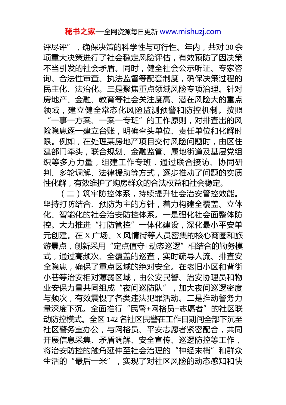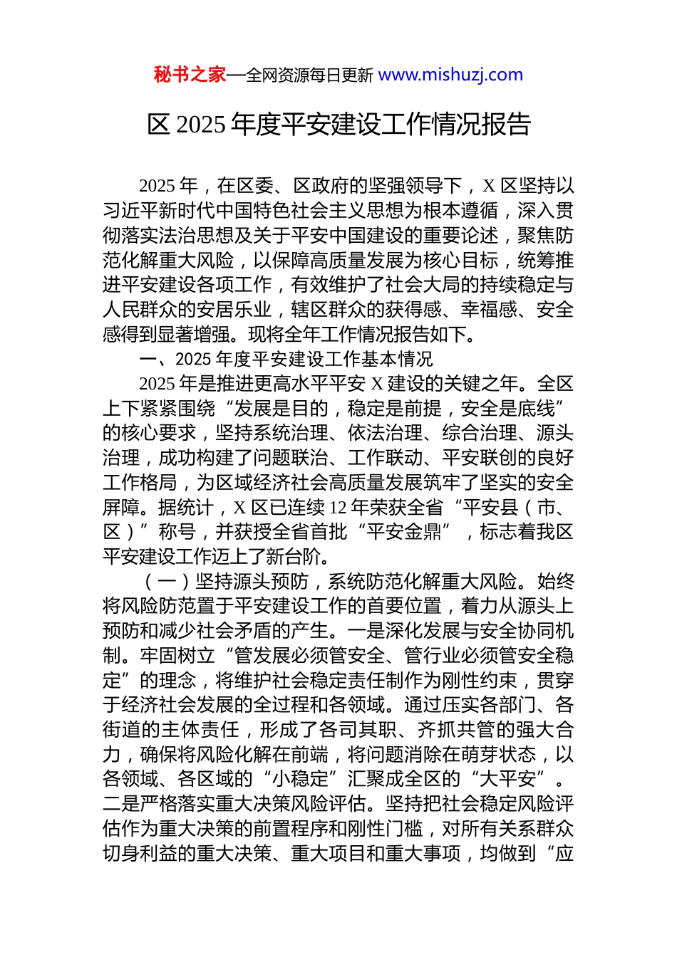 秘书之家—全网资源每日更新 www.mishuzj.com区 2025 年度平安建设工作情况报告2025 年,在区委、区政府的坚强领导下,X 区坚持以习近平新时代中国特色社会主义思想为根本遵循,深入贯彻落实法治思想及关于平安中国建设的重要论述,聚焦防范化解重大风险,以保障高质量发展为核心目标,统筹推进平安建设各项工作,有效维护了社会大局的持续稳定与人民群众的安居乐业,辖区群众的获得感、幸福感、安全感得到显著增强。现将全年工作情况报告如下。一、2025 年度平安建设工作基本情况2025 年是推进更高水平平安 X 建设的关键之年。全区上下紧紧围绕“发展是目的,稳定是前提,安全是底线”的核心要求,坚持系统治理、依法治理、综合治理、源头治理,成功构建了问题联治、工作联动、平安联创的良好工作格局,为区域经济社会高质量发展筑牢了坚实的安全屏障。据统计,X 区已连续 12 年荣获全省“平安县(市、区)”称号,并获授全省首批“平安金鼎”,标志着我区平安建设工作迈上了新台阶。(一)坚持源头预防,系统防范化解重大风险。始终将风险防范置于平安建设工作的首要位置,着力从源头上预防和减少社会矛盾的产生。一是深化发展与安全协同机制。牢固树立“管发展必须管安全、管行业必须管安全稳定”的理念,将维护社会稳定责任制作为刚性约束,贯穿于经济社会发展的全过程和各领域。通过压实各部门、各街道的主体责任,形成了各司其职、齐抓共管的强大合力,确保将风险化解在前端,将问题消除在萌芽状态,以各领域、各区域的“小稳定”汇聚成全区的“大平安”。二是严格落实重大决策风险评估。坚持把社会稳定风险评估作为重大决策的前置程序和刚性门槛,对所有关系群众切身利益的重大决策、重大项目和重大事项,均做到“应秘书之家—全网资源每日更新 www.mishuzj.com评尽评”,确保决策的科学性与可行性。年内,共对 30 余项重大决策进行了社会稳定风险评估,有效预防了因决策不当引发的社会矛盾。同时,健全社会公示听证、专家咨询、合法性审查、执法监督等配套制度,确保决策过程的民主化、法治化。三是聚焦重点领域风险专项治理。针对房地产、金融、教育等社会关注度高、潜在风险大的重点领域,建立健全常态化风险监测预警和防控机制。按照“一事一方案、一案一专班”的工作原则,对排查出的风险隐患逐一建立台账,明确牵头单位、责任单位和化解时限。例如,在处理某房地产项目交付风险问题时,由区住建部门牵头,联合规划、金融监管、属地街道及基层党组织等多方力量,组建工作专班,通过联合接访、协同研判、多轮调解、法律援助等方式,逐步推动了问题的实质性化解,有效维护了购房群众的合法权益和社会稳定。(二)筑牢防控体系,持续提升社会治安管控效能。坚持打防结合、预防为主的方针,着力构建全覆盖、立体化、智能化的社会治安防控体系。一是强化社会面整体防控。大力推进“打防管控”一体化建设,深化最小平安单元创建。在 X 广场、X 风情街等人员密集的核心商圈和旅游景点,创新采用“定点值守+动态巡逻”相结合的勤务模式,通过高频次、全覆盖的巡查,实时疏导人流、排查安全隐患,确保了重点区域的绝对安全。在老旧小区和背街小巷等治安相对薄弱区域,由公安民警、治安协理员和物业安保力量共同组成“夜间巡防队”,加大夜间巡逻密度与频次,有效震慑了各类违法犯罪活动。二是推动警务力量深度下沉。全面推行“民警+网格员+志愿者”的社区联动防控模式。全区 142 名社区民警在工作日期间全部下沉至社区警务室办公,与网格员、平安志愿者紧密配合,共同开展信息采集、矛盾调解、安全宣传、巡逻防控等工作,将治安防控的触角延伸至社会治理的“神经末梢”和群众生活的“最后一米”,实现了对社区风险的动态感知和快秘书之家—全网资源每日更新 www.mishuzj.com速响应。三是保持对突出违法犯罪的严打高压态势。聚焦人民群众反映强烈的突出治安问题,持续推进扫黑除恶斗争常态化,对电信网络诈骗、盗抢骗、黄赌毒、食药环等违法犯罪活动,坚持主动进攻、露头就打。2025 年,全区共侦破各类刑事案件 2318 起,有力打击了犯罪分子的嚣张气焰,...