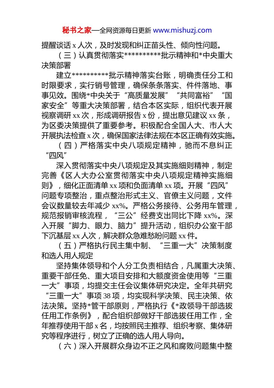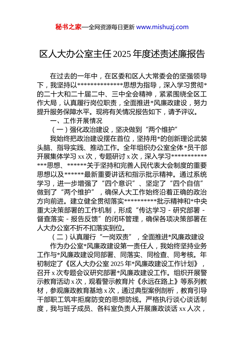 秘书之家—全网资源每日更新 www.mishuzj.com区人大办公室主任 2025 年度述责述廉报告在过去的一年中,在区委和区人大常委会的坚强领导下,我坚持以**************思想为指导,深入学习贯彻*的二十大和二十届二中、三中全会精神,紧紧围绕全区工作大局,认真履行岗位职责,全面推进*风廉政建设,努力提升服务保障水平。现将有关情况报告如下,请予评议。一、工作开展情况(一)强化政治建设,坚决做到“两个维护”我始终把政治建设摆在首位,坚持用*的创新理论武装头脑、指导实践、推动工作。全年组织办公室全体*员干部开展集体学习 xx 次,专题研讨 x 次,深入学习**************思想、******关于坚持和完善人民代表大会制度的重要思想以及******最新重要讲话和指示批示精神。通过系统学习,进一步增强了“四个意识”、坚定了“四个自信”做到了“两个维护”,确保人大工作始终沿着正确的政治方向前进。建立健全贯彻落实**********批示精神和*中央重大决策部署的工作机制,形成“传达学习-研究部署-督查落实-报告反馈”的闭环管理,确保各项决策部署在人大办公室不折不扣落实到位。(二)认真履行“一岗双责”,全面推进*风廉政建设作为办公室*风廉政建设第一责任人,我始终坚持业务工作与*风廉政建设同部署、同落实、同检查、同考核。年初制定了《区人大办公室 2025 年*风廉政建设工作计划》,召开 x 次专题会议研究部署*风廉政建设工作。组织开展警示教育活动 x 次,观看警示教育片《永远在路上》等系列教材,参观廉政教育基地 x 次,通过典型案例剖析,教育引导干部职工筑牢拒腐防变的思想防线。严格执行谈心谈话制度,我与班子成员、各科室负责人开展廉政谈话 xx 人次,秘书之家—全网资源每日更新 www.mishuzj.com提醒谈话 x 人次,及时发现和纠正苗头性、倾向性问题。(三)认真贯彻落实**********批示精神和*中央重大决策部署建立**********批示精神落实台账,明确责任分工和时限要求,实行销号管理,确保条条落实、件件落地、事事见效。围绕*中央关于“高质量发展”“共同富裕”“国家安全”等重大决策部署,结合本区实际,组织代表开展视察调研 xx 次,形成调研报告 x 份,提出意见建议 xx 条,为区委决策提供了重要参考。积极配合全国人大、市人大开展执法检查 x 次,确保国家法律法规在本区正确有效实施。(四)严格落实中央八项规定精神,驰而不息纠正“四风”深入贯彻落实中央八项规定及其实施细则精神,制定完善《区人大办公室贯彻落实中央八项规定精神实施细则》,细化正面清单 xx 项和负面清单 xx 项。开展“四风”问题专项整治,重点整治形式主义、官僚主义问题,文件会议数量较去年减少 xx%。严格公务接待、公务用车管理,规范报销审核流程,“三公”经费支出同比下降 xx%。深入开展“脚力、眼力、脑力”提升活动,组织办公室干部下沉基层 xx 人次,解决群众急难愁盼问题 xx 件。(五)严格执行民主集中制、“三重一大”决策制度和选人用人规定坚持集体领导和个人分工负责相结合,凡属重大决策、重要干部任免、重大项目安排和大额度资金使用等“三重一大”事项,均提交主任会议集体研究决定。全年共研究“三重一大”事项 38 项,均实现科学决策、民主决策、依法决策。坚持*管干部原则,严格执行《*政领导干部选拔任用工作条例》,配合组织部做好干部选拔任用工作,全年推荐使用干部 x 名,均按照民主推荐、组织考察、集体研究等程序进行,树立了正确的选人用人导向。(六)深入开展群众身边不正之风和腐败问题集中整秘书之家—全网资源每日更新 www.mishuzj.com治,打好问题整改硬仗根据区委统一部署,牵头开展“民生领域突出问题专项整治”行动,重点围绕教育医疗、养老社保、生态环保等领域,督促相关部门解决群众反映强烈问题 xx 个。组织开展“人大代表助力乡村振兴”活动,动员各级代表深入田间地头,发现并推动解决涉农问题 x 个。针对上年度述职评议指出问题,制定整改措施 xx 条,已完成整改 xx 条,剩余 x 条正在持续推进中。牵头办理代表议案建议 xx 件,办复率 100%,满意率 98.5%。(...