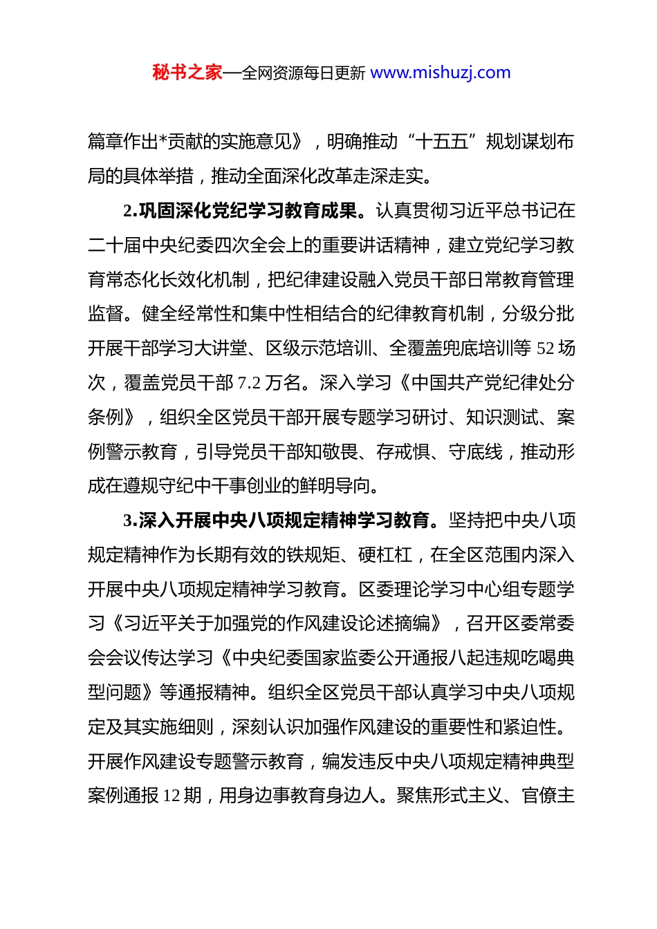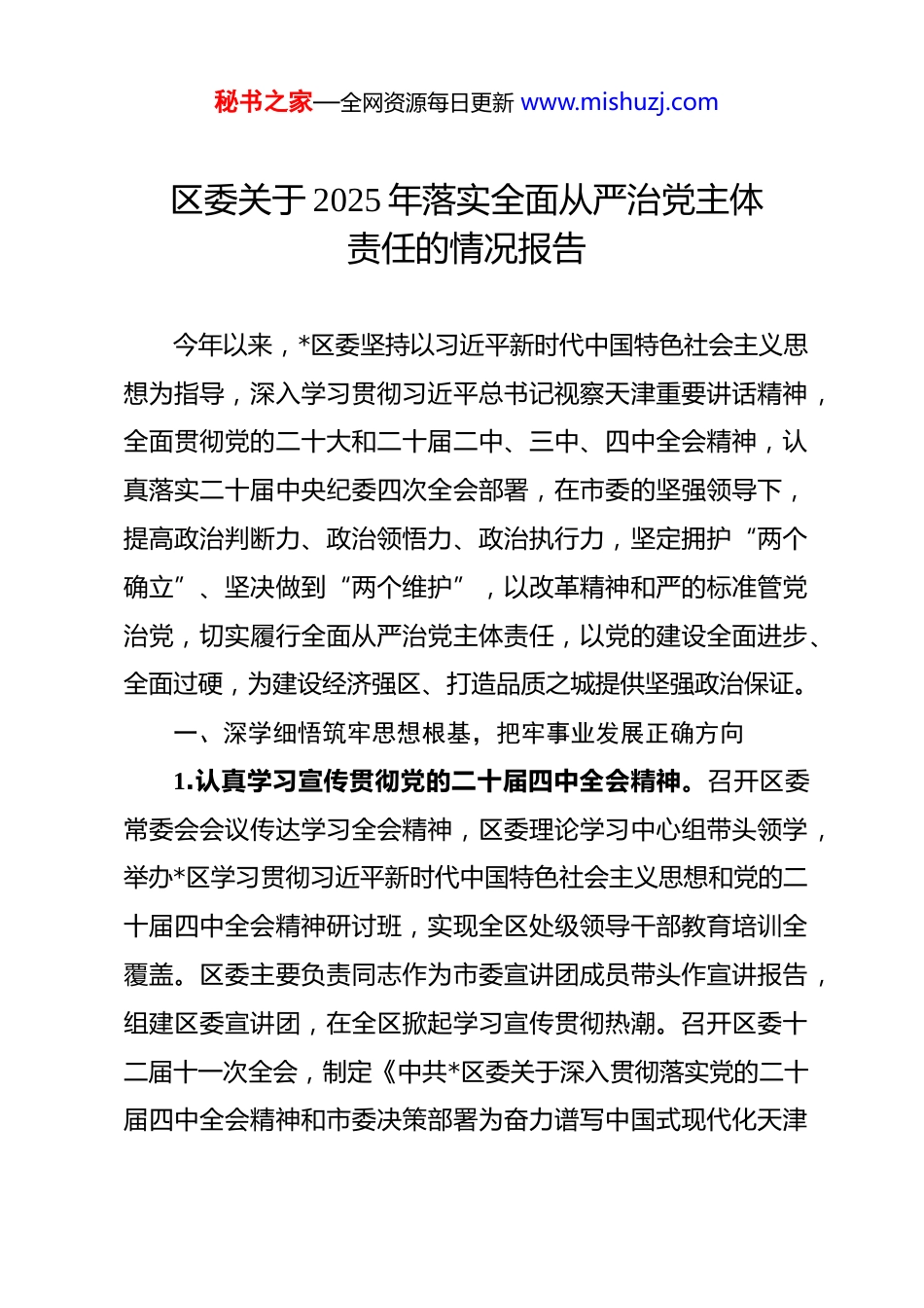 秘书之家—全网资源每日更新 www.mishuzj.com区委关于 2025 年落实全面从严治党主体责任的情况报告 今年以来,*区委坚持以习近平新时代中国特色社会主义思想为指导,深入学习贯彻习近平总书记视察天津重要讲话精神,全面贯彻党的二十大和二十届二中、三中、四中全会精神,认真落实二十届中央纪委四次全会部署,在市委的坚强领导下,提高政治判断力、政治领悟力、政治执行力,坚定拥护“两个确立”、坚决做到“两个维护”,以改革精神和严的标准管党治党,切实履行全面从严治党主体责任,以党的建设全面进步、全面过硬,为建设经济强区、打造品质之城提供坚强政治保证。一、深学细悟筑牢思想根基,把牢事业发展正确方向1.认真学习宣传贯彻党的二十届四中全会精神。召开区委常委会会议传达学习全会精神,区委理论学习中心组带头领学,举办*区学习贯彻习近平新时代中国特色社会主义思想和党的二十届四中全会精神研讨班,实现全区处级领导干部教育培训全覆盖。区委主要负责同志作为市委宣讲团成员带头作宣讲报告,组建区委宣讲团,在全区掀起学习宣传贯彻热潮。召开区委十二届十一次全会,制定《中共*区委关于深入贯彻落实党的二十届四中全会精神和市委决策部署为奋力谱写中国式现代化天津秘书之家—全网资源每日更新 www.mishuzj.com篇章作出*贡献的实施意见》,明确推动“十五五”规划谋划布局的具体举措,推动全面深化改革走深走实。2.巩固深化党纪学习教育成果。认真贯彻习近平总书记在二十届中央纪委四次全会上的重要讲话精神,建立党纪学习教育常态化长效化机制,把纪律建设融入党员干部日常教育管理监督。健全经常性和集中性相结合的纪律教育机制,分级分批开展干部学习大讲堂、区级示范培训、全覆盖兜底培训等 52 场次,覆盖党员干部 7.2 万名。深入学习《中国共产党纪律处分条例》,组织全区党员干部开展专题学习研讨、知识测试、案例警示教育,引导党员干部知敬畏、存戒惧、守底线,推动形成在遵规守纪中干事创业的鲜明导向。3.深入开展中央八项规定精神学习教育。坚持把中央八项规定精神作为长期有效的铁规矩、硬杠杠,在全区范围内深入开展中央八项规定精神学习教育。区委理论学习中心组专题学习《习近平关于加强党的作风建设论述摘编》,召开区委常委会会议传达学习《中央纪委国家监委公开通报八起违规吃喝典型问题》等通报精神。组织全区党员干部认真学习中央八项规定及其实施细则,深刻认识加强作风建设的重要性和紧迫性。开展作风建设专题警示教育,编发违反中央八项规定精神典型案例通报 12 期,用身边事教育身边人。聚焦形式主义、官僚主秘书之家—全网资源每日更新 www.mishuzj.com义突出问题,在全区开展作风问题专项整治,查摆整改问题 42项,推动作风建设取得实效。大力精简文件会议,全年发文数量同比减少 45%,会议数量同比减少 42%,切实为基层减负赋能。4.强化思想政治引领。坚持“第一议题”制度,召开区委常委会会议,跟进传达学习习近平总书记重要讲话和重要指示批示精神。巩固拓展主题教育成果,高质量开好专题民主生活会,制定《关于巩固拓展学习贯彻习近平新时代中国特色社会主义思想主题教育成果的若干措施》,健全以学铸魂、以学增智、以学正风、以学促干长效机制。发挥区委理论学习中心组示范带头作用,综合运用集体研讨、专家辅导、现场调研等方式,围绕总体国家安全观、宣传思想文化工作、智慧城市建设等专题开展集体学习 16 次,推动理论武装走深走实。二、压实管党治党政治责任,凝聚团结奋斗强大合力1.加强统筹谋划。坚持把党建工作与中心工作同部署、同落实,定期召开区委常委会会议研究全面从严治党工作。召开党的建设工作会议,制定区委党的建设工作领导小组 2025 年工作要点,部署组织、宣传、统战、主体责任落实等重点工作。召开区委常委会会议暨党的建设工作领导小组(扩大)会议,听取各街道党工委书记和部门主要负责同志抓基层党建工作述秘书之家—全网资源每日更新 www.mishuzj.com职。召开区委常委会会议、区委书记专题会议,听取区委巡察情况汇报,强化巡察成果转化运用,充分发挥政治巡察利剑作用。严格落实...