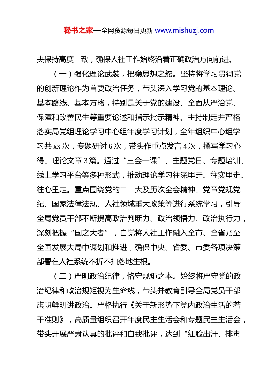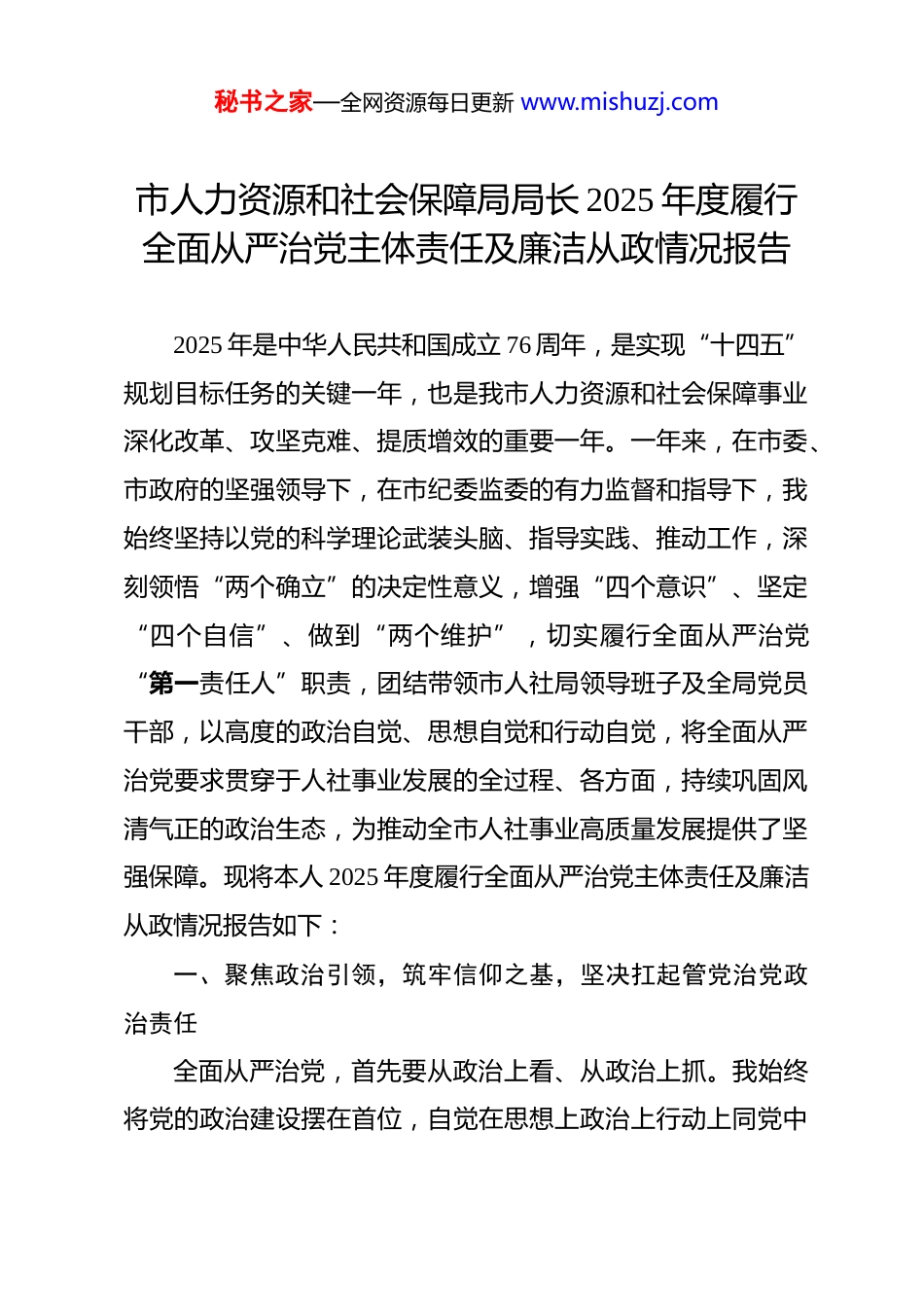 秘书之家—全网资源每日更新 www.mishuzj.com市人力资源和社会保障局局长 2025 年度履行全面从严治党主体责任及廉洁从政情况报告 2025 年是中华人民共和国成立 76 周年,是实现“十四五”规划目标任务的关键一年,也是我市人力资源和社会保障事业深化改革、攻坚克难、提质增效的重要一年。一年来,在市委、市政府的坚强领导下,在市纪委监委的有力监督和指导下,我始终坚持以党的科学理论武装头脑、指导实践、推动工作,深刻领悟“两个确立”的决定性意义,增强“四个意识”、坚定“四个自信”、做到“两个维护”,切实履行全面从严治党“第一责任人”职责,团结带领市人社局领导班子及全局党员干部,以高度的政治自觉、思想自觉和行动自觉,将全面从严治党要求贯穿于人社事业发展的全过程、各方面,持续巩固风清气正的政治生态,为推动全市人社事业高质量发展提供了坚强保障。现将本人 2025 年度履行全面从严治党主体责任及廉洁从政情况报告如下:一、聚焦政治引领,筑牢信仰之基,坚决扛起管党治党政治责任全面从严治党,首先要从政治上看、从政治上抓。我始终将党的政治建设摆在首位,自觉在思想上政治上行动上同党中秘书之家—全网资源每日更新 www.mishuzj.com央保持高度一致,确保人社工作始终沿着正确政治方向前进。(一)强化理论武装,把稳思想之舵。坚持将学习贯彻党的创新理论作为首要政治任务,带头深入学习党的基本理论、基本路线、基本方略,特别是关于党的建设、全面从严治党、保障和改善民生等重要论述和指示批示精神。主持制定并严格落实局党组理论学习中心组年度学习计划,全年组织中心组学习共 xx 次,专题研讨 6 次,带头作重点发言 4 次,撰写学习心得、理论文章 3 篇。通过“三会一课”、主题党日、专题培训、线上学习平台等多种形式,推动理论学习往深里走、往实里走、往心里走。重点围绕党的二十大及历次全会精神、党章党规党纪、国家法律法规、人社领域重大政策等进行系统学习,引导全局党员干部不断提高政治判断力、政治领悟力、政治执行力,深刻把握“国之大者”,自觉将人社工作融入全市、全省乃至全国发展大局中谋划和推进,确保中央、省委、市委各项决策部署在人社系统不折不扣落地生根。(二)严明政治纪律,恪守规矩之本。始终将严守党的政治纪律和政治规矩视为生命线,带头并教育引导全局党员干部旗帜鲜明讲政治。严格执行《关于新形势下党内政治生活的若干准则》,高质量组织召开年度民主生活会和专题民主生活会,带头开展严肃认真的批评和自我批评,达到“红脸出汗、排毒秘书之家—全网资源每日更新 www.mishuzj.com治病”的效果。严格落实民主集中制,凡属“三重一大”事项,均提交局党组会议集体研究决定,严格执行主要负责人末位表态制度,全年主持召开党组会议 24 次,研究议题 126 项,均实现科学决策、民主决策、依法决策。严格执行重大事项请示报告制度,对涉及人社领域的重大政策、重要工作、突发事件等,均按规定及时、如实向市委、市政府请示报告。加强对局系统内各级党组织和党员干部的政治监督,坚决反对“七个有之”,切实做到“五个必须”,自觉做政治上的明白人、老实人,确保人社系统政令畅通、令行禁止。(三)压实责任链条,凝聚落实之力。牢固树立“抓好党建是最大政绩”的理念,认真履行全面从严治党“第一责任人”职责,坚持党建工作与业务工作同谋划、同部署、同推进、同考核。年初,主持研究制定局党组落实全面从严治党主体责任年度任务安排及责任清单,细化责任内容、责任领导和完成时限,与各分管领导、各科室(单位)主要负责人层层签订《全面从严治党责任书》,形成一级抓一级、层层抓落实的责任体系。全年主持召开 4 次局党组专题会议,研究部署全面从严治党工作,分析研判形势,解决突出问题。坚持“书记抓、抓书记”,定期听取班子成员履行“一岗双责”情况汇报,约谈下级党组织书记 16 人次,对落实管党治党责任不力的及时提秘书之家—全网资源每日更新 www.mishuzj.com醒、督促整改。支持局机关纪委履行监督责任,为其履行职责创造良好条件。通过明责、履责、督责、问责,推动管...