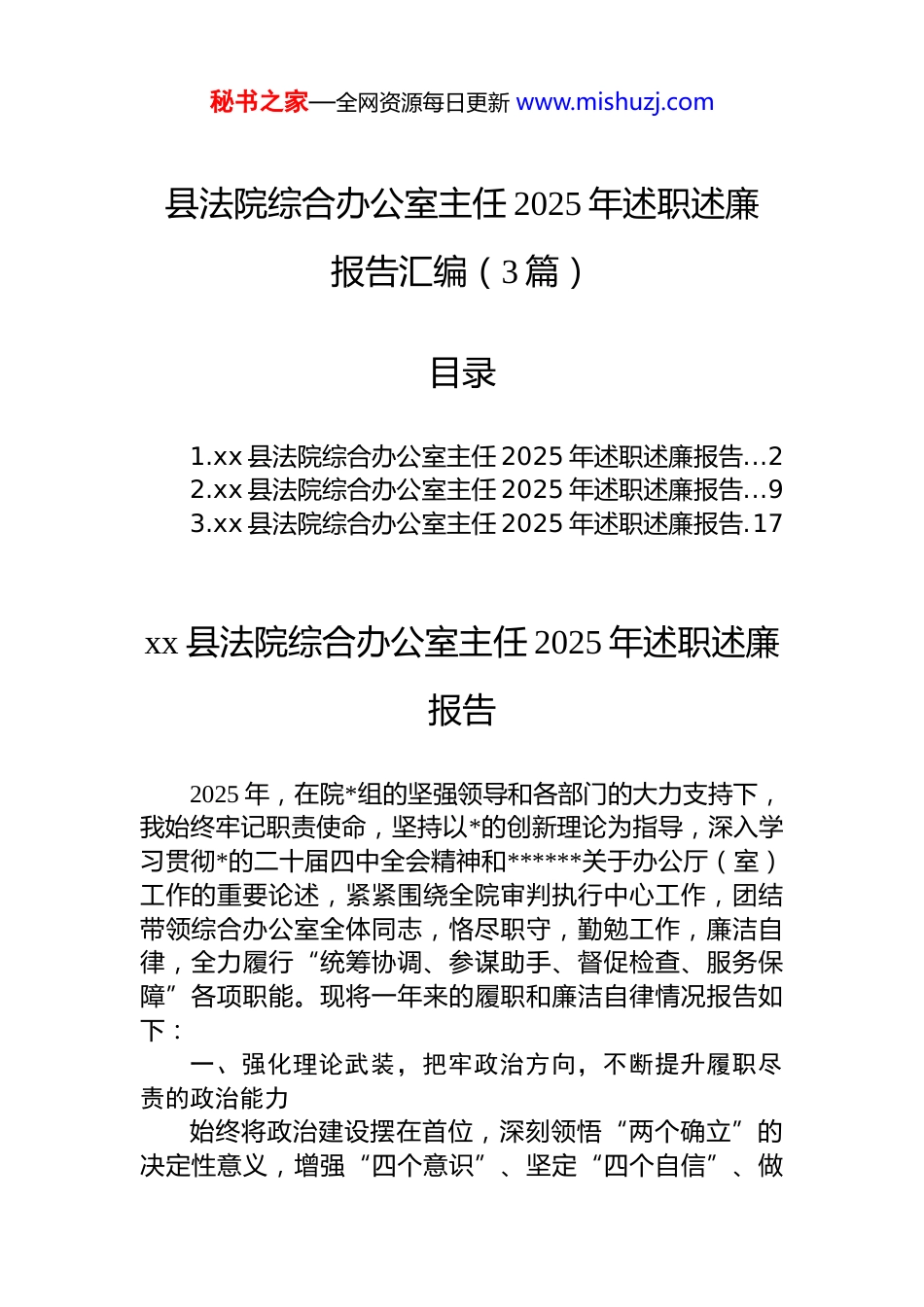 秘书之家—全网资源每日更新 www.mishuzj.com县法院综合办公室主任 2025 年述职述廉报告汇编(3 篇)目录1.xx 县法院综合办公室主任 2025 年述职述廉报告...22.xx 县法院综合办公室主任 2025 年述职述廉报告...93.xx 县法院综合办公室主任 2025 年述职述廉报告.17xx 县法院综合办公室主任 2025 年述职述廉报告2025 年,在院*组的坚强领导和各部门的大力支持下,我始终牢记职责使命,坚持以*的创新理论为指导,深入学习贯彻*的二十届四中全会精神和******关于办公厅(室)工作的重要论述,紧紧围绕全院审判执行中心工作,团结带领综合办公室全体同志,恪尽职守,勤勉工作,廉洁自律,全力履行“统筹协调、参谋助手、督促检查、服务保障”各项职能。现将一年来的履职和廉洁自律情况报告如下:一、强化理论武装,把牢政治方向,不断提升履职尽责的政治能力始终将政治建设摆在首位,深刻领悟“两个确立”的决定性意义,增强“四个意识”、坚定“四个自信”、做秘书之家—全网资源每日更新 www.mishuzj.com到“两个维护”。(一)深学细悟*的创新理论。严格落实“第一议题”制度,将学习贯彻*的二十届四中全会精神作为重中之重,与学习领会******系列重要讲话和指示批示精神结合起来,特别是关于坚持*对司法工作的绝对领导、推进国家治理体系和治理能力现代化、建设更高水平的平安中国法治中国等重要论述。通过参加*组理论学习中心组学习、支部“三会一课”、个人自学等多种形式,努力在学懂弄通做实上下功夫,不断提升政治判断力、政治领悟力、政治执行力确保办公室各项工作始终沿着正确政治方向前进,自觉将学习成果转化为服务保障审判执行工作的具体思路和实际举措。(二)扎实开展专题学习教育。按照上级部署和院*组安排,牵头并积极参与院内各项专题学习教育活动。特别是在深入贯彻中央八项规定精神学习教育方面,坚持把自己摆进去、把职责摆进去、把工作摆进去,带头学习相关规定及实施细则,带头查摆自身在思想、作风、纪律等方面可能存在的问题。组织办公室全体人员重温中央八项规定精神,结合近年来法院系统通报的违反八项规定精神典型案例,开展警示教育,引导大家深刻认识“四风”问题的顽固性、反复性,深刻理解作风建设永远在路上的极端重要性,自觉筑牢拒腐防变的思想防线,将厉行节约、反对浪费、规范公务接待、精简会议文件等要求内化于心、外化于行,贯穿于财务管理、物资采购、后勤保障等各项工作全过程。(三)推动 dj 与业务深度融合。坚持把抓好 dj 作为最大政绩,切实履行办公室 dj 工作责任。以提升组织力为重点,推动办公室*支部标准化规范化建设,严格落实各项组织生活制度。将政治要求融入办公室各项业务工作,教育引导办公室干警胸怀“国之大者”,牢记服务宗旨,在公文处理、会务组织、协调联络、后勤保障等具体工作中体秘书之家—全网资源每日更新 www.mishuzj.com现政治标准、政治要求,确保*的路线方针政策和院*组决策部署在办公室工作中得到不折不扣的贯彻落实。二、聚焦主责主业,积极主动作为,全力服务保障全院工作大局紧紧围绕“服务审判、服务干警、服务群众”的宗旨,立足“工作中枢”定位,努力提升工作精细化、规范化、智能化水平。(一)在发挥参谋助手作用上力求“精准”。对标“参在前、谋在先”要求,密切关注审判执行工作动态和全院重点任务,围绕院*组决策部署,加强调查研究,努力提供有价值的决策参考。全年牵头或参与起草重要文稿、工作报告、情况汇报等材料 xx 余份。健全完善督查督办机制,对*组决议、院长批示、上级交办事项及年度重点工作实行清单化管理、项目化推进、台账式跟踪,明确责任、限定时限,全年督办落实各类事项 745 件,办结率 100%,有效推动了各项工作落地见效。(二)在强化统筹协调效能上务求“高效”。牢固树立“全院一盘棋”思想,积极发挥“润滑剂”“粘合剂”作用。对内,健全部门间常态化协调沟通机制,定期召开协调会,统筹调配资源,合力解决工作中遇到的难点堵点问题,确保机关高效运转。在公文处理上,严格执行《*政机关公文处理工作条例》,优化流程,全年规范收处文件...