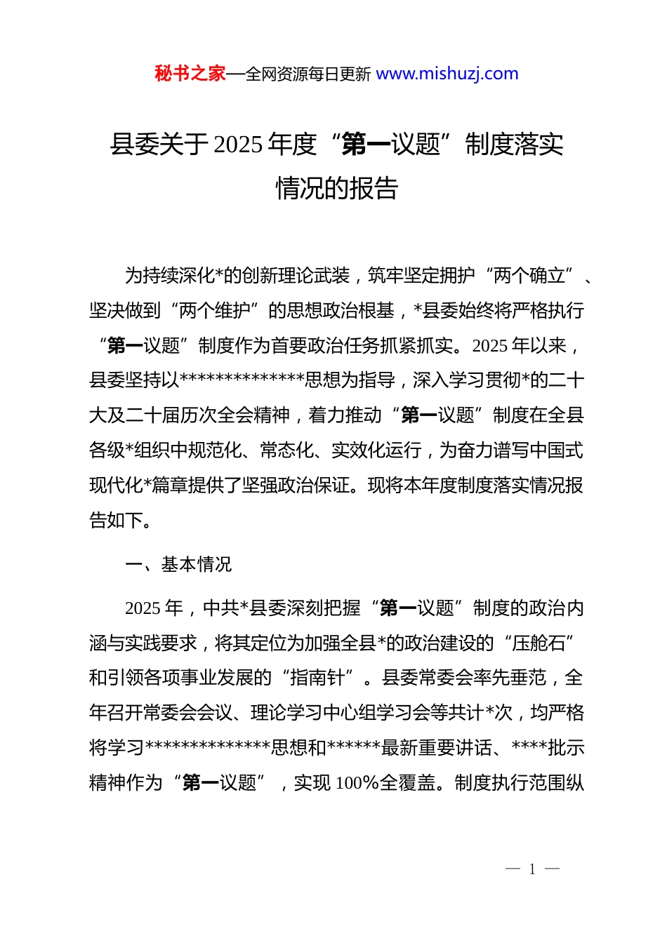 秘书之家—全网资源每日更新 www.mishuzj.com县委关于 2025 年度“第一议题”制度落实情况的报告为持续深化*的创新理论武装,筑牢坚定拥护“两个确立”、坚决做到“两个维护”的思想政治根基,*县委始终将严格执行“第一议题”制度作为首要政治任务抓紧抓实。2025 年以来,县委坚持以**************思想为指导,深入学习贯彻*的二十大及二十届历次全会精神,着力推动“第一议题”制度在全县各级*组织中规范化、常态化、实效化运行,为奋力谱写中国式现代化*篇章提供了坚强政治保证。现将本年度制度落实情况报告如下。一、基本情况2025 年,中共*县委深刻把握“第一议题”制度的政治内涵与实践要求,将其定位为加强全县*的政治建设的“压舱石”和引领各项事业发展的“指南针”。县委常委会率先垂范,全年召开常委会会议、理论学习中心组学习会等共计*次,均严格将学习**************思想和******最新重要讲话、****批示精神作为“第一议题”,实现 100%全覆盖。制度执行范围纵— 1 —秘书之家—全网资源每日更新 www.mishuzj.com向延伸至乡镇(街道)*(工)委、县直单位*组(*委)、村(社区)*支部,横向覆盖国有企业、学校、医院等各领域*组织,构建起“县委—基层*委—*支部—*员”四级联动学习机制。全年累计组织开展各类“第一议题”学习超过*场次,参与学习的*员干部逾*万人次。通过学习,全县上下进一步统一了思想、明确了方向,将***的殷殷嘱托和*中央的决策部署,转化为推动*高质量发展的具体思路、改革举措和工作抓手,在经济发展、民生改善、安全稳定等领域取得了阶段性成效,为完成全年目标任务奠定了坚实理论基础。二、主要做法县委坚持高标准、严要求,多措并举推动“第一议题”制度走深走实,确保*的创新理论入脑入心、见行见效。(一)强化政治引领,压实主体责任链条。一是坚持高位推动,县委主要负责同志认真履行第一责任人职责,亲自审定学习计划、确定学习主题、带头领学研讨,在常委会会议、中心组学习会上率先交流心得体会,以实际行动释放狠抓理论武装的鲜明信号。二是健全责任体系,明确要求各级*组织书记是落实“第一议题”制度的第一责任人,将制度执行情况纳入 dj工作考核和*组织书记述职评议的重要内容,形成“一级抓一级、— 2 —秘书之家—全网资源每日更新 www.mishuzj.com层层抓落实”的工作格局。三是细化制度规范,县委办公室牵头修订完善县委常委会工作规则、理论学习中心组学习制度,制定出台《关于严格执行“第一议题”制度的实施办法》,对学习内容、形式、流程、记录等作出统一规定,为各级*组织提供了清晰明确的“操作手册”。(二)创新学习机制,提升学思践悟质效。一是构建“四级联动”学习模式,推动学习从县委常委会向基层*支部有效传导,确保*中央的最新精神和***的重要要求第一时间传达至每一个*组织和全体*员,全年带动基层开展学习*余场次。二是推行“五种方式”深入学,综合运用个人潜心自学、会议集中领学、深入基层宣讲、*校课堂讲授、交流研讨互学等多种形式,特别是要求领导干部结合分管工作谈认识、讲落实,变“泛泛而谈”为“深度结合”,全年组织专题研讨*次,形成高质量研讨材料*篇。三是打造“线上+线下”双平台,在线下规范“三会一课”、主题*日学习的同时,充分利用“学习强国”平台、政务新媒体矩阵等线上载体,及时推送学习资料、宣传学习动态,拓展学习的广度与深度。(三)聚焦中心工作,推动学习成果转化。一是建立“学习-调研-决策-落实”闭环,要求各级*组织在开展“第一议题”— 3 —秘书之家—全网资源每日更新 www.mishuzj.com学习后,必须结合本地区本部门实际,研究制定具体的贯彻落实举措,将学习成果细化为推动改革发展稳定的任务书、路线图。二是开展“以学促干”专项行动,围绕县委确定的年度重点工作,如乡村振兴、营商环境优化、生态环境保护等,组织*员干部深入一线,运用*的创新理论中蕴含的立场观点方法破解发展难题,全年通过学习推动解决实际问题*个。三是强化典型案例引领,定期梳理总结各级*组织将学习成果转化为实践成效的生动案例,在全县范围内进行宣传推广,形成比学...