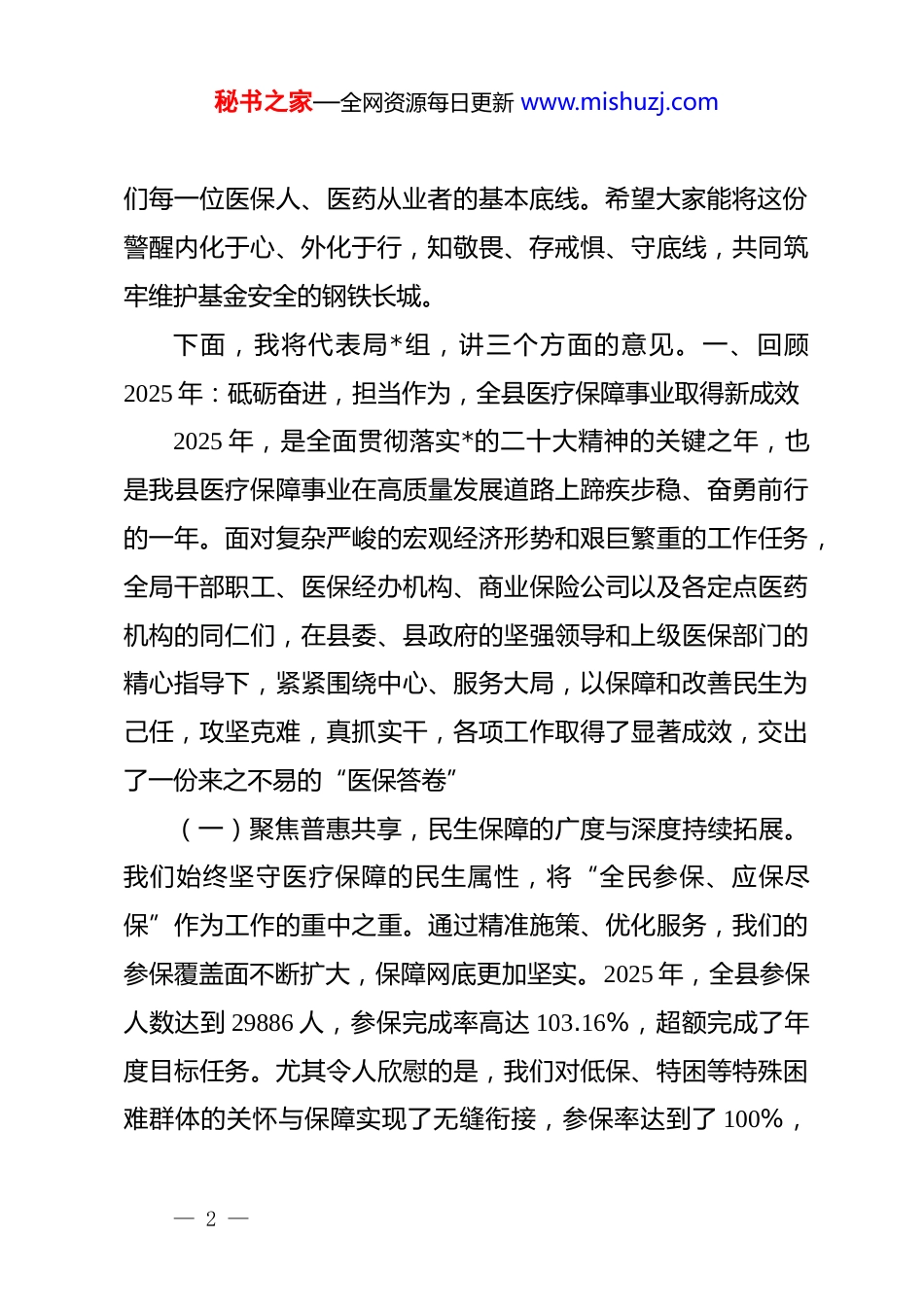 秘书之家—全网资源每日更新 www.mishuzj.com在 xx 县医疗保障局 2025 年度工作总结暨 2026年工作部署会上的讲话同志们,朋友们:大家好!今天,我们齐聚一堂,召开 xx 县医疗保障局 2025 年度工作总结暨 2026 年工作部署会。窗外寒意正浓,但我们室内暖意融融,这股暖意来自于我们过去一年辛勤耕耘的收获,更来自于我们对未来事业发展的共同期盼。本次会议的主题非常明确,就是“总结过往、研判形势、部署未来”。我们既要全面复盘2025 年的工作成效与不足,也要精准把握新时代医疗保障工作面临的新形势、新挑战,更要系统谋划 2026 年的重点任务与路径,从而统一思想、凝聚共识、压实责任,共同推动全县医疗保障事业在新的一年里再启新篇、再创辉煌。刚才,会议以警示教育开篇,我们共同观看了医保基金违规使用典型案例片。一桩桩触目惊心的案例,一个个深刻惨痛的教训,为我们再次敲响了警钟。医保基金是人民群众的“看病钱”“救命钱”,每一分钱都关乎群众的切身利益,关乎社会的公平正义,绝不容许任何形式的侵占和滥用。我们必须深刻认识到,基金监管是我们医保工作的生命线,廉洁自律是我— 1 —秘书之家—全网资源每日更新 www.mishuzj.com们每一位医保人、医药从业者的基本底线。希望大家能将这份警醒内化于心、外化于行,知敬畏、存戒惧、守底线,共同筑牢维护基金安全的钢铁长城。下面,我将代表局*组,讲三个方面的意见。一、回顾2025 年:砥砺奋进,担当作为,全县医疗保障事业取得新成效2025 年,是全面贯彻落实*的二十大精神的关键之年,也是我县医疗保障事业在高质量发展道路上蹄疾步稳、奋勇前行的一年。面对复杂严峻的宏观经济形势和艰巨繁重的工作任务,全局干部职工、医保经办机构、商业保险公司以及各定点医药机构的同仁们,在县委、县政府的坚强领导和上级医保部门的精心指导下,紧紧围绕中心、服务大局,以保障和改善民生为己任,攻坚克难,真抓实干,各项工作取得了显著成效,交出了一份来之不易的“医保答卷”(一)聚焦普惠共享,民生保障的广度与深度持续拓展。我们始终坚守医疗保障的民生属性,将“全民参保、应保尽保”作为工作的重中之重。通过精准施策、优化服务,我们的参保覆盖面不断扩大,保障网底更加坚实。2025 年,全县参保人数达到 29886 人,参保完成率高达 103.16%,超额完成了年度目标任务。尤其令人欣慰的是,我们对低保、特困等特殊困难群体的关怀与保障实现了无缝衔接,参保率达到了 100%,— 2 —秘书之家—全网资源每日更新 www.mishuzj.com确保了在共同富裕的道路上,每一位困难群众都能享受到最基本的医疗保障。同时,医疗救助的托底功能得到充分发挥,全年共惠及 11669 人次,救助金额达到 332.51 万元,有效缓解了因病致贫、因病返贫问题,为巩固拓展脱贫攻坚成果、助力乡村振兴贡献了坚实的医保力量。这组数据的背后,是每一位医保工作者走村入户的辛勤脚步,是每一次政策宣讲的苦口婆心,更是我们对人民承诺的庄严兑现。(二)聚焦基金安全,监管体系的刚性与韧性显著增强。基金安全是医保工作的生命线,我们对此始终保持“零容忍”的高压态态。2025 年,我们以前所未有的决心和力度,构建并深化了“日常检查+智能监控+专项核查”三位一体、多维发力的立体化监管体系。这一体系犹如一张天罗地网,让欺诈骗保行为无处遁形。我们坚持问题导向,通过多轮次、全覆盖的监督检查,牢牢守护住了群众的“看病钱”和“救命钱”。会上通报的数据就是我们工作的最好证明:全年完成省、州、县三级联合检查 25 家次,深入排查并严肃查处了 17 类违规问题,累计追回违规医保基金 112.89 万元,处以行政罚款 1.83 万元,对 38 家次违规定点医药机构进行了严肃约谈。这一系列强有力的举措,不仅有效震慑了违法违规行为,净化了行业风气,更向全社会彰显了我们*和政府严厉打击欺诈骗保、维护医保基金— 3 —秘书之家—全网资源每日更新 www.mishuzj.com安全的坚定立场和钢铁意志。(三)聚焦群众关切,服务供给的效能与温度大幅提升。我们始终秉持“以人民为中心”的发展思想,致力于让医保服务...