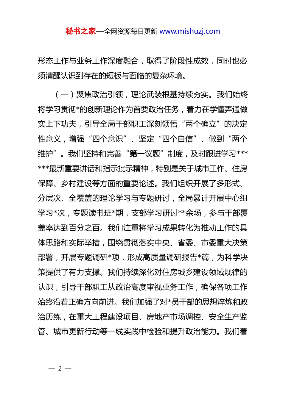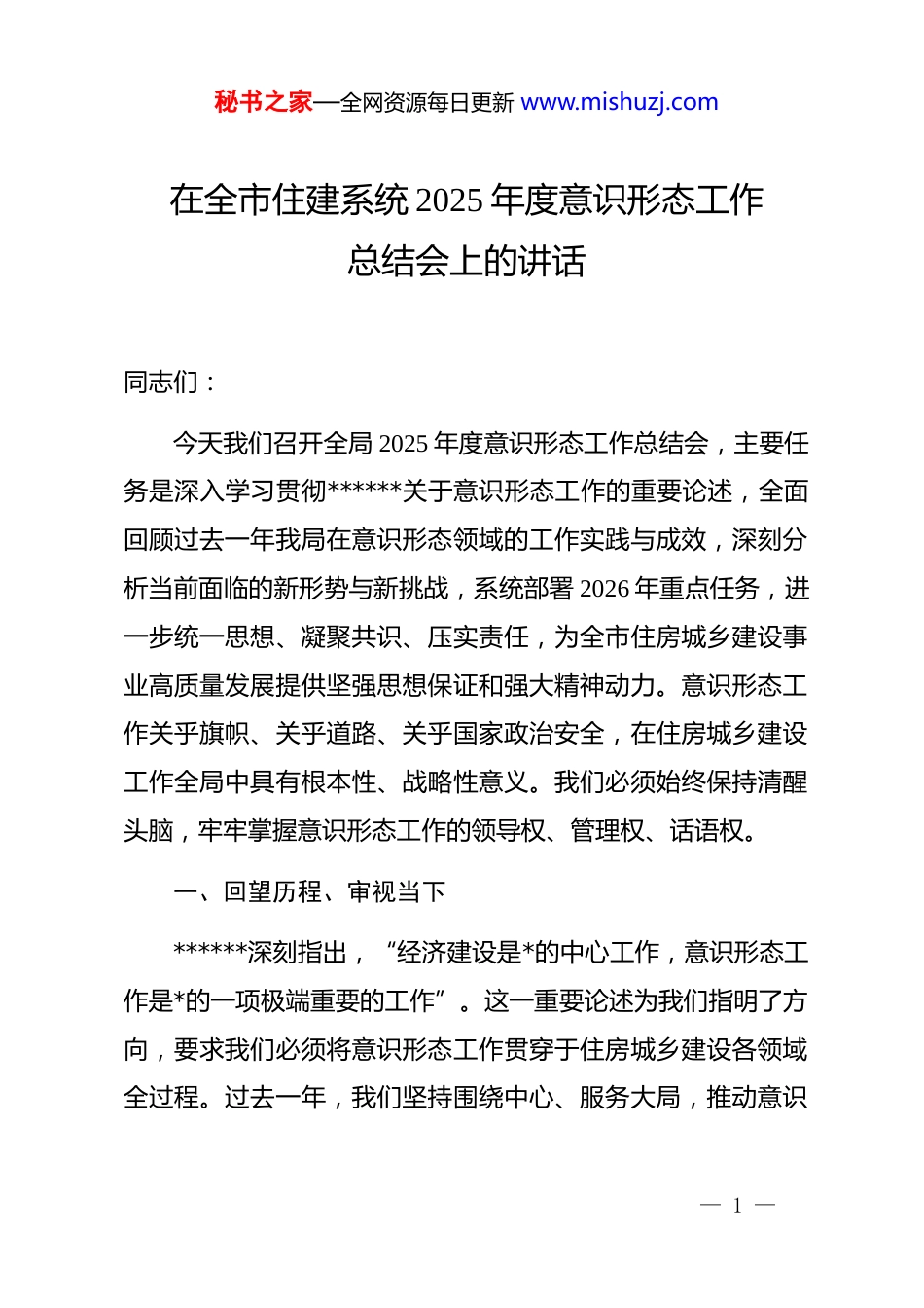 秘书之家—全网资源每日更新 www.mishuzj.com在全市住建系统 2025 年度意识形态工作总结会上的讲话同志们:今天我们召开全局 2025 年度意识形态工作总结会,主要任务是深入学习贯彻******关于意识形态工作的重要论述,全面回顾过去一年我局在意识形态领域的工作实践与成效,深刻分析当前面临的新形势与新挑战,系统部署 2026 年重点任务,进一步统一思想、凝聚共识、压实责任,为全市住房城乡建设事业高质量发展提供坚强思想保证和强大精神动力。意识形态工作关乎旗帜、关乎道路、关乎国家政治安全,在住房城乡建设工作全局中具有根本性、战略性意义。我们必须始终保持清醒头脑,牢牢掌握意识形态工作的领导权、管理权、话语权。一、回望历程、审视当下******深刻指出,“经济建设是*的中心工作,意识形态工作是*的一项极端重要的工作”。这一重要论述为我们指明了方向,要求我们必须将意识形态工作贯穿于住房城乡建设各领域全过程。过去一年,我们坚持围绕中心、服务大局,推动意识— 1 —秘书之家—全网资源每日更新 www.mishuzj.com形态工作与业务工作深度融合,取得了阶段性成效,同时也必须清醒认识到存在的短板与面临的复杂环境。(一)聚焦政治引领,理论武装根基持续夯实。我们始终将学习贯彻*的创新理论作为首要政治任务,着力在学懂弄通做实上下功夫,引导全局干部职工深刻领悟“两个确立”的决定性意义,增强“四个意识”、坚定“四个自信”、做到“两个维护”。我们坚持和完善“第一议题”制度,及时跟进学习******最新重要讲话和指示批示精神,特别是关于城市工作、住房保障、乡村建设等方面的重要论述。我们组织开展了多形式、分层次、全覆盖的理论学习与专题研讨,全局累计开展中心组学习*次,专题读书班*期,支部学习研讨**余场,参与干部覆盖率达到百分之百。我们注重将学习成果转化为推动工作的具体思路和实际举措,围绕贯彻落实中央、省委、市委重大决策部署,开展专题调研*项,形成高质量调研报告*篇,为科学决策提供了有力支撑。我们持续深化对住房城乡建设领域规律的认识,引导干部职工从政治高度审视业务工作,确保各项工作始终沿着正确方向前进。我们加强了对*员干部的思想淬炼和政治历练,在重大工程建设项目、房地产市场调控、安全生产监管、城市更新行动等一线实践中检验和提升政治能力。我们着— 2 —秘书之家—全网资源每日更新 www.mishuzj.com力防范化解意识形态领域风险,定期分析研判住建领域可能存在的风险点,特别是涉及住房公平、工程质量、城市治理等社会关注度高、容易引发舆论炒作的敏感问题,建立了风险预警和应急处置机制。我们坚决反对和抵制各种错误思潮,教育引导干部职工明辨是非、澄清模糊认识,始终保持政治上的坚定性和敏锐性。我们注重发挥领导干部“关键少数”的示范引领作用,要求各级领导干部先学一步、学深一层,带头宣讲、带头实践,带动形成了浓厚的学习氛围。我们积极探索理论宣传大众化路径,运用干部职工喜闻乐见的方式和语言,推动*的创新理论“飞入寻常百姓家”,凝聚起推动住建事业发展的强大正能量。我们认识到,理论武装的深度和广度仍需拓展,学用结合、知行合一的能力有待进一步提升,运用*的创新理论指导复杂局面、破解发展难题的实效性需要持续增强。(二)紧扣中心工作,意识形态阵地守稳筑牢。我们深刻认识到,住房城乡建设领域直接关系民生福祉、关乎社会稳定,本身就是意识形态工作的重要阵地。一年来,我们坚持守土有责、守土负责、守土尽责,全面加强各类阵地建设与管理。我们严格落实网络意识形态工作责任制,加强对局门户网站、政务新媒体平台、内部工作群组的管理,建立健全信息发布审核— 3 —秘书之家—全网资源每日更新 www.mishuzj.com机制,确保网络空间清朗。我们密切关注住建领域网络舆情动态,全年监测处置涉及房地产政策、城市建设、村镇发展、工程质量安全等方面的舆情信息**余条,及时回应社会关切,有效引导了舆论走向。我们强化了对行业报刊、内部资料、宣传栏、电子屏等传统阵地的管理,确保宣传内容的政治性、准确性、导向性。我们加强了对建筑工地、物业小区、房产...