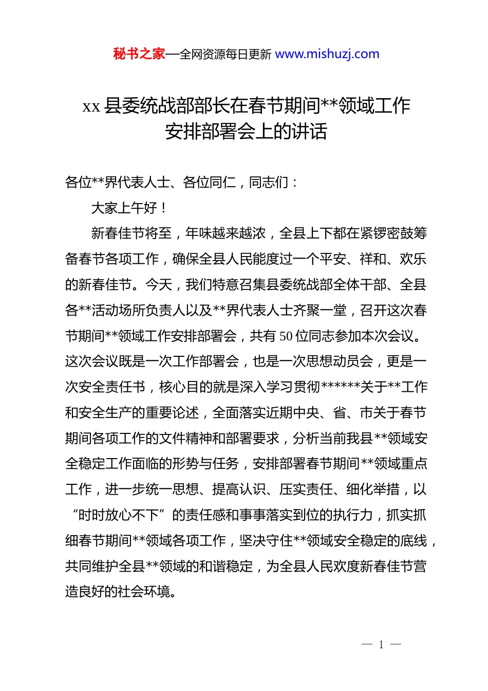 秘书之家—全网资源每日更新 www.mishuzj.comxx 县委统战部部长在春节期间**领域工作安排部署会上的讲话各位**界代表人士、各位同仁,同志们:大家上午好!新春佳节将至,年味越来越浓,全县上下都在紧锣密鼓筹备春节各项工作,确保全县人民能度过一个平安、祥和、欢乐的新春佳节。今天,我们特意召集县委统战部全体干部、全县各**活动场所负责人以及**界代表人士齐聚一堂,召开这次春节期间**领域工作安排部署会,共有 50 位同志参加本次会议。这次会议既是一次工作部署会,也是一次思想动员会,更是一次安全责任书,核心目的就是深入学习贯彻******关于**工作和安全生产的重要论述,全面落实近期中央、省、市关于春节期间各项工作的文件精神和部署要求,分析当前我县**领域安全稳定工作面临的形势与任务,安排部署春节期间**领域重点工作,进一步统一思想、提高认识、压实责任、细化举措,以“时时放心不下”的责任感和事事落实到位的执行力,抓实抓细春节期间**领域各项工作,坚决守住**领域安全稳定的底线,共同维护全县**领域的和谐稳定,为全县人民欢度新春佳节营造良好的社会环境。— 1 —秘书之家—全网资源每日更新 www.mishuzj.com首先,我代表县委统战部,向在座的各位**界代表人士、各**活动场所负责人,以及长期以来奋战在**工作一线的统战干部们,表示衷心的感谢和诚挚的问候!一直以来,大家始终坚持爱国爱教的优良传统,自觉拥护中国共产*的领导,拥护社会主义制度,积极配合县委、县政府的各项工作,在引导信教群众依法依规开展**活动、维护**领域和谐稳定、参与全县经济社会发展和公益慈善事业等方面,做了大量卓有成效的工作,为我县**工作高质量发展奠定了坚实基础。在春节这个特殊的时间节点,希望大家能够继续发扬优良作风,扛起责任、主动作为,共同把春节期间的**领域工作做细做实做好。下面,结合当前工作实际,我讲四个方面的意见,与大家共勉。一、提高政治站位,深刻认识做好春节期间**领域工作的极端重要性**工作是*和国家工作的重要组成部分,事关国家安全、社会稳定、民族团结,事关人民群众的切身利益。******关于**工作的重要论述,为我们做好新时代**工作指明了前进方向、提供了根本遵循;***关于安全生产的****批示,反复强调“发展决不能以牺牲安全为代价”,要求我们始终把人民生命财产安全放在首位,树牢安全发展理念。春节是中华民族最重要的— 2 —秘书之家—全网资源每日更新 www.mishuzj.com传统节日,也是**活动的高峰期,广大信教群众有到**活动场所祈福、礼拜的传统习俗,这一时期**活动场所人员流动量大、祈福活动集中、人员聚集频繁,安全风险防控、活动秩序维护、矛盾纠纷化解等各项任务的艰巨性、复杂性远超平时。做好春节期间**领域工作,不仅是贯彻落实*中央和省、市、县委决策部署的政治要求,更是践行以人民为中心的发展思想、保障广大信教群众和游客生命财产安全的现实需要,也是维护全县社会大局和谐稳定、确保全县人民度过平安祥和春节的重要保障。近期,中央、省、市相继召开会议、下发文件,对春节期间的安全生产、社会稳定、民生保障等各项工作作出了全面部署,其中对**领域的安全管理、活动规范提出了明确要求。我们必须站在政治和全局的高度,深刻认识做好春节期间**领域工作的极端重要性,切实把思想和行动统一到******的重要论述和指示批示精神上来,统一到中央、省、市的部署要求上来,统一到县委、县政府的工作安排上来。全体统战干部、各**活动场所负责人、**界代表人士要切实增强“四个意识”、坚定“四个自信”、做到“两个维护”,始终坚持我国**中国化方向,牢牢把握**工作的主动权,以高度的政治责任感和历史使命感,认真对待春节期间**领域的每一项工作、每一个环节,坚决克服麻痹思想、侥幸心理、松劲心态,把困难估计得更充— 3 —秘书之家—全网资源每日更新 www.mishuzj.com分一些,把风险排查得更全面一些,把举措制定得更周密一些,以严之又严、细之又细、实之又实的工作作风,坚决守住**领域安全稳定的底线,确保春节期间我县**领域各项工作平稳有序开展。二、清醒认清形势,切实增...