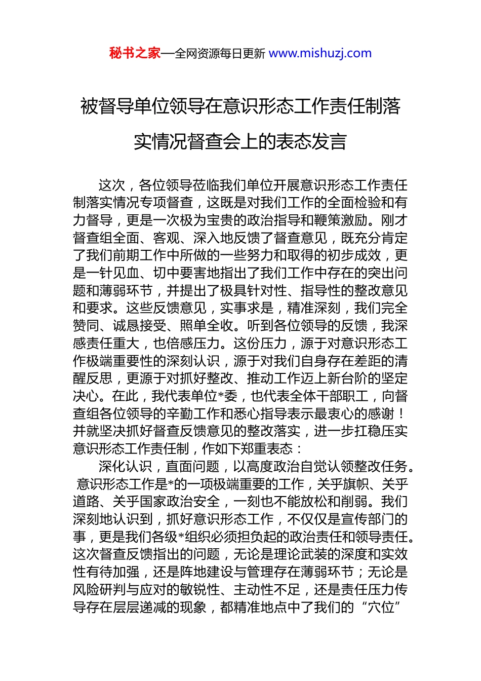 秘书之家—全网资源每日更新 www.mishuzj.com被督导单位领导在意识形态工作责任制落实情况督查会上的表态发言这次,各位领导莅临我们单位开展意识形态工作责任制落实情况专项督查,这既是对我们工作的全面检验和有力督导,更是一次极为宝贵的政治指导和鞭策激励。刚才督查组全面、客观、深入地反馈了督查意见,既充分肯定了我们前期工作中所做的一些努力和取得的初步成效,更是一针见血、切中要害地指出了我们工作中存在的突出问题和薄弱环节,并提出了极具针对性、指导性的整改意见和要求。这些反馈意见,实事求是,精准深刻,我们完全赞同、诚恳接受、照单全收。听到各位领导的反馈,我深感责任重大,也倍感压力。这份压力,源于对意识形态工作极端重要性的深刻认识,源于对我们自身存在差距的清醒反思,更源于对抓好整改、推动工作迈上新台阶的坚定决心。在此,我代表单位*委,也代表全体干部职工,向督查组各位领导的辛勤工作和悉心指导表示最衷心的感谢!并就坚决抓好督查反馈意见的整改落实,进一步扛稳压实意识形态工作责任制,作如下郑重表态:深化认识,直面问题,以高度政治自觉认领整改任务。 意识形态工作是*的一项极端重要的工作,关乎旗帜、关乎道路、关乎国家政治安全,一刻也不能放松和削弱。我们深刻地认识到,抓好意识形态工作,不仅仅是宣传部门的事,更是我们各级*组织必须担负起的政治责任和领导责任。这次督查反馈指出的问题,无论是理论武装的深度和实效性有待加强,还是阵地建设与管理存在薄弱环节;无论是风险研判与应对的敏锐性、主动性不足,还是责任压力传导存在层层递减的现象,都精准地点中了我们的“穴位”秘书之家—全网资源每日更新 www.mishuzj.com揭示了我们在思想认识、责任落实、机制建设、能力水平等方面存在的差距。这些问题,表面上看是具体工作层面的不足,深层次反映的是我们一些同志包括我在内,对意识形态工作的极端重要性、复杂性、严峻性认识还不够到位,政治敏锐性和政治鉴别力有待进一步提高,“抓意识形态是软任务”的错误观念在一定程度上仍然存在,未能真正将意识形态工作与业务工作同部署、同落实、同检查同考核的要求落细落实。面对这些问题,我们绝不回避、绝不遮掩、绝不推诿。我们将把督查反馈问题的整改作为当前一项重大的政治任务,作为检验我们“四个意识”牢不牢、“两个维护”坚定不坚定的试金石,以对*负责、对事业负责、对单位发展负责的态度,化压力为动力,变被动为主动,以闻过则喜、知过即改的胸襟和勇气,全面承接整改任务,坚决彻底抓好落实。聚焦问题,精准施策,以钉钉子精神狠抓整改落实。 发现问题是起点,解决问题才是关键。针对督查组反馈的问题和提出的要求,我们将立即行动,全面部署,坚持问题导向、目标导向、效果导向相统一,制定详实、精准、可操作的整改方案。我们将迅速成立由我担任组长,相关班子成员和部门负责人组成的整改工作领导小组,全面负责整改工作的统筹协调、组织推进和督促检查。对于反馈的每一个具体问题,我们都要建立问题清单、责任清单、任务清单,明确整改目标、整改措施、责任领导、责任部门和完成时限,实行“台账式管理、项目化推进、销号制落实”,确保事事有人抓、件件有着落、条条有整改。在整改过程中,我们将注重分类施策、标本兼治。对于理论学习不够深入系统的问题,我们将进一步完善中心组学习制度,创新学习方式,丰富学习载体,坚持读原著、学原文、悟原理,紧密联系单位实际和干部职工思想动态,着力在学懂弄通做实上下功夫,切实提高运用*的创新理论武装头脑、指导实践、推动工作的能力。对于阵地建设管理秘书之家—全网资源每日更新 www.mishuzj.com存在的漏洞,我们将立即对单位所属的网站、微信公众号宣传栏、内部刊物、各类讲座论坛、研讨会等意识形态阵地进行一次全面彻底的排查清理,健全完善内容审核、发布管理、日常巡查等制度机制,确保各类阵地可管可控、规范有序,绝不给错误思想言论提供任何传播渠道。对于风险研判应对不够敏锐的问题,我们将建立健全意识形态领域风险分析研判机制,定期召开专题会议,密切关注社会思潮动态,密切关注意识...