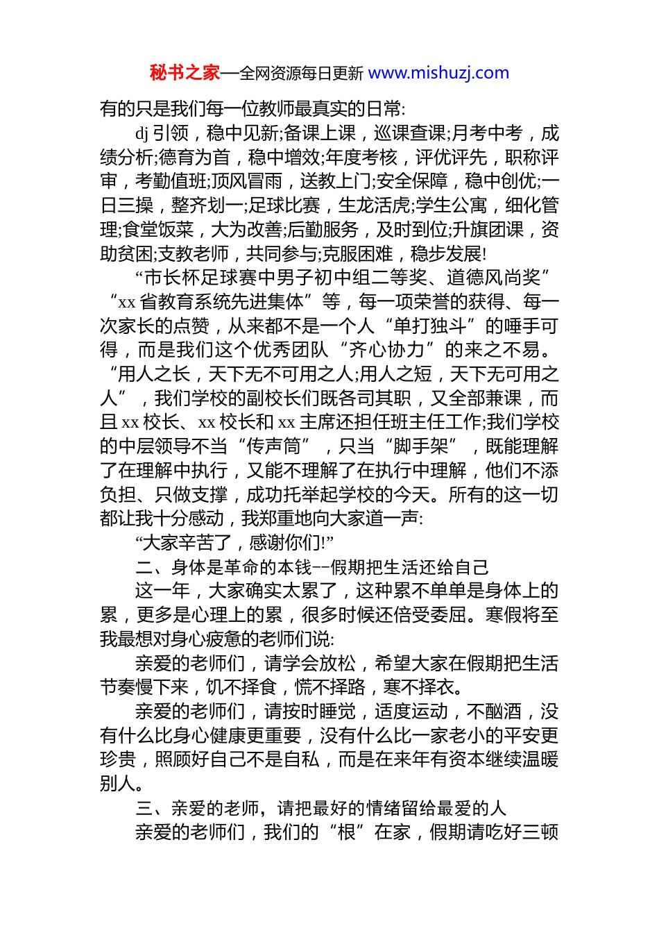 秘书之家—全网资源每日更新 www.mishuzj.com全体教师会议上的讲话:事事难熬事事熬,关关难过关关过亲爱的老师们:大家好!来学校将近一年,非常感谢大家对我个人工作的理解、包容与支持,更感谢大家用无数个日夜的坚守,以德育工作为根本、以课堂教学为核心、以安全管理为保障,心往一处想,劲儿一处使,推动学校稳步发展,借此机会我想给大家分享四段话:一、致敬每一位老师的坚守回首 2025 年,老师们的工作可以用两个字来形容一一“硬扛”。因为这一年应该是我们学校最难的一年:一是新老班子更新带来的诸多不确定因素;二是暑假诸多工程紧赶慢赶;三是食堂开业紧锣密鼓,四是毕业两个班,招收六个班,十名招聘教师和五名支教老师不到位,还退休了五位教师等,直接导致很多老师是以 1.5 倍的工作量“硬扛”了三个月,这看似日复一日的“常规教学”四个字,背后却有着千钧之重。这三个月,我看到的是初为人师的年轻老师,哄好了哭闹的孩子,转身微笑着站上讲台,把课讲得生动有趣,把班级带得井井有条;这三个月,我看到的是许多老教师嗓子哑了含着喉片,腰腿疼了贴着膏药,却没有耽误一节课;这三个月,我看到的是无数个清晨,学生还未完全苏醒,老师已早早到达工作岗位,无数个深夜,教学楼灯火通明,备课、辅导、批改作业,披星戴月回家。现在,一切都过去了,学校没有发生惊天动地的故事,秘书之家—全网资源每日更新 www.mishuzj.com有的只是我们每一位教师最真实的日常:dj 引领,稳中见新;备课上课,巡课查课;月考中考,成绩分析;德育为首,稳中增效;年度考核,评优评先,职称评审,考勤值班;顶风冒雨,送教上门;安全保障,稳中创优;一日三操,整齐划一;足球比赛,生龙活虎;学生公寓,细化管理;食堂饭菜,大为改善;后勤服务,及时到位;升旗团课,资助贫困;支教老师,共同参与;克服困难,稳步发展!“市长杯足球赛中男子初中组二等奖、道德风尚奖”“xx 省教育系统先进集体”等,每一项荣誉的获得、每一次家长的点赞,从来都不是一个人“单打独斗”的唾手可得,而是我们这个优秀团队“齐心协力”的来之不易。“用人之长,天下无不可用之人;用人之短,天下无可用之人”,我们学校的副校长们既各司其职,又全部兼课,而且 xx 校长、xx 校长和 xx 主席还担任班主任工作;我们学校的中层领导不当“传声筒”,只当“脚手架”,既能理解了在理解中执行,又能不理解了在执行中理解,他们不添负担、只做支撑,成功托举起学校的今天。所有的这一切都让我十分感动,我郑重地向大家道一声:“大家辛苦了,感谢你们!”二、身体是革命的本钱--假期把生活还给自己这一年,大家确实太累了,这种累不单单是身体上的累,更多是心理上的累,很多时候还倍受委屈。寒假将至我最想对身心疲惫的老师们说:亲爱的老师们,请学会放松,希望大家在假期把生活节奏慢下来,饥不择食,慌不择路,寒不择衣。亲爱的老师们,请按时睡觉,适度运动,不酗酒,没有什么比身心健康更重要,没有什么比一家老小的平安更珍贵,照顾好自己不是自私,而是在来年有资本继续温暖别人。三、亲爱的老师,请把最好的情绪留给最爱的人亲爱的老师们,我们的“根”在家,假期请吃好三顿秘书之家—全网资源每日更新 www.mishuzj.com饭:第一是父母做的家常饭,热热乎乎不忘本;第二是爱人做的饭,咸甜都要夸,利于家庭和睦;第三是自己亲自下厨做的饭,共同进餐,贴近关系。亲爱的老师们,爱自己的孩子是人,爱别人的孩子是神。平日里我们将太多的耐心都给了学生,寒假是难得的修补家庭关系的最佳契机,多陪陪日渐苍老的父母,尽一份孝心,多帮爱人分担些家务,讲情讲爱不讲理,多蹲下身子和孩子沟通交流,不居高临下地说教,不要只关心孩子“飞得”高不高,多关心孩子“飞得”累不累。四、不要涉及金钱关系一-守法度者最自由我们上班了,关爱学生,对学生一视同仁,出发点再好也不能打学生;我们放假了,教师的身份与职责却永远不能“放假”,越是身心放松的时刻,越要绷紧纪律这根弦要严守师德底线,坚决杜绝有偿补课、违规办班或在培训机构兼职,拒收家长任何礼金、吃请,这是教育的红线,更是职业生涯的生命线。谨慎上网,...