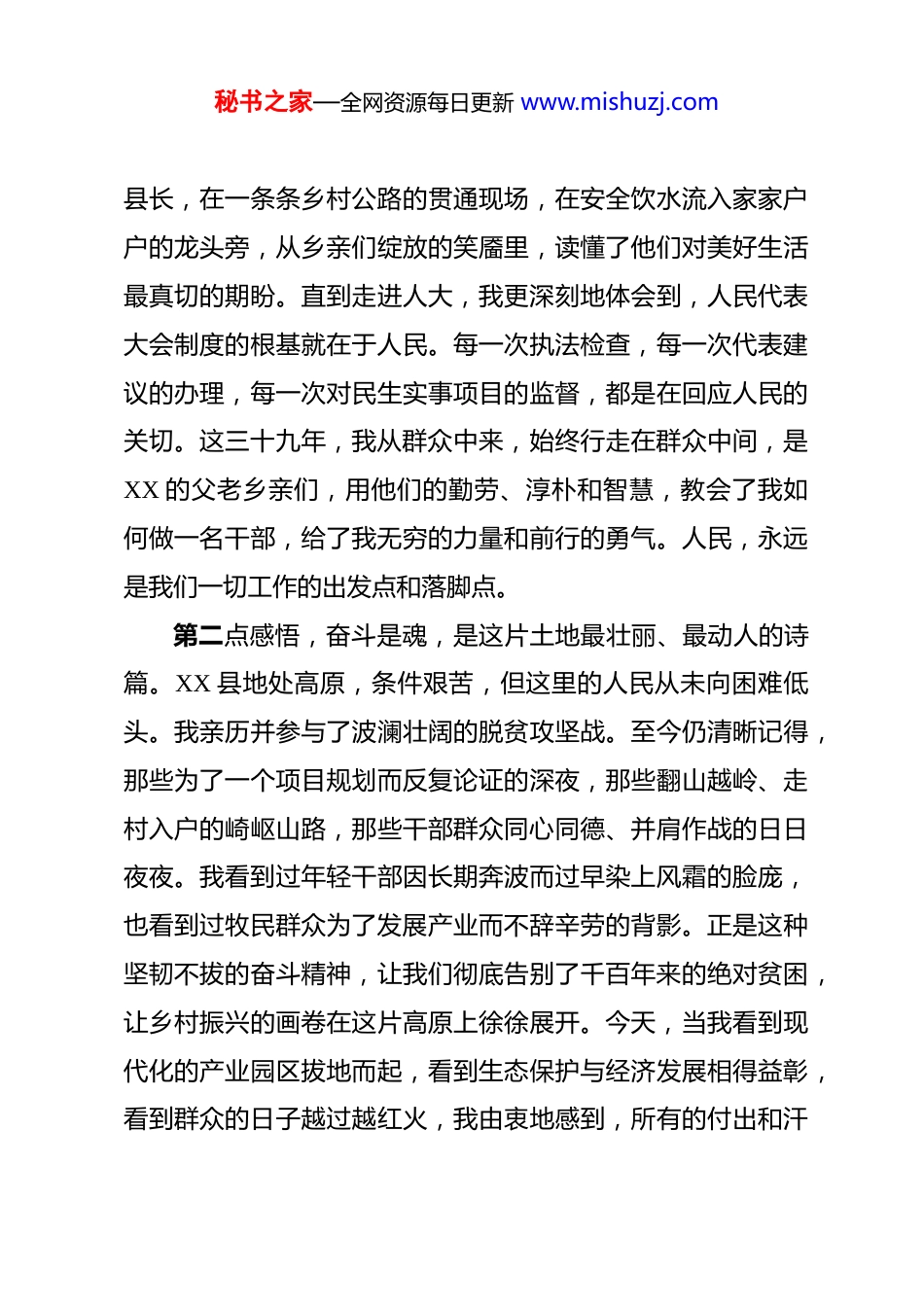 秘书之家—全网资源每日更新 www.mishuzj.com人大主任在县人大常委会会议上的离任感言 各位组成人员,同志们:今天,是我作为县人大常委会主任,最后一次站在这里发言。从三十九年前走上工作岗位,到今天卸下肩头的重任,时光如白驹过隙,转瞬即逝。此时此刻,站在这熟悉的会场,望着一张张熟悉的面孔,我的内心百感交集,既有释然与欣慰,更有无限的感慨与不舍。XX 的山山水水,人大的点点滴滴,如同电影一般在脑海中回放,万语千言,涌上心头。回望这近四十年的职业生涯,就像一场漫长而深刻的旅行从三尺讲台到机关大院,从广阔乡野到政府部门,再到人大的神圣殿堂,我的人生轨迹与 XX 这片土地的发展紧密相连。这些经历,早已不是履历上简单的几行文字,而是熔铸于血脉、镌刻于心底的生命印记。岁月流转,几度春秋,沉淀下来的是三点最为深切的感悟。第一点感悟,人民是根,是这片土地最深沉、最雄浑的力量。三十九年前,我作为一名教师,从孩子们清澈求知的眼神中,看到了 XX 的未来与希望。后来,担任乡镇党委书记,我曾为化解牧民的草场纠纷,在彻夜不熄的帐篷里,握着一双双粗糙而温暖的手,感受到了群众最朴素的信任;我也曾作为副秘书之家—全网资源每日更新 www.mishuzj.com县长,在一条条乡村公路的贯通现场,在安全饮水流入家家户户的龙头旁,从乡亲们绽放的笑靥里,读懂了他们对美好生活最真切的期盼。直到走进人大,我更深刻地体会到,人民代表大会制度的根基就在于人民。每一次执法检查,每一次代表建议的办理,每一次对民生实事项目的监督,都是在回应人民的关切。这三十九年,我从群众中来,始终行走在群众中间,是XX 的父老乡亲们,用他们的勤劳、淳朴和智慧,教会了我如何做一名干部,给了我无穷的力量和前行的勇气。人民,永远是我们一切工作的出发点和落脚点。第二点感悟,奋斗是魂,是这片土地最壮丽、最动人的诗篇。XX 县地处高原,条件艰苦,但这里的人民从未向困难低头。我亲历并参与了波澜壮阔的脱贫攻坚战。至今仍清晰记得,那些为了一个项目规划而反复论证的深夜,那些翻山越岭、走村入户的崎岖山路,那些干部群众同心同德、并肩作战的日日夜夜。我看到过年轻干部因长期奔波而过早染上风霜的脸庞,也看到过牧民群众为了发展产业而不辞辛劳的背影。正是这种坚韧不拔的奋斗精神,让我们彻底告别了千百年来的绝对贫困,让乡村振兴的画卷在这片高原上徐徐展开。今天,当我看到现代化的产业园区拔地而起,看到生态保护与经济发展相得益彰,看到群众的日子越过越红火,我由衷地感到,所有的付出和汗秘书之家—全网资源每日更新 www.mishuzj.com水都是值得的。奋斗,是我们创造一切辉奇迹的制胜法宝。第三点感悟,责任是天,是共产党人最崇高、最神圣的使命。从入党宣誓的那一刻起,责任二字就重于泰山。从当一名干部开始,这份责任就具体到每一项工作、每一件事情上。作为副县长,责任是守护好这里的绿水青山,发展好富民的特色产业;作为市直机关的干部,责任是站在更高的层面为一方发展谋篇布局。而作为人大主任,这份责任更显庄严。它意味着要维护宪法和法律的尊严,确保党的路线方针政策得到贯彻执行;它意味着要尊重代表的主体地位,支持和保障他们依法履职;它意味着要将人民的呼声和期盼,转化为推动政府改进工作的有效监督。我深知能力有限,才学不逮,但我始终怀着一颗对党和人民的赤诚之心,恪尽职守,夙夜在公,不敢有丝毫懈怠。我可以说,面对每一项工作,我尽了一个党员的忠诚;面对每一位同志,我尽了一份公民的良心;面对这份职务,我尽了自己全部的职责。站在这里,心中充满感谢。感谢组织的培养与信任,是组织给了我为人民服务的平台和机会,让我在不同岗位上锻炼成长。感谢历届县委、县政府、县政协、县人武部的领导和同事们,大家和衷共济、密切配合,共同推动了 XX 的持续发展。特别要感谢人大常委会的各位组成人员、各位代表和机关的全秘书之家—全网资源每日更新 www.mishuzj.com体同志们,我们一起走过了许多难忘的岁月,在依法履职的道路上风雨同舟,结下了深厚的情谊。你们的敬业精神、专业素养和无私奉献,时常感动...