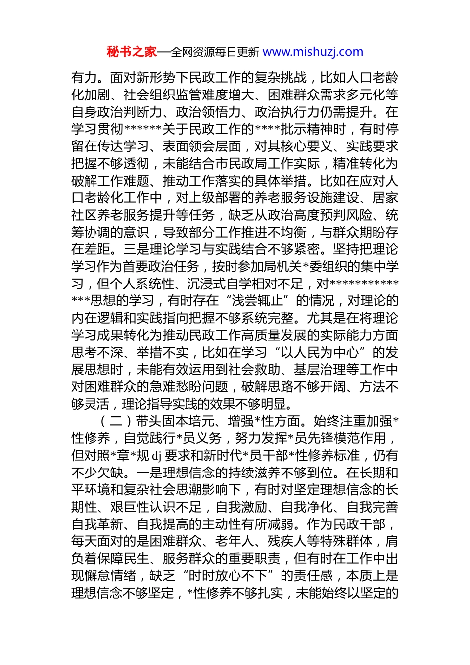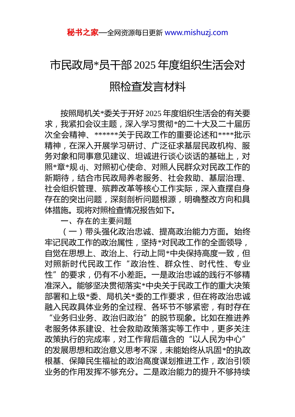 秘书之家—全网资源每日更新 www.mishuzj.com市民政局*员干部 2025 年度组织生活会对照检查发言材料按照局机关*委关于开好 2025 年度组织生活会的有关要求,我紧扣会议主题,深入学习贯彻*的二十大及二十届历次全会精神、******关于民政工作的重要论述和****批示精神,在深入开展学习研讨、广泛征求基层民政机构、服务对象和同事意见建议、坦诚进行谈心谈话的基础上,对照*章*规 dj、对照初心使命、对照人民群众对民政工作的新期待,结合市民政局养老服务、社会救助、基层治理、社会组织管理、殡葬改革等核心工作实际,深入查摆自身存在的突出问题,深刻剖析问题根源,明确整改方向和具体措施。现将对照检查情况报告如下。一、存在的主要问题(一)带头强化政治忠诚、提高政治能力方面。始终牢记民政工作的政治属性,坚持*对民政工作的全面领导,自觉在思想上、政治上、行动上同*中央保持高度一致,但对照新时代民政工作“政治性、群众性、时代性、专业性”的要求,仍有不小差距。一是政治忠诚的践行不够精准深入。能够坚决贯彻落实*中央关于民政工作的重大决策部署和上级*委、局机关*委的工作要求,但在将政治忠诚融入民政具体业务的全过程、各环节不够紧密,有时存在“业务归业务、政治归政治”的脱节现象。比如在推进养老服务体系建设、社会救助政策落实等工作中,更多关注政策执行的完成率,对工作背后蕴含的“以人民为中心”的发展思想和政治意义思考不深,未能始终从巩固*的执政根基、保障民生福祉的政治高度谋划推进工作,政治引领业务的作用发挥不够充分。二是政治能力的提升不够持续秘书之家—全网资源每日更新 www.mishuzj.com有力。面对新形势下民政工作的复杂挑战,比如人口老龄化加剧、社会组织监管难度增大、困难群众需求多元化等自身政治判断力、政治领悟力、政治执行力仍需提升。在学习贯彻******关于民政工作的****批示精神时,有时停留在传达学习、表面领会层面,对其核心要义、实践要求把握不够透彻,未能结合市民政局工作实际,精准转化为破解工作难题、推动工作落实的具体举措。比如在应对人口老龄化工作中,对上级部署的养老服务设施建设、居家社区养老服务提升等任务,缺乏从政治高度预判风险、统筹协调的意识,导致部分工作推进不均衡,与群众期盼存在差距。三是理论学习与实践结合不够紧密。坚持把理论学习作为首要政治任务,按时参加局机关*委组织的集中学习,但个人系统性、沉浸式自学相对不足,对**************思想的学习,有时存在“浅尝辄止”的情况,对理论的内在逻辑和实践指向把握不够系统完整。尤其是在将理论学习成果转化为推动民政工作高质量发展的实际能力方面思考不深、举措不实,比如在学习“以人民为中心”的发展思想时,未能有效运用到社会救助、基层治理等工作中对困难群众的急难愁盼问题,破解思路不够开阔、方法不够灵活,理论指导实践的效果不够明显。(二)带头固本培元、增强*性方面。始终注重加强*性修养,自觉践行*员义务,努力发挥*员先锋模范作用,但对照*章*规 dj 要求和新时代*员干部*性修养标准,仍有不少欠缺。一是理想信念的持续滋养不够到位。在长期和平环境和复杂社会思潮影响下,有时对坚定理想信念的长期性、艰巨性认识不足,自我激励、自我净化、自我完善自我革新、自我提高的主动性有所减弱。作为民政干部,每天面对的是困难群众、老年人、残疾人等特殊群体,肩负着保障民生、服务群众的重要职责,但有时在工作中出现懈怠情绪,缺乏“时时放心不下”的责任感,本质上是理想信念不够坚定,*性修养不够扎实,未能始终以坚定的秘书之家—全网资源每日更新 www.mishuzj.com理想信念支撑民政工作的初心使命。二是*内政治生活的战斗性有待增强。严格按照*内政治生活要求,参加“三会一课”、组织生活会、民主评议*员等活动,但在开展批评与自我批评时,存在“老好人”思想和“走过场”倾向。对自身深层次问题的揭露不够彻底,自我批评多是谈表面现象、找客观原因,缺乏刀刃向内、自我革命的勇气;在相互批评时,顾及同事情面,多是“点到为止”,不敢动真碰硬、直面问题,未能真正达到“红脸出汗、排毒治病”...