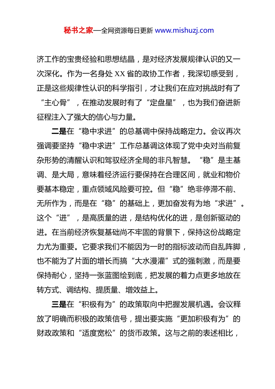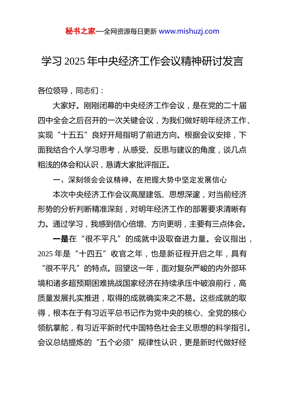 秘书之家—全网资源每日更新 www.mishuzj.com学习 2025 年中央经济工作会议精神研讨发言 各位领导,同志们:大家好。刚刚闭幕的中央经济工作会议,是在党的二十届四中全会之后召开的一次关键会议,为我们做好明年经济工作、实现“十五五”良好开局指明了前进方向。根据会议安排,下面我结合个人学习思考,从感受、反思与建议的角度,谈几点粗浅的体会和认识,恳请大家批评指正。一、深刻领会会议精神,在把握大势中坚定发展信心本次中央经济工作会议高屋建瓴、思想深邃,对当前经济形势的分析判断精准深刻,对明年经济工作的部署要求清晰有力。通过学习,我感到信心倍增、方向更明,主要有三点体会。一是在“很不平凡”的成就中汲取奋进力量。会议指出,2025 年是“十四五”收官之年,也是新征程开启之年,具有“很不平凡”的特点。回望这一年,面对复杂严峻的内外部环境和诸多超预期困难挑战国家经济在持续承压中破浪前行,高质量发展扎实推进,取得的成就确实来之不易。这些成就的取得,根本在于有习近平总书记作为党中央的核心、全党的核心领航掌舵,有习近平新时代中国特色社会主义思想的科学指引。会议总结提炼的“五个必须”规律性认识,更是新时代做好经秘书之家—全网资源每日更新 www.mishuzj.com济工作的宝贵经验和思想结晶,是对经济发展规律认识的又一次深化。作为一名身处 XX 省的政协工作者,我深切感受到,正是这些规律性认识的科学指引,才让我们在应对挑战时有了“主心骨”,在推动发展时有了“定盘星”,也为我们奋进新征程注入了强大的信心与力量。二是在“稳中求进”的总基调中保持战略定力。会议再次强调要坚持“稳中求进”工作总基调这体现了党中央对当前复杂形势的清醒认识和驾驭经济全局的非凡智慧。“稳”是主基调、是大局,意味着经济运行要保持在合理区间,就业和物价要基本稳定,重点领域风险要可控。但“稳”绝非停滞不前、无所作为,而是在“稳”的基础上,更加奋发有为地“求进”。这个“进”,是高质量的进,是结构优化的进,是创新驱动的进。在当前经济恢复基础尚不牢固的背景下,保持这份战略定力尤为重要。它要求我们不能因为一时的指标波动而自乱阵脚,也不能为了片面的增长而搞“大水漫灌”式的强刺激,而是要保持耐心,坚持一张蓝图绘到底,把发展的着力点更多地放在转方式、调结构、提质量、增效益上。三是在“积极有为”的政策取向中把握发展机遇。会议释放了明确而积极的政策信号,提出要实施“更加积极有为”的财政政策和“适度宽松”的货币政策。这与之前的表述相比,秘书之家—全网资源每日更新 www.mishuzj.com在“积极”之后增加了“有为”,在“稳健”之前转向了“宽松”,蕴含着深刻的政策意图和重大的发展机遇。有权威分析预测,明年的财政赤字率可能提升至 4%左右同时将继续发行超长期特别国债和地方政府专项债券这无疑将为扩大有效投资、补齐发展短板提供宝贵的资金支持。对 XX 省而言,这意味着在争取国家重大项目、推进基础设施建设、保障和改善民生等方面,都将迎来一个重要的政策窗口期。我们必须敏锐捕捉这些机遇,提前谋划、主动对接,将中央的政策红利切实转化为推动 XX 高质量发展的强大动力。二、精准聚焦重点任务,在服务大局中找准履职坐标学习会议精神,关键在于结合实际、学以致用。作为 XX市政协的一员,我认为要自觉把政协工作置于国之大者、省之大计中去考量和谋划,找准履职的切入点和发力点,为服务中心大局贡献智慧。一是紧扣扩大内需战略基点,助力畅通经济循环。会议将扩大内需摆在明年经济工作的突出位置,强调要建设强大的国内市场。政协组织人才荟萃、联系广泛,可以在这方面大有作为。我们应当围绕如何激发消费潜能、扩大有效益的投资开展深度调研和协商。比如,聚焦大规模设备更新和消费品以旧换新的“两新”政策落地情况,深入研究如何进一步打通堵点;秘书之家—全网资源每日更新 www.mishuzj.com聚焦养老育幼、医疗健康等服务消费领域的新需求,提出优化供给的对策;聚焦优化营商环境、提振民营企业投资信心通过专题协商、提案办理等方式,推动相关政策的完善与落实,为构建以国...