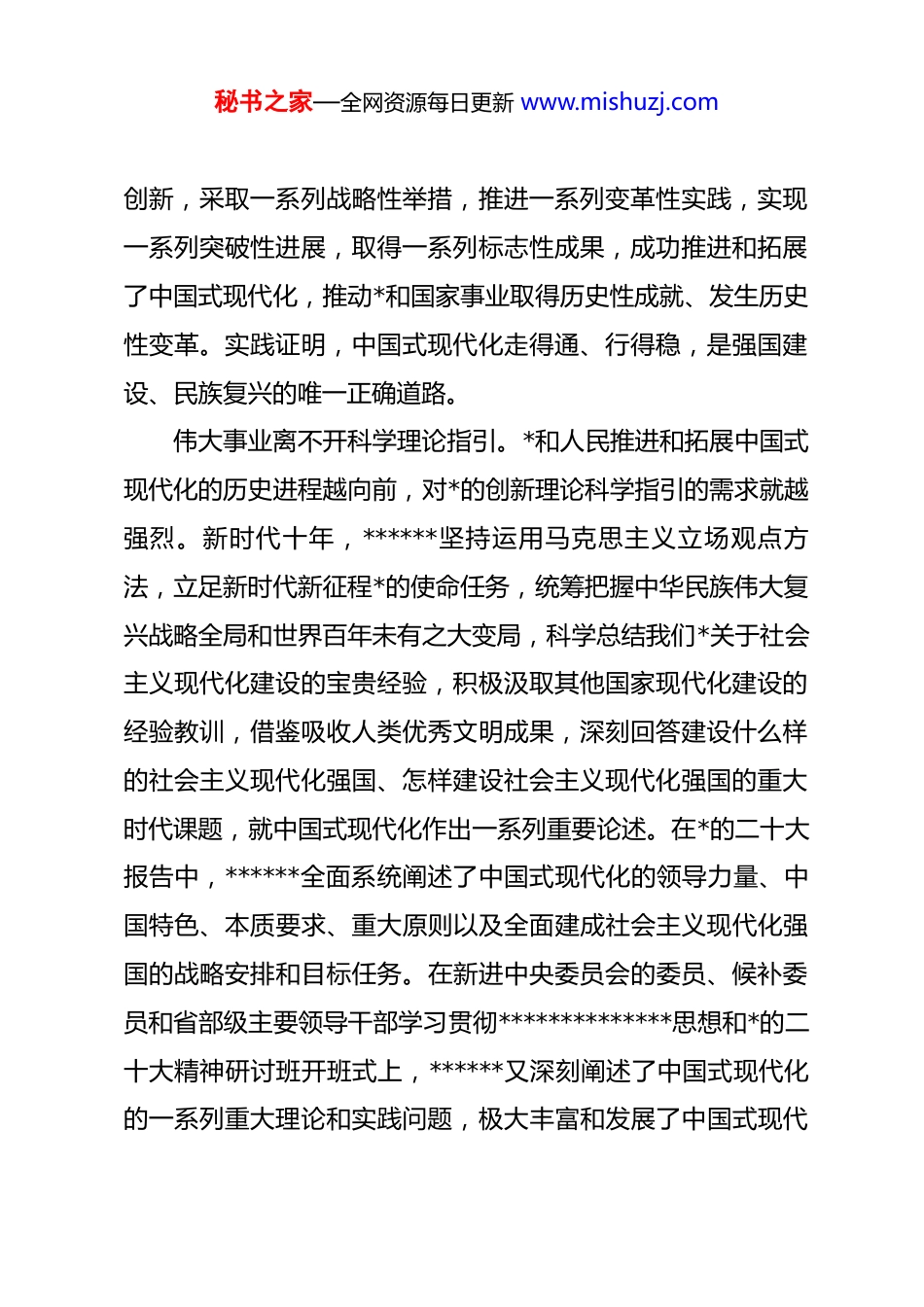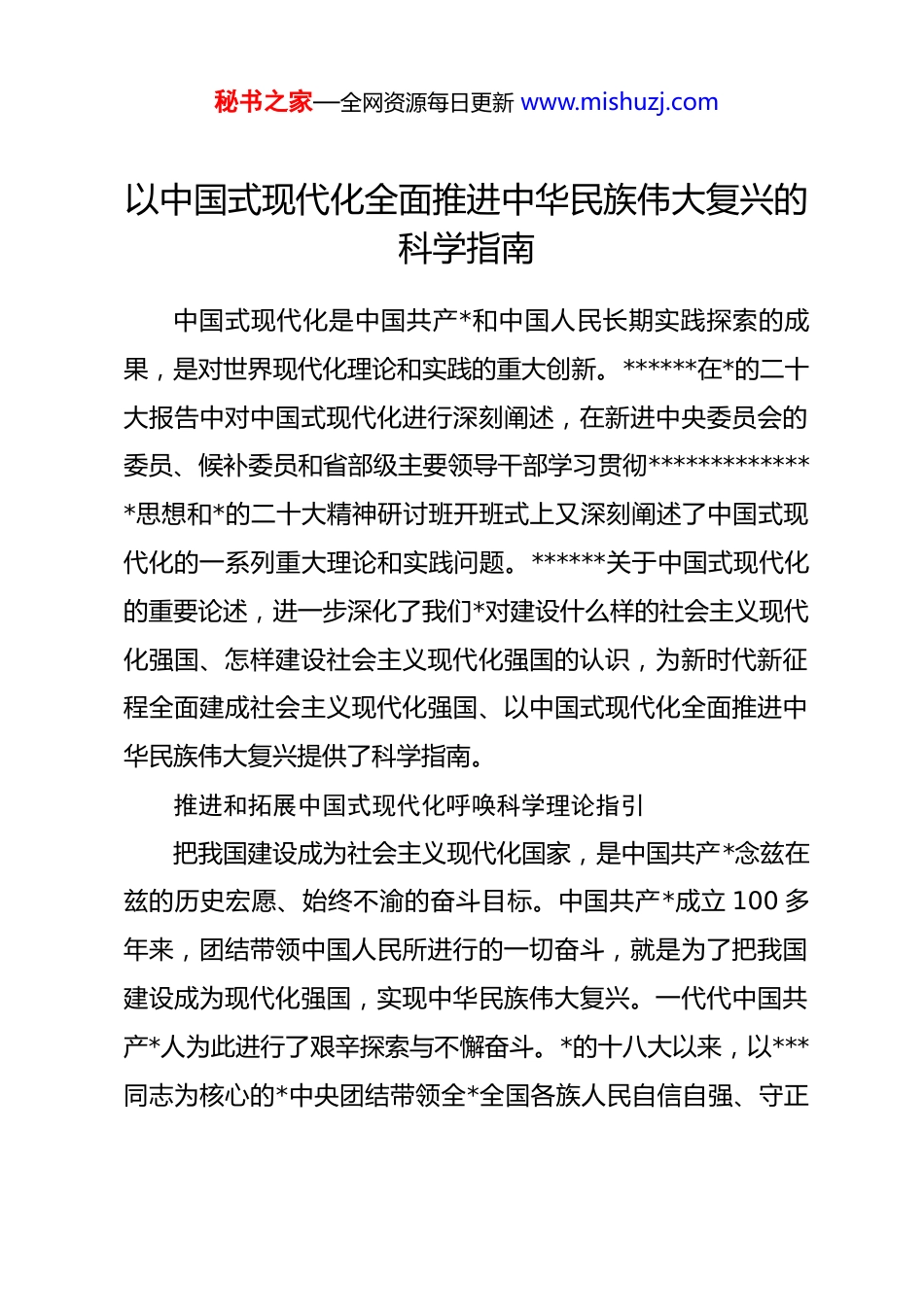 秘书之家—全网资源每日更新 www.mishuzj.com以中国式现代化全面推进中华民族伟大复兴的科学指南中国式现代化是中国共产*和中国人民长期实践探索的成果,是对世界现代化理论和实践的重大创新。******在*的二十大报告中对中国式现代化进行深刻阐述,在新进中央委员会的委员、候补委员和省部级主要领导干部学习贯彻**************思想和*的二十大精神研讨班开班式上又深刻阐述了中国式现代化的一系列重大理论和实践问题。******关于中国式现代化的重要论述,进一步深化了我们*对建设什么样的社会主义现代化强国、怎样建设社会主义现代化强国的认识,为新时代新征程全面建成社会主义现代化强国、以中国式现代化全面推进中华民族伟大复兴提供了科学指南。推进和拓展中国式现代化呼唤科学理论指引把我国建设成为社会主义现代化国家,是中国共产*念兹在兹的历史宏愿、始终不渝的奋斗目标。中国共产*成立 100 多年来,团结带领中国人民所进行的一切奋斗,就是为了把我国建设成为现代化强国,实现中华民族伟大复兴。一代代中国共产*人为此进行了艰辛探索与不懈奋斗。*的十八大以来,以***同志为核心的*中央团结带领全*全国各族人民自信自强、守正秘书之家—全网资源每日更新 www.mishuzj.com创新,采取一系列战略性举措,推进一系列变革性实践,实现一系列突破性进展,取得一系列标志性成果,成功推进和拓展了中国式现代化,推动*和国家事业取得历史性成就、发生历史性变革。实践证明,中国式现代化走得通、行得稳,是强国建设、民族复兴的唯一正确道路。伟大事业离不开科学理论指引。*和人民推进和拓展中国式现代化的历史进程越向前,对*的创新理论科学指引的需求就越强烈。新时代十年,******坚持运用马克思主义立场观点方法,立足新时代新征程*的使命任务,统筹把握中华民族伟大复兴战略全局和世界百年未有之大变局,科学总结我们*关于社会主义现代化建设的宝贵经验,积极汲取其他国家现代化建设的经验教训,借鉴吸收人类优秀文明成果,深刻回答建设什么样的社会主义现代化强国、怎样建设社会主义现代化强国的重大时代课题,就中国式现代化作出一系列重要论述。在*的二十大报告中,******全面系统阐述了中国式现代化的领导力量、中国特色、本质要求、重大原则以及全面建成社会主义现代化强国的战略安排和目标任务。在新进中央委员会的委员、候补委员和省部级主要领导干部学习贯彻**************思想和*的二十大精神研讨班开班式上,******又深刻阐述了中国式现代化的一系列重大理论和实践问题,极大丰富和发展了中国式现代秘书之家—全网资源每日更新 www.mishuzj.com化理论。******关于中国式现代化的重要论述,使中国式现代化更加清晰、更加科学、更加可感可行,为推进和拓展中国式现代化提供了科学理论指引。深刻领会******关于中国式现代化的重要论述******关于中国式现代化的重要论述,为全*前瞻性思考、全局性谋划、整体性推进中国式现代化提供了根本遵循,我们要深入学习领会、认真贯彻落实。关于中国式现代化的领导力量。******指出:“中国式现代化,是中国共产*领导的社会主义现代化”“*的领导直接关系中国式现代化的根本方向、前途命运、最终成败”。*的领导决定中国式现代化的根本性质,确保中国式现代化锚定奋斗目标行稳致远,激发建设中国式现代化的强劲动力,凝聚建设中国式现代化的磅礴力量。推进中国式现代化,必须坚持和加强*的全面领导,充分发挥*总揽全局、协调各方的领导核心作用。关于中国式现代化的中国特色。******指出:“中国式现代化既有各国现代化的共同特征,更有基于自己国情的鲜明特色。”中国式现代化是人口规模巨大的现代化,我国 14 亿多人口整体迈入现代化社会,其规模超过现有发达国家人口的总和,艰巨性和复杂性前所未有;是全体人民共同富裕的现代化,要坚持把实现人民对美好生活的向往作为现代化建设的出秘书之家—全网资源每日更新 www.mishuzj.com发点和落脚点;是物质文明和精神文明相协调的现代化,促进物的全面丰富和人的全面发展;是人与自然和谐共生的现代化,要坚定不移走生产发展、生活富裕、生态良好的文明发展道路;是走和...
