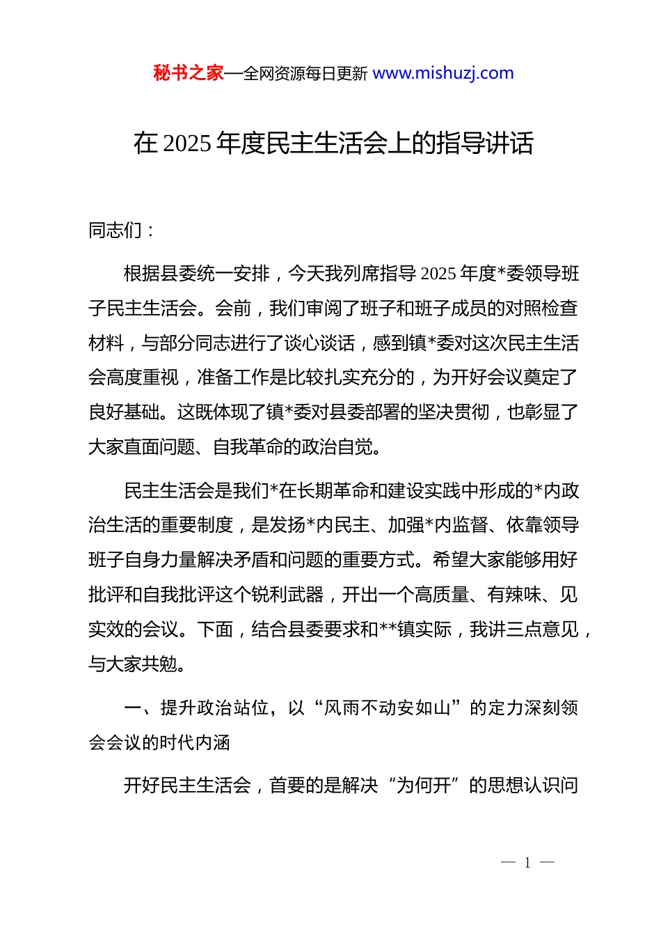 秘书之家—全网资源每日更新 www.mishuzj.com在 2025 年度民主生活会上的指导讲话同志们:根据县委统一安排,今天我列席指导 2025 年度*委领导班子民主生活会。会前,我们审阅了班子和班子成员的对照检查材料,与部分同志进行了谈心谈话,感到镇*委对这次民主生活会高度重视,准备工作是比较扎实充分的,为开好会议奠定了良好基础。这既体现了镇*委对县委部署的坚决贯彻,也彰显了大家直面问题、自我革命的政治自觉。民主生活会是我们*在长期革命和建设实践中形成的*内政治生活的重要制度,是发扬*内民主、加强*内监督、依靠领导班子自身力量解决矛盾和问题的重要方式。希望大家能够用好批评和自我批评这个锐利武器,开出一个高质量、有辣味、见实效的会议。下面,结合县委要求和**镇实际,我讲三点意见,与大家共勉。一、提升政治站位,以“风雨不动安如山”的定力深刻领会会议的时代内涵开好民主生活会,首要的是解决“为何开”的思想认识问— 1 —秘书之家—全网资源每日更新 www.mishuzj.com题。这次会议不仅是一次常规性的年度“政治体检”,更是在全面贯彻落实*的二十大精神、迎接二十届四中全会胜利召开的关键节点上,对我们领导班子政治忠诚、理论武装、能力作风的一次集中检验。(一)这是一次淬炼政治忠诚的“对标看齐”。“所当执者,一而已矣。”对*忠诚,是共产*人首要的政治品质。检验忠诚与否,不能仅看表态,更要看行动、看结果。这次民主生活会,就是要引导大家把自己摆进去、把职责摆进去、把工作摆进去,对照**************思想,对照*中央的决策部署,深入检视我们在捍卫“两个确立”、做到“两个维护”上是否存在温差、落差、偏差。要深刻反思,我们是否将中央精神与**镇的镇情、村情、民情实现了精准滴灌、有机融合?在推动乡村全面振兴、基层社会治理等重点工作中,我们是机械地“照搬照抄”,还是创造性地“开花结果”?通过这次会议,就是要擦亮政治慧眼,校准思想航向,确保在任何时候、任何情况下,我们的思想和行动都能同*中央保持高度一致,确保中央的政令在**镇这片热土上畅通无阻、落地生根。(二)这是一次砥砺斗争精神的“磨刀砺石”。“唯其艰难,方显勇毅。”当前,我们正处在一个船到中流浪更急、人— 2 —秘书之家—全网资源每日更新 www.mishuzj.com到半山路更陡的时期。**镇作为全县发展的重镇,既面临着产业转型升级的阵痛,也承担着生态保护和民生改善的重任。前进道路上,必然会遇到各种“娄山关”“腊子口”。这次民主生活会,就是一个磨砺斗争意志、增强斗争本领的“练兵场”。我们要敢于向顽瘴痼疾“开刀”,检视是否存在安于现状、不思进取的“躺平”心态,是否存在面对矛盾绕道走、遇到困难往上交的“佛系”行为,是否存在工作标准不高、只求过得去的“糊弄”思想。通过动真碰硬的相互批评,就是要让大家“红红脸、出出汗”,在思想交锋中扫除作风之弊、行为之垢,重新点燃干事创业的激情,锻造一支敢于斗争、善于斗争的“铁军”队伍,以昂扬的姿态应对一切风险挑战。(三)这是一次增进班子团结的“加油赋能”。“众人同心,其利断金。”一个坚强有力的领导班子,是事业发展的“主心骨”。团结不是无原则的一团和气,而是建立在共同理想和严格纪律基础上的战斗友谊。这次民主生活会,正是增进团结的“催化剂”和“润滑剂”。一方面,通过推心置腹的自我批评,亮出思想上的“疙瘩”,摆出工作中的“短板”,能够让班子成员之间加深了解、增进理解。另一方面,通过开诚布公的相互批评,本着“惩前毖后、治病救人”的方针,指出— 3 —秘书之家—全网资源每日更新 www.mishuzj.com同志的缺点和不足,既是爱护,也是帮助。我们要坚决摒弃“事不关己、高高挂起”的庸俗哲学,打破“你好我好大家好”的团伙习气,真正让批评和自我批评成为加强班子自身建设的常态化手段,使班子成员在共同“排毒治病”的过程中,思想上更加同心、目标上更加同向、行动上更加同步,凝聚起“一块坚硬的钢铁”般的集体力量。二、坚持严实标准,以“一枝一叶总关情”的态度精准查摆解决突出问题开好民主生活会,关键要解决“怎么开”的方法路...