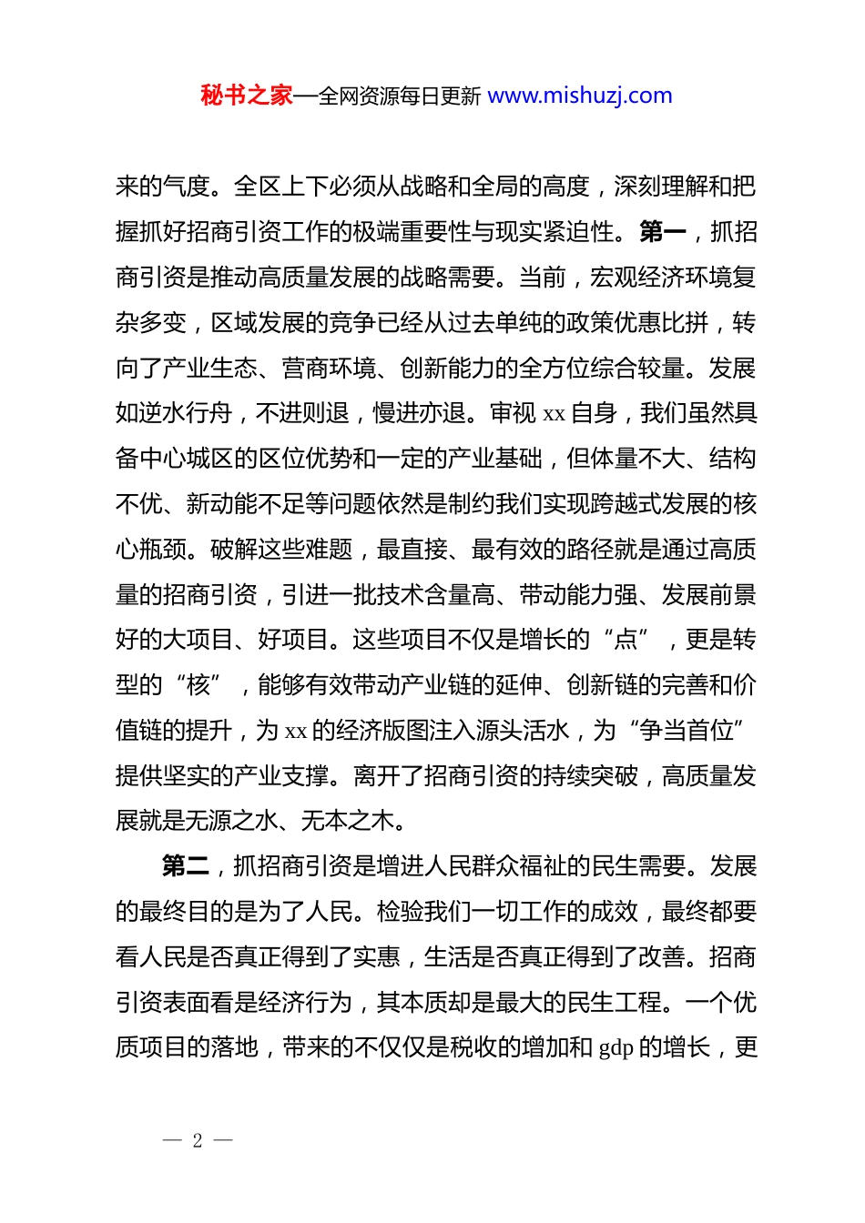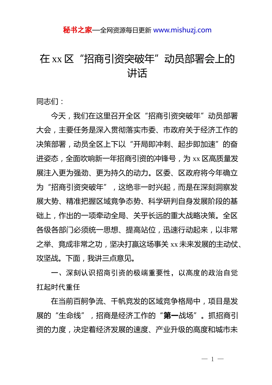 秘书之家—全网资源每日更新 www.mishuzj.com在 xx 区“招商引资突破年”动员部署会上的讲话同志们:今天,我们在这里召开全区“招商引资突破年”动员部署大会,主要任务是深入贯彻落实市委、市政府关于经济工作的决策部署,动员全区上下以“开局即冲刺、起步即加速”的奋进姿态,全面吹响新一年招商引资的冲锋号,为 xx 区高质量发展注入更为强劲、更为持久的动力。区委、区政府将今年确立为“招商引资突破年”,这绝非一时兴起,而是在深刻洞察发展大势、精准把握区域竟争态势、科学研判自身发展阶段的基础上,作出的一项牵动全局、关乎长远的重大战略决策。全区各级各部门必须统一思想、提高站位,迅速行动起来,以非常之举、竟成非常之功,坚决打赢这场事关 xx 未来发展的主动仗、攻坚战。下面,我讲三点意见。一、深刻认识招商引资的极端重要性,以高度的政治自觉扛起时代重任在当前百舸争流、千帆竞发的区域竞争格局中,项目是发展的“生命线”,招商是经济工作的“第一战场”。抓招商引资的力度,决定着经济发展的速度、产业升级的高度和城市未— 1 —秘书之家—全网资源每日更新 www.mishuzj.com来的气度。全区上下必须从战略和全局的高度,深刻理解和把握抓好招商引资工作的极端重要性与现实紧迫性。第一,抓招商引资是推动高质量发展的战略需要。当前,宏观经济环境复杂多变,区域发展的竞争已经从过去单纯的政策优惠比拼,转向了产业生态、营商环境、创新能力的全方位综合较量。发展如逆水行舟,不进则退,慢进亦退。审视 xx 自身,我们虽然具备中心城区的区位优势和一定的产业基础,但体量不大、结构不优、新动能不足等问题依然是制约我们实现跨越式发展的核心瓶颈。破解这些难题,最直接、最有效的路径就是通过高质量的招商引资,引进一批技术含量高、带动能力强、发展前景好的大项目、好项目。这些项目不仅是增长的“点”,更是转型的“核”,能够有效带动产业链的延伸、创新链的完善和价值链的提升,为 xx 的经济版图注入源头活水,为“争当首位”提供坚实的产业支撑。离开了招商引资的持续突破,高质量发展就是无源之水、无本之木。第二,抓招商引资是增进人民群众福祉的民生需要。发展的最终目的是为了人民。检验我们一切工作的成效,最终都要看人民是否真正得到了实惠,生活是否真正得到了改善。招商引资表面看是经济行为,其本质却是最大的民生工程。一个优质项目的落地,带来的不仅仅是税收的增加和 gdp 的增长,更— 2 —秘书之家—全网资源每日更新 www.mishuzj.com意味着成百上千个就业岗位的创造,意味着周边配套服务的完善,意味着公共财政实力的增强,从而让我们有更足的底气去投入教育、医疗、养老、交通等民生事业。只有经济的“蛋糕”做大了,民生改善的“切分”才能更加从容。因此,抓招商就是抓就业,抓项目就是抓收入,抓投资就是抓未来。我们必须将招商引资的成果,实实在在地转化为群众看得见、摸得着的幸福感与获得感。第三,抓招商引资是锤炼干部队伍能力的实践需要。招商引资工作是一块“试金石”,也是一个大熔炉,最能考验一个地区干部的能力、作风和担当。它涉及产业规划、政策法规、金融知识、谈判技巧、项目管理等方方面面,是一项系统性、综合性极强的工作。一支能征善战的招商队伍,必然是一支学习型、研究型、实干型的队伍。干部在招商引资的一线,直面市场、直面客商、直面复杂问题,可以最快地更新知识储备、提升专业素养、磨砺坚韧意志。区委旗帜鲜明地提出,要树立以招商成效比贡献、论政绩、用干部的鲜明导向。谁能为 xx 招来好项目,谁就是功臣;谁在招商一线敢于担当、善于作为,谁就应该得到褒奖和重用。要把招商引资的赛场,变成干部竟相作为的舞台,让想干事、能干事、干成事的干部脱颖而出。二、全面把握招商引资的新趋势新要求,以科学的方法论— 3 —秘书之家—全网资源每日更新 www.mishuzj.com指导攻坚实践面对新形势、新任务,“招商引资突破年”不能是简单的量的重复,而是要在质上有根本性的跃升。必须摒弃过去“捡到篮子都是菜”的粗放模式,转向“提着篮子精挑菜”的精准打法,推动招商...