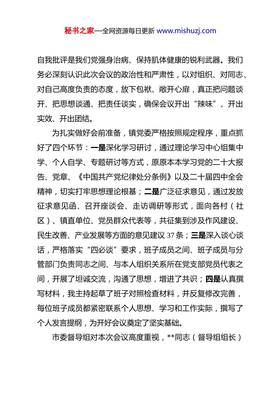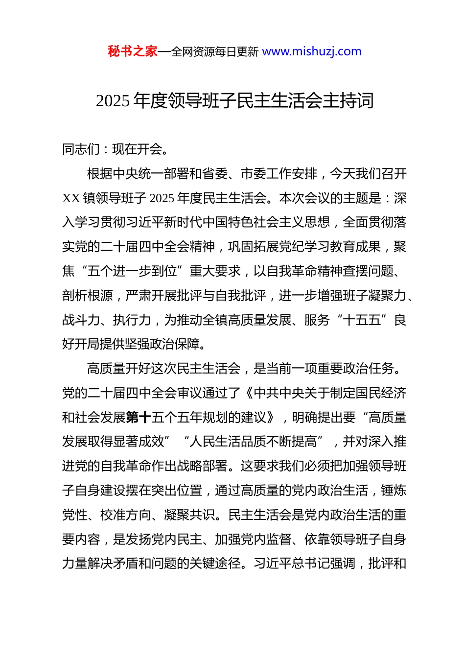 秘书之家—全网资源每日更新 www.mishuzj.com2025 年度领导班子民主生活会主持词 同志们:现在开会。根据中央统一部署和省委、市委工作安排,今天我们召开XX 镇领导班子 2025 年度民主生活会。本次会议的主题是:深入学习贯彻习近平新时代中国特色社会主义思想,全面贯彻落实党的二十届四中全会精神,巩固拓展党纪学习教育成果,聚焦“五个进一步到位”重大要求,以自我革命精神查摆问题、剖析根源,严肃开展批评与自我批评,进一步增强班子凝聚力、战斗力、执行力,为推动全镇高质量发展、服务“十五五”良好开局提供坚强政治保障。高质量开好这次民主生活会,是当前一项重要政治任务。党的二十届四中全会审议通过了《中共中央关于制定国民经济和社会发展第十五个五年规划的建议》,明确提出要“高质量发展取得显著成效”“人民生活品质不断提高”,并对深入推进党的自我革命作出战略部署。这要求我们必须把加强领导班子自身建设摆在突出位置,通过高质量的党内政治生活,锤炼党性、校准方向、凝聚共识。民主生活会是党内政治生活的重要内容,是发扬党内民主、加强党内监督、依靠领导班子自身力量解决矛盾和问题的关键途径。习近平总书记强调,批评和秘书之家—全网资源每日更新 www.mishuzj.com自我批评是我们党强身治病、保持肌体健康的锐利武器。我们务必深刻认识此次会议的政治性和严肃性,以对组织、对同志、对自己高度负责的态度,放下包袱、敞开心扉,真正把问题谈开、把思想谈通、把责任谈实,确保会议开出“辣味”、开出实效、开出团结。为扎实做好会前准备,镇党委严格按照规定程序,重点抓好了四个环节:一是深化学习研讨,通过理论学习中心组集中学、个人自学、专题研讨等方式,原原本本学习党的二十大报告、党章、《中国共产党纪律处分条例》以及二十届四中全会精神,切实打牢思想理论根基;二是广泛征求意见,通过发放征求意见函、召开座谈会、走访调研等形式,面向各村(社区)、镇直单位、党员群众代表等,共征集到涉及作风建设、民生改善、产业发展等方面的意见建议 37 条;三是深入谈心谈话,严格落实“四必谈”要求,班子成员之间、班子成员与分管部门负责同志之间、与本人组织关系所在党支部党员代表之间,开展了坦诚交流,沟通了思想,增进了共识;四是认真撰写材料,我主持起草了班子对照检查材料,并反复修改完善,每位班子成员都紧密联系个人思想、学习和工作实际,撰写了个人发言提纲,为开好会议奠定了坚实基础。市委督导组对本次会议高度重视,**同志(督导组组长)秘书之家—全网资源每日更新 www.mishuzj.com一行亲临会场指导。让我们以热烈的掌声,对督导组各位同志的到来表示诚挚欢迎和衷心感谢!本次会议共有五项议程。下面,逐项进行:第一项议程:由我代表镇领导班子,通报 2024 年度民主生活会查摆问题整改落实情况、2025 年“深入贯彻中央八项规定精神学习教育”问题整改整治情况,以及本次民主生活会会前征求意见建议的梳理汇总情况。(…)通报完毕。第二项议程:由我代表镇领导班子作检视剖析发言。(检视剖析略……)发言完毕。第三项议程:请各位班子成员依次进行个人对照检查发言,并接受其他同志的批评。在开展批评与自我批评时,请大家把握三个原则:一是自我批评要勇于揭短亮丑,不遮掩、不回避,深刻剖析思想根源;二是相互批评要出于公心、实事求是,开门见山、直截了当,真点问题、点真问题;三是态度要诚恳,闻过则喜,有则改之、无则加勉,真正达到“团结—批评—团结”的目的。下面,请**同志首先发言,其他同志依次进行。秘书之家—全网资源每日更新 www.mishuzj.com(班子成员发言与相互批评略……)第四项议程:请市委督导组组长**同志进行点评讲话。大家欢迎!(督导组组长点评略……)感谢**组长所作的客观中肯、精准有力的点评。督导组的讲话,既充分肯定了我们前期的准备工作和会议的整体氛围,也一针见血地指出了我们在理论学习深度、问题查摆广度、整改措施精度等方面存在的不足,更为我们下一步抓好整改落实、加强班子建设提出了明确要求和宝贵意见。这些意见站位高、把脉准、指导性强,对我们今后的...