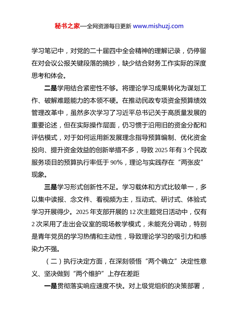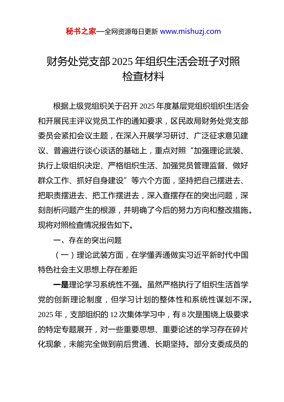 秘书之家—全网资源每日更新 www.mishuzj.com财务处党支部 2025 年组织生活会班子对照检查材料 根据上级党组织关于召开 2025 年度基层党组织组织生活会和开展民主评议党员工作的通知要求,区民政局财务处党支部委员会紧扣会议主题,在深入开展学习研讨、广泛征求意见建议、普遍进行谈心谈话的基础上,重点对照“加强理论武装、执行上级组织决定、严格组织生活、加强党员管理监督、做好群众工作、抓好自身建设”等六个方面,坚持把自己摆进去、把职责摆进去、把工作摆进去,深入查摆存在的突出问题,深刻剖析问题产生的根源,并明确了今后的努力方向和整改措施。现将对照检查情况报告如下。一、存在的突出问题(一)理论武装方面,在学懂弄通做实习近平新时代中国特色社会主义思想上存在差距一是理论学习系统性不强。虽然严格执行了组织生活首学党的创新理论制度,但学习计划的整体性和系统性谋划不深。2025 年,支部组织的 12 次集体学习中,有 8 次是围绕上级要求的特定专题展开,对一些重要思想、重要论述的学习存在碎片化现象,未能完全做到前后贯通、长期坚持。部分支委成员的秘书之家—全网资源每日更新 www.mishuzj.com学习笔记中,对党的二十届四中全会精神的理解记录,仍停留在对会议公报关键段落的摘抄,缺少结合财务工作实际的深度思考和体会。二是学用结合紧密性不够。将理论学习成果转化为谋划工作、破解难题能力的本领不硬。在推动民政专项资金预算绩效管理改革中,虽然多次学习了习近平总书记关于高质量发展的重要论述,但在实际操作层面,仍习惯于沿用旧的资金分配和评估模式,对于如何运用新发展理念指导预算编制、优化资金投向、提升资金效益的创新举措不多,导致 2025 年有 3 个民政服务项目的预算执行率低于 90%,理论与实践存在“两张皮”现象。三是学习形式创新性不足。学习载体和方式比较单一,多以集中读报、念文件、看视频为主,互动式、研讨式、体验式学习开展得少。2025 年支部开展的 12 次主题党日活动中,仅有2 次采用了走出会议室的现场教学模式,未能充分调动,特别是青年党员的学习热情和主动性,导致理论学习的吸引力和感染力不强。(二)执行决定方面,在深刻领悟“两个确立”决定性意义、坚决做到“两个维护”上存在差距一是贯彻落实响应速度不快。对上级党组织的决策部署,秘书之家—全网资源每日更新 www.mishuzj.com有时存在思想上“慢一拍”、行动上“等一等”的现象,缺乏“闻令而动、马上就办”的政治自觉。例如,区委组织部在2025 年 9 月要求各支部全面应用新的智慧党建平台进行党员积分管理,我支部直至 10 月中旬才完成全体党员的信息录入和初步培训,比要求时限延迟了近两周,影响了全局的整体进度。二是服务中心大局站位不高。在思考和推进工作时,有时未能完全跳出财务部门的“一亩三分地”,存在一定的本位主义思想。在 2025 年全局年中预算调整会议上,支部班子成员在讨论资金调剂方案时,为保本部门预算的完整性,对兄弟处室提出的紧急资金需求有所保留,未能从民政事业发展全局的高度主动分忧、积极协调,大局意识和协作精神不强。三是请示报告纪律执行不严。虽然能够遵守重大事项请示报告制度,但有时在一些自认为“常规”或“紧急”的工作上,存在先处理后报告或边处理边报告的情况。2025 年 11 月,为应对突发的审计检查,支部一名委员自行决定调整部分会计资料的整理方式,事后才向支部书记和上级党组织进行口头汇报,程序意识和纪律观念不强。(三)组织生活方面,在增强党内政治生活的政治性、时代性、原则性、战斗性上存在差距一是批评和自我批评辣味不浓。在开展批评和自我批评时,秘书之家—全网资源每日更新 www.mishuzj.com存在“你好我好大家好”的思想,对一些敏感问题、棘手问题不愿触及、不敢深碰。在 2025 年度的专题组织生活会上,班子成员之间的相互批评多以工作建议代替思想交锋,点到为止,未能真正达到“红脸出汗、排毒治病”的效果,组织生活的“熔炉”作用发挥不充分。二是谈心谈话覆盖面不广。支委成员之间、支委与党员之间的谈心谈话多是在组织生活会前或者年度...