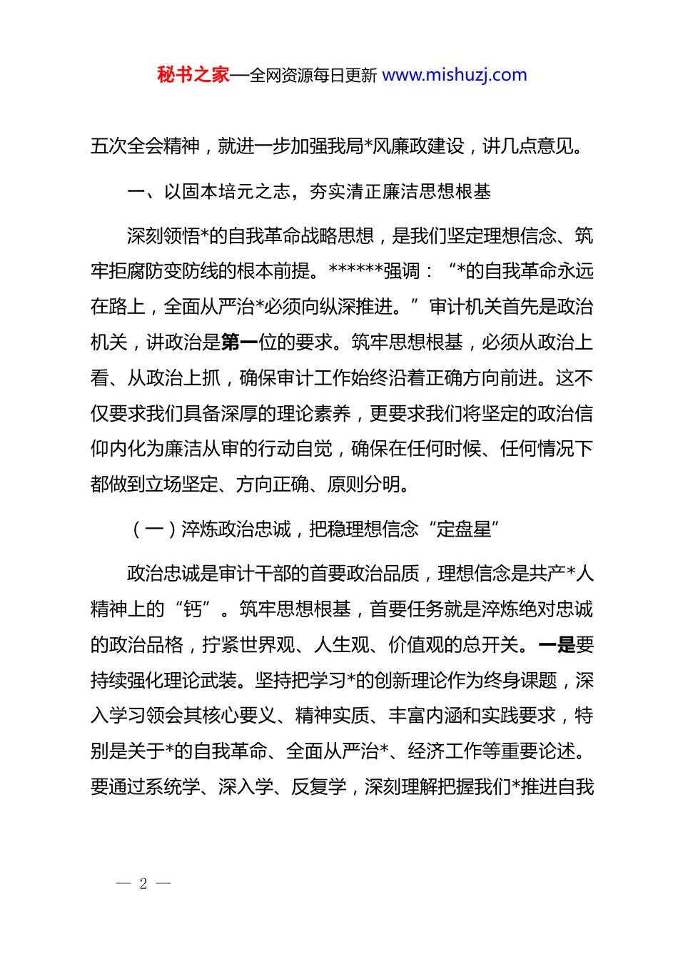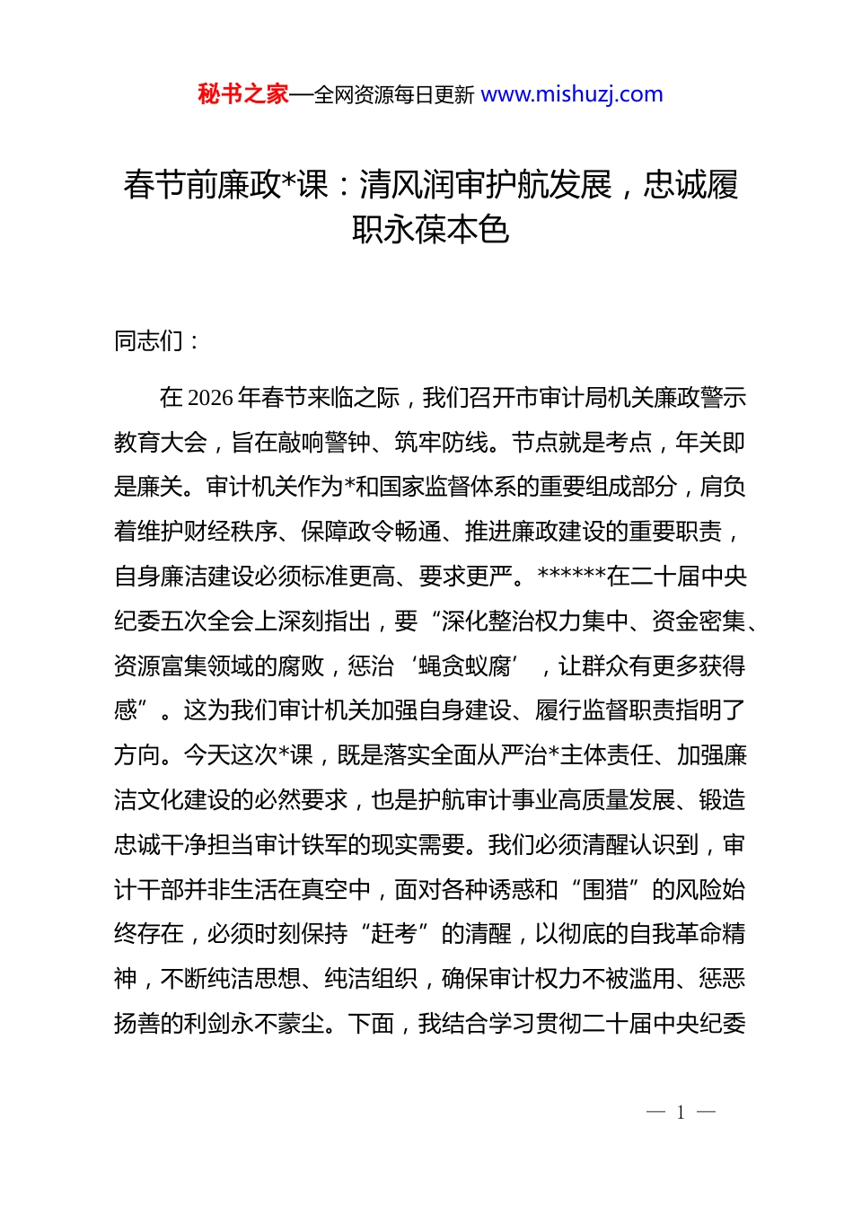 秘书之家—全网资源每日更新 www.mishuzj.com春节前廉政*课:清风润审护航发展,忠诚履职永葆本色同志们:在 2026 年春节来临之际,我们召开市审计局机关廉政警示教育大会,旨在敲响警钟、筑牢防线。节点就是考点,年关即是廉关。审计机关作为*和国家监督体系的重要组成部分,肩负着维护财经秩序、保障政令畅通、推进廉政建设的重要职责,自身廉洁建设必须标准更高、要求更严。******在二十届中央纪委五次全会上深刻指出,要“深化整治权力集中、资金密集、资源富集领域的腐败,惩治‘蝇贪蚁腐’,让群众有更多获得感”。这为我们审计机关加强自身建设、履行监督职责指明了方向。今天这次*课,既是落实全面从严治*主体责任、加强廉洁文化建设的必然要求,也是护航审计事业高质量发展、锻造忠诚干净担当审计铁军的现实需要。我们必须清醒认识到,审计干部并非生活在真空中,面对各种诱惑和“围猎”的风险始终存在,必须时刻保持“赶考”的清醒,以彻底的自我革命精神,不断纯洁思想、纯洁组织,确保审计权力不被滥用、惩恶扬善的利剑永不蒙尘。下面,我结合学习贯彻二十届中央纪委— 1 —秘书之家—全网资源每日更新 www.mishuzj.com五次全会精神,就进一步加强我局*风廉政建设,讲几点意见。一、以固本培元之志,夯实清正廉洁思想根基深刻领悟*的自我革命战略思想,是我们坚定理想信念、筑牢拒腐防变防线的根本前提。******强调:“*的自我革命永远在路上,全面从严治*必须向纵深推进。”审计机关首先是政治机关,讲政治是第一位的要求。筑牢思想根基,必须从政治上看、从政治上抓,确保审计工作始终沿着正确方向前进。这不仅要求我们具备深厚的理论素养,更要求我们将坚定的政治信仰内化为廉洁从审的行动自觉,确保在任何时候、任何情况下都做到立场坚定、方向正确、原则分明。(一)淬炼政治忠诚,把稳理想信念“定盘星”政治忠诚是审计干部的首要政治品质,理想信念是共产*人精神上的“钙”。筑牢思想根基,首要任务就是淬炼绝对忠诚的政治品格,拧紧世界观、人生观、价值观的总开关。一是要持续强化理论武装。坚持把学习*的创新理论作为终身课题,深入学习领会其核心要义、精神实质、丰富内涵和实践要求,特别是关于*的自我革命、全面从严治*、经济工作等重要论述。要通过系统学、深入学、反复学,深刻理解把握我们*推进自我— 2 —秘书之家—全网资源每日更新 www.mishuzj.com革命的战略擘画,深刻认识审计工作在*和国家监督体系中的地位作用,不断提高政治判断力、政治领悟力、政治执行力,自觉用科学理论观察审计形势、分析审计问题、指导审计实践,确保审计工作的政治立场、政治方向、政治原则、政治道路同*中央保持高度一致。二是要坚守理想信念高地。理想信念动摇是最危险的动摇,理想信念滑坡是最危险的滑坡。审计干部必须补足精神之“钙”,始终坚定对马克思主义的信仰、对中国特色社会主义的信念、对实现中华民族伟大复兴中国梦的信心。要结合巩固拓展 zt 教育成果,常态化开展*性教育和*性锻炼,重温入*誓词,学习*的光辉历史,传承红色审计基因,从*的百年奋斗历程中汲取智慧和力量,不断筑牢信仰之基、把稳思想之舵、补足精神之钙,让坚定的理想信念成为抵御各种诱惑、经受任何考验的“压舱石”和“金刚不坏之身”。三是要自觉锤炼政治品格。政治忠诚不是抽象的口号,必须体现在具体行动上。审计干部要时刻牢记自己的第一身份是共产*员,第一职责是为*工作,自觉把讲政治的要求贯穿审计工作全过程各方面。在审计项目中,要善于从政治高度审视经济社会发展问题,关注*中央重大政策措施落实情况,揭示重大经济风险隐患,推动解决群众急难愁盼问题,确保*中央决策部署到哪里,审计监督就跟进到哪里。在原则问题上,要敢于亮剑、善于斗争,坚决— 3 —秘书之家—全网资源每日更新 www.mishuzj.com同一切违反财经纪律、损害群众利益、危害国家经济安全的行为作斗争,以实际行动诠释对*的绝对忠诚。四是要严守政治纪律规矩。政治纪律和政治规矩是审计干部必须遵守的生命线。要时刻绷紧政治纪律这根弦,严格遵守*的各项纪律特别是政治纪律和组织纪律,坚决...