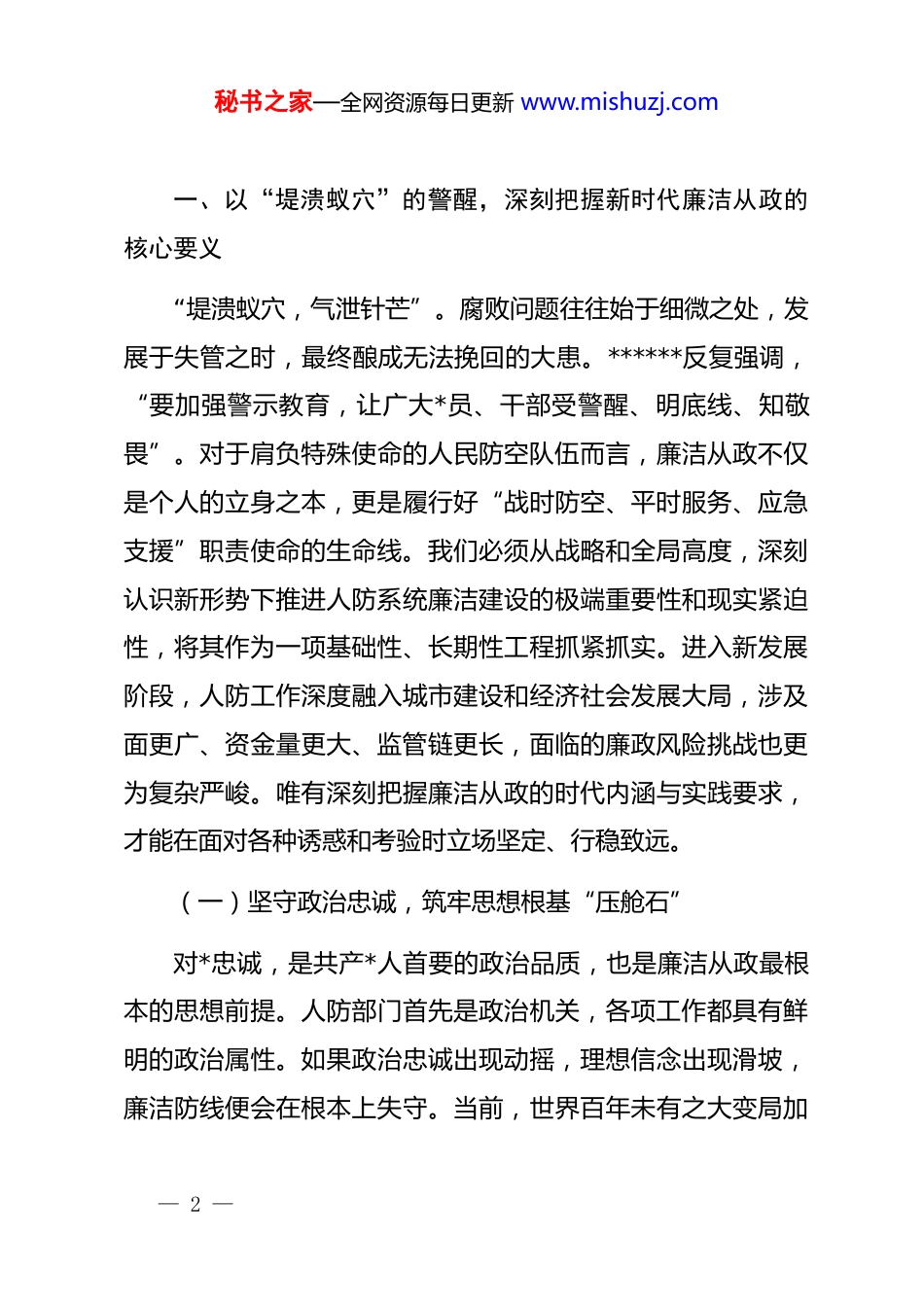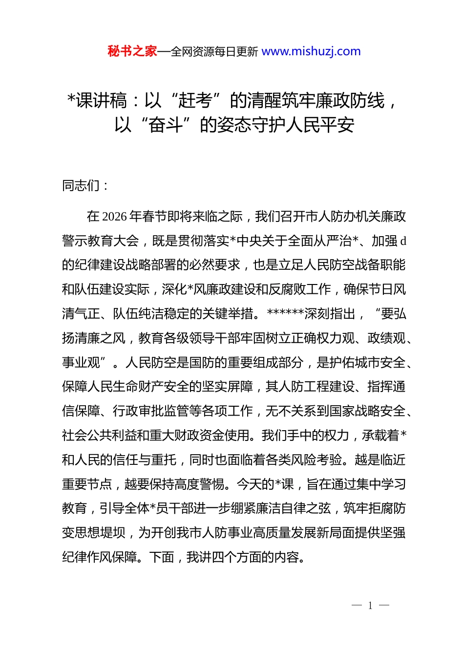 秘书之家—全网资源每日更新 www.mishuzj.com*课讲稿:以“赶考”的清醒筑牢廉政防线,以“奋斗”的姿态守护人民平安同志们:在 2026 年春节即将来临之际,我们召开市人防办机关廉政警示教育大会,既是贯彻落实*中央关于全面从严治*、加强 d的纪律建设战略部署的必然要求,也是立足人民防空战备职能和队伍建设实际,深化*风廉政建设和反腐败工作,确保节日风清气正、队伍纯洁稳定的关键举措。******深刻指出,“要弘扬清廉之风,教育各级领导干部牢固树立正确权力观、政绩观、事业观”。人民防空是国防的重要组成部分,是护佑城市安全、保障人民生命财产安全的坚实屏障,其人防工程建设、指挥通信保障、行政审批监管等各项工作,无不关系到国家战略安全、社会公共利益和重大财政资金使用。我们手中的权力,承载着*和人民的信任与重托,同时也面临着各类风险考验。越是临近重要节点,越要保持高度警惕。今天的*课,旨在通过集中学习教育,引导全体*员干部进一步绷紧廉洁自律之弦,筑牢拒腐防变思想堤坝,为开创我市人防事业高质量发展新局面提供坚强纪律作风保障。下面,我讲四个方面的内容。— 1 —秘书之家—全网资源每日更新 www.mishuzj.com一、以“堤溃蚁穴”的警醒,深刻把握新时代廉洁从政的核心要义“堤溃蚁穴,气泄针芒”。腐败问题往往始于细微之处,发展于失管之时,最终酿成无法挽回的大患。******反复强调,“要加强警示教育,让广大*员、干部受警醒、明底线、知敬畏”。对于肩负特殊使命的人民防空队伍而言,廉洁从政不仅是个人的立身之本,更是履行好“战时防空、平时服务、应急支援”职责使命的生命线。我们必须从战略和全局高度,深刻认识新形势下推进人防系统廉洁建设的极端重要性和现实紧迫性,将其作为一项基础性、长期性工程抓紧抓实。进入新发展阶段,人防工作深度融入城市建设和经济社会发展大局,涉及面更广、资金量更大、监管链更长,面临的廉政风险挑战也更为复杂严峻。唯有深刻把握廉洁从政的时代内涵与实践要求,才能在面对各种诱惑和考验时立场坚定、行稳致远。(一)坚守政治忠诚,筑牢思想根基“压舱石”对*忠诚,是共产*人首要的政治品质,也是廉洁从政最根本的思想前提。人防部门首先是政治机关,各项工作都具有鲜明的政治属性。如果政治忠诚出现动摇,理想信念出现滑坡,廉洁防线便会在根本上失守。当前,世界百年未有之大变局加— 2 —秘书之家—全网资源每日更新 www.mishuzj.com速演进,意识形态领域斗争复杂尖锐,各种思潮相互激荡。我们必须持续强化理论武装,深入学习领会**************思想,特别是******关于全面从严治*、国防和军队建设、总体国家安全观的重要论述,深刻理解其核心要义、精神实质、丰富内涵和实践要求。要将坚定拥护“两个确立”、坚决做到“两个维护”作为最高政治原则和根本政治规矩,不断提高政治判断力、政治领悟力、政治执行力。要深刻认识人防工作的政治意义和战略价值,将其置于国家发展和安全大局中考量,确保人防事业始终沿着正确政治方向前进。要把对*忠诚内化于心、外化于行,自觉在思想上政治上行动上同*中央保持高度一致,坚决贯彻落实*中央关于人民防空的各项决策部署和省委、市委的工作要求。要严肃*内政治生活,严格执行民主集中制,用好批评和自我批评武器,不断增强*内政治生活的政治性、时代性、原则性、战斗性。要通过持续不断的思想淬炼和政治历练,补足精神之“钙”,筑牢信仰之“基”,把稳思想之“舵”,使忠诚干净担当成为人防*员干部最鲜明的政治底色。(二)恪守为民宗旨,校准权力行使“定盘星”人民防空为人民,这是我们一切工作的出发点和落脚点。权力是人民赋予的,只能用来为人民服务。******强调,“必— 3 —秘书之家—全网资源每日更新 www.mishuzj.com须牢记我们的共和国是中华人民共和国,始终要把人民放在心中最高的位置,始终全心全意为人民服务,始终为人民利益和幸福而努力工作”。人防工作中的项目审批、质量监管、易地建设费征收使用、平战结合工程管理、防空警报设施维护等,每一项权力的运行都直接或间接关系到人民群众的安全福祉、社会公平正义和市场营商...