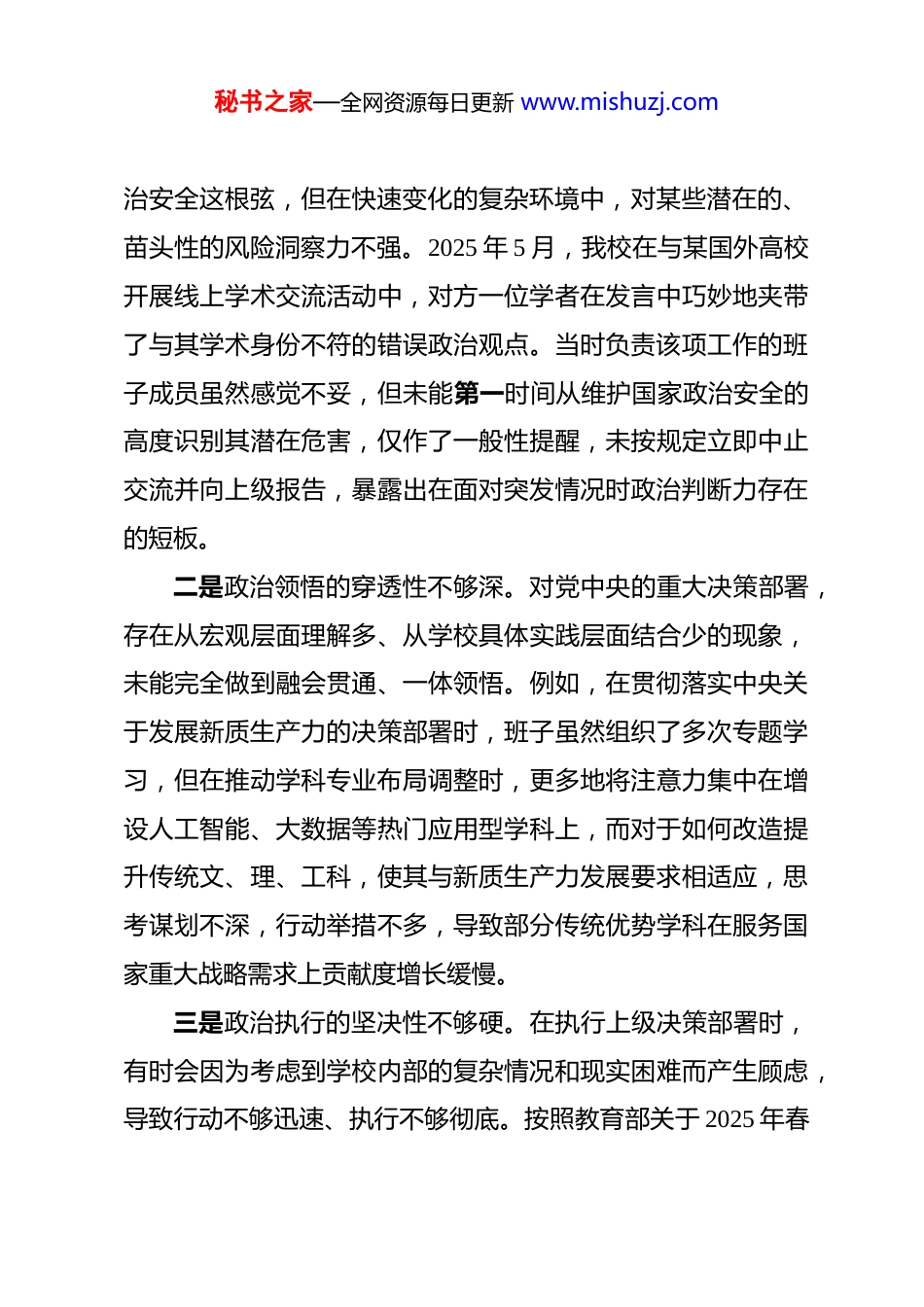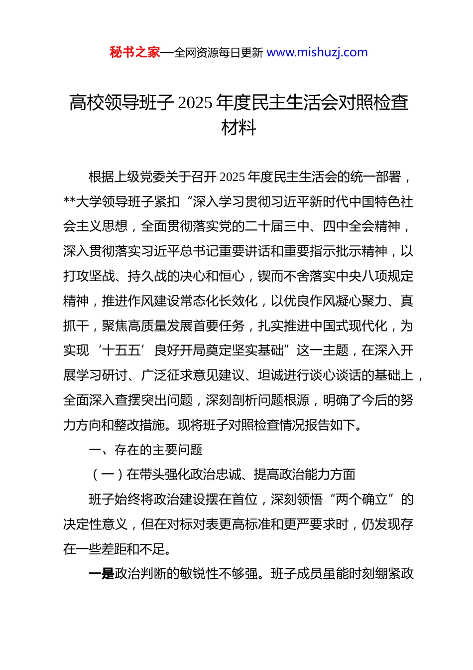 秘书之家—全网资源每日更新 www.mishuzj.com高校领导班子 2025 年度民主生活会对照检查材料 根据上级党委关于召开 2025 年度民主生活会的统一部署,**大学领导班子紧扣“深入学习贯彻习近平新时代中国特色社会主义思想,全面贯彻落实党的二十届三中、四中全会精神,深入贯彻落实习近平总书记重要讲话和重要指示批示精神,以打攻坚战、持久战的决心和恒心,锲而不舍落实中央八项规定精神,推进作风建设常态化长效化,以优良作风凝心聚力、真抓干,聚焦高质量发展首要任务,扎实推进中国式现代化,为实现‘十五五’良好开局奠定坚实基础”这一主题,在深入开展学习研讨、广泛征求意见建议、坦诚进行谈心谈话的基础上,全面深入查摆突出问题,深刻剖析问题根源,明确了今后的努力方向和整改措施。现将班子对照检查情况报告如下。一、存在的主要问题(一)在带头强化政治忠诚、提高政治能力方面班子始终将政治建设摆在首位,深刻领悟“两个确立”的决定性意义,但在对标对表更高标准和更严要求时,仍发现存在一些差距和不足。一是政治判断的敏锐性不够强。班子成员虽能时刻绷紧政秘书之家—全网资源每日更新 www.mishuzj.com治安全这根弦,但在快速变化的复杂环境中,对某些潜在的、苗头性的风险洞察力不强。2025 年 5 月,我校在与某国外高校开展线上学术交流活动中,对方一位学者在发言中巧妙地夹带了与其学术身份不符的错误政治观点。当时负责该项工作的班子成员虽然感觉不妥,但未能第一时间从维护国家政治安全的高度识别其潜在危害,仅作了一般性提醒,未按规定立即中止交流并向上级报告,暴露出在面对突发情况时政治判断力存在的短板。二是政治领悟的穿透性不够深。对党中央的重大决策部署,存在从宏观层面理解多、从学校具体实践层面结合少的现象,未能完全做到融会贯通、一体领悟。例如,在贯彻落实中央关于发展新质生产力的决策部署时,班子虽然组织了多次专题学习,但在推动学科专业布局调整时,更多地将注意力集中在增设人工智能、大数据等热门应用型学科上,而对于如何改造提升传统文、理、工科,使其与新质生产力发展要求相适应,思考谋划不深,行动举措不多,导致部分传统优势学科在服务国家重大战略需求上贡献度增长缓慢。三是政治执行的坚决性不够硬。在执行上级决策部署时,有时会因为考虑到学校内部的复杂情况和现实困难而产生顾虑,导致行动不够迅速、执行不够彻底。按照教育部关于 2025 年春秘书之家—全网资源每日更新 www.mishuzj.com季学期全面推进“大思政课”实践教学改革的要求,我校原定于 3 月份出台具体实施方案。但由于部分学院领导和资深教授对实践教学的场地、师资、安全保障等问题提出较多异议,班子在推进过程中未能果断决策,试图寻求“万全之策”,反复协调论证,致使方案直到 5 月底才正式印发,比预定时间推迟了近三个月,影响了改革的整体进度和先发优势。(二)在带头固本培元、增强党性方面班子高度重视理论武装和党性修养,但对照共产党人精神谱系和新时代好干部标准,仍感到在固本培元、锤炼党性上功夫下得不纯不透。一是理论学习系统融合不扎实。学习习近平新时代中国特色社会主义思想的整体性、关联性把握不强,存在一定的“碎片化”倾向。班子年度学习计划虽然涵盖了经济、政治、文化等各方面内容,但各专题之间缺乏有机的逻辑联系。比如,上半年学习“新发展理念”,下半年学习“高质量发展”,两个专题之间内在的递进关系和逻辑脉络未能进行深入阐释和关联学习,导致班子成员对中央精神的理解停留在“知其然”,而对“所以然”和“所以必然”的把握不深,理论学习成果向战略思维能力转化的效果不佳。二是价值观念改造主动性不扎实。在世界观、人生观、价秘书之家—全网资源每日更新 www.mishuzj.com值观这个“总开关”问题上,存在用事务性工作代替党性锻炼的倾向,自我净化、自我完善的意识有所减弱。个别班子成员在处理日常行政工作时,仍不自觉地带有“官本位”思想的痕迹,习惯于在办公室听汇报、作指示,而不是深入教学科研一线去发现问题、服务师生。在 2025 年度职称评审工作中,有班子成员对评审结果的...