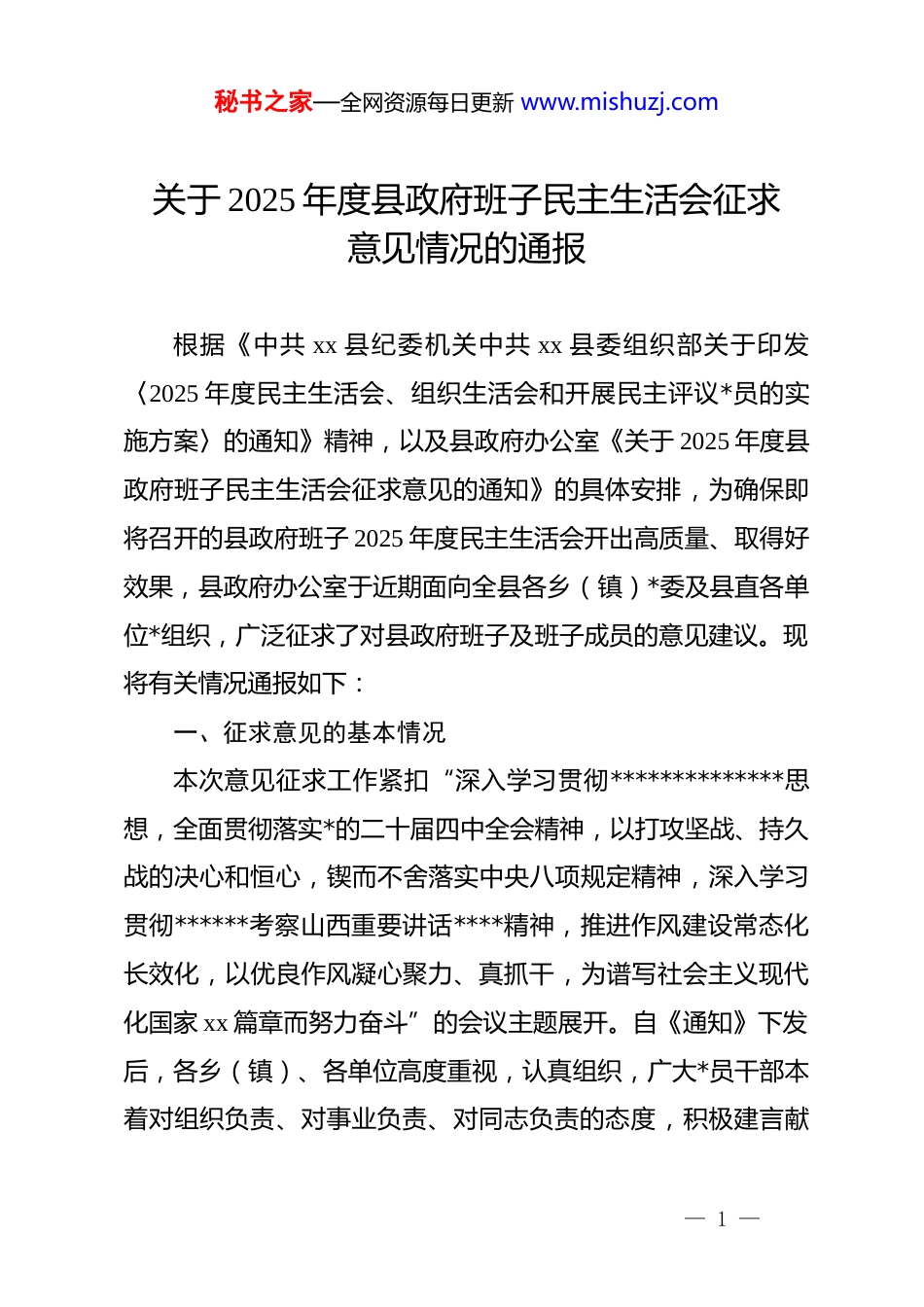 秘书之家—全网资源每日更新 www.mishuzj.com关于 2025 年度县政府班子民主生活会征求意见情况的通报根据《中共 xx 县纪委机关中共 xx 县委组织部关于印发〈2025 年度民主生活会、组织生活会和开展民主评议*员的实施方案〉的通知》精神,以及县政府办公室《关于 2025 年度县政府班子民主生活会征求意见的通知》的具体安排,为确保即将召开的县政府班子 2025 年度民主生活会开出高质量、取得好效果,县政府办公室于近期面向全县各乡(镇)*委及县直各单位*组织,广泛征求了对县政府班子及班子成员的意见建议。现将有关情况通报如下:一、征求意见的基本情况本次意见征求工作紧扣“深入学习贯彻**************思想,全面贯彻落实*的二十届四中全会精神,以打攻坚战、持久战的决心和恒心,锲而不舍落实中央八项规定精神,深入学习贯彻******考察山西重要讲话****精神,推进作风建设常态化长效化,以优良作风凝心聚力、真抓干,为谱写社会主义现代化国家 xx 篇章而努力奋斗”的会议主题展开。自《通知》下发后,各乡(镇)、各单位高度重视,认真组织,广大*员干部本着对组织负责、对事业负责、对同志负责的态度,积极建言献— 1 —秘书之家—全网资源每日更新 www.mishuzj.com策。根据通知要求,本次意见征求的截止日期为 2026 年 2 月 2日。截至规定日期,县政府办公室通过线下报送和线上邮箱等渠道,顺利完成了意见征求的收集工作。从征求情况看,各单位参与度高,反馈渠道畅通,征求到的意见建议内容广泛、分析深刻、切中要害,充分体现了实事求是、客观公正的原则,为县政府班子深入查摆问题、开展批评与自我批评、明确整改方向奠定了坚实基础。二、意见建议的梳理汇总情况县政府办公室对收集到的意见建议进行了系统梳理和归纳分析。总的来看,全县广大*员干部群众对县政府班子过去一年的工作是充分肯定的,认为县政府班子能够团结带领全县人民,在经济发展、社会稳定、民生改善等方面取得了显著成绩。同时,也围绕通知中明确的 5 个重点方面,提出了许多中肯的意见和建议。(一)对县政府班子的总体意见建议梳理发现,对县政府班子的意见建议主要集中在加强宏观谋划、深化作风建设、提升治理效能和狠抓工作落实等方面。大家普遍希望县政府班子能进一步解放思想、开拓创新,在推动全县经济社会高质量发展上拿出更硬举措、务求更大实效;— 2 —秘书之家—全网资源每日更新 www.mishuzj.com建议进一步精文减会,改进会风文风,把更多时间和精力投入到深入基层、解决实际问题中去;同时,希望加强对重大决策部署的跟踪问效和督查督办,确保各项工作落地生根、开花结果。(二)对照 5 个重点方面的具体意见建议1.在带头强化政治忠诚、提高政治能力方面:部分意见建议,希望县政府班子进一步加强理论学习的系统性和深度,特别是对**************思想和*的二十届四中全会精神的理解和把握,做到学思用贯通、知信行统一。建议增加集体学习和专题研讨的频次,强化学习成果转化,切实提高从政治上看问题、办事情的能力,确保中央和省市的各项决策部署在 xx 不折不扣得到落实。2.在带头固本培元、增强*性方面:有意见指出,希望班子成员能更多地以普通*员身份参加所在支部的组织生活,带头开展严肃认真的批评和自我批评。建议进一步加强*性锻炼,无论在任何时候、任何情况下,都能做到对*绝对忠诚,坚守共产*人的精神家园。3.在带头敬畏人民、敬畏组织、敬畏法纪方面:意见建议集中体现在密切联系群众和服务群众上。有干部群众反映,希望班子成员能进一步加大深入基层调研的力度,多采取“四不— 3 —秘书之家—全网资源每日更新 www.mishuzj.com两直”方式,察实情、听实话、办实事。建议进一步畅通群众诉求表达渠道,完善民意收集和反馈机制用心用情解决好群众在教育、医疗、养老、就业等领域的急难愁盼问题,不断增强人民群众的获得感、幸福感和安全感。4.在带头干事创业、担当作为方面:这是本次征求意见中内容最为集中的方面。部分意见尖锐地指出,形式主义、官僚主义在一些领域和工作中仍不同程度存在,存在“慵懒无为”和担当精神不足的现象。建...